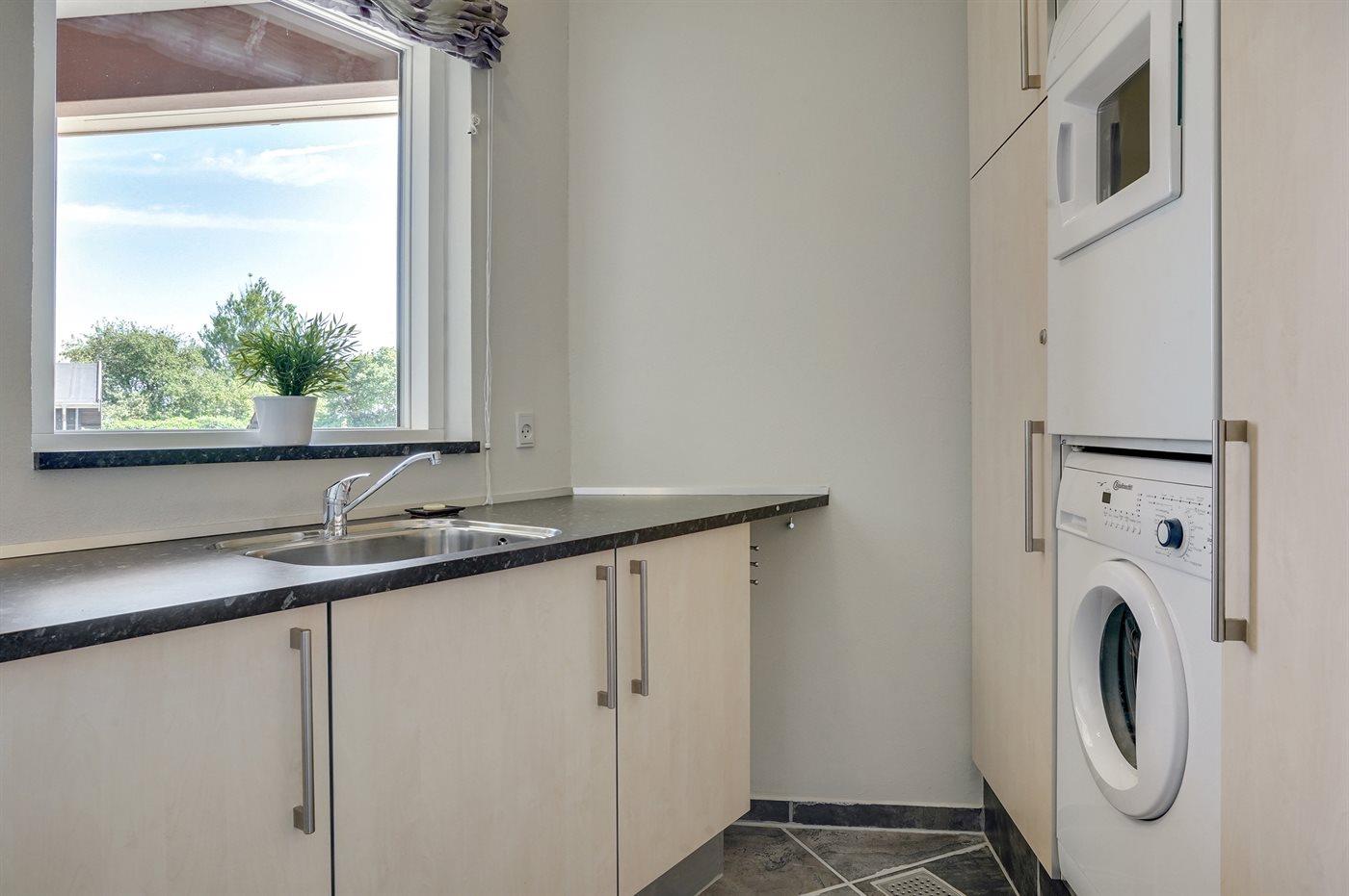 Køkkenet er udstyret med 1 køleskab. Der er 4 keramiske kogeplader, bageovn, mikrobølgeovn samt opvaskemaskine.