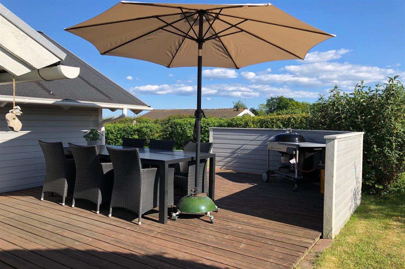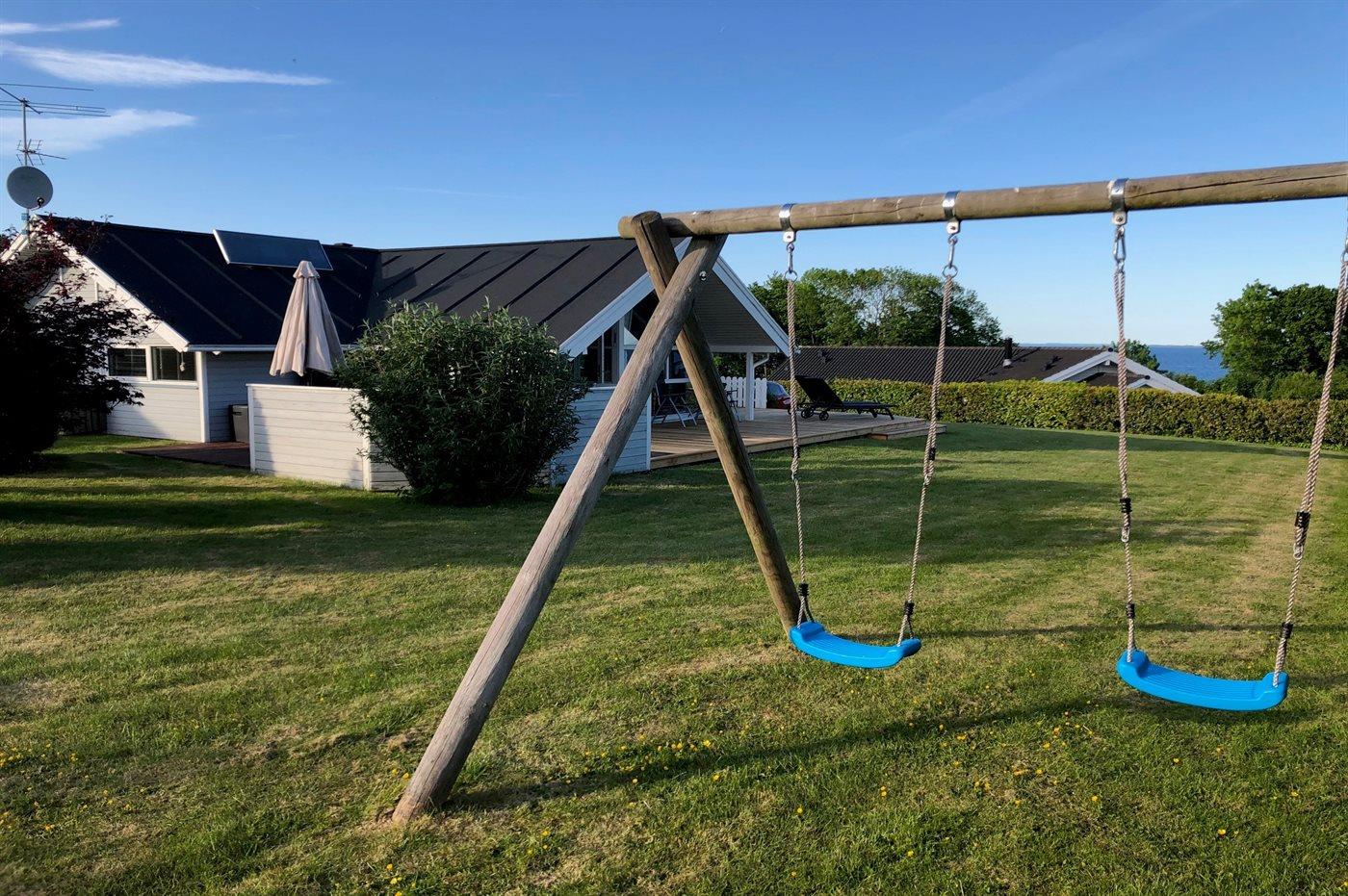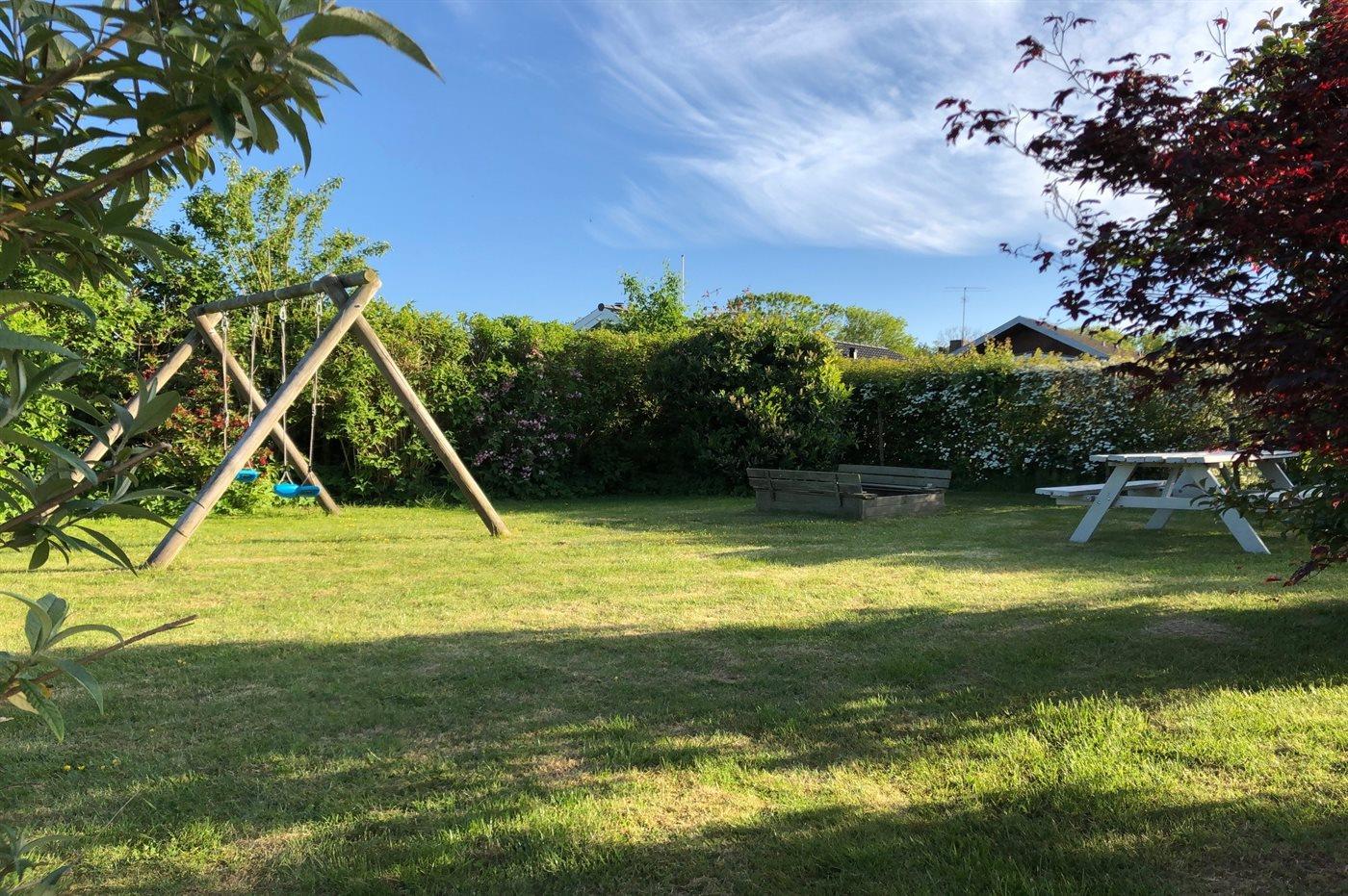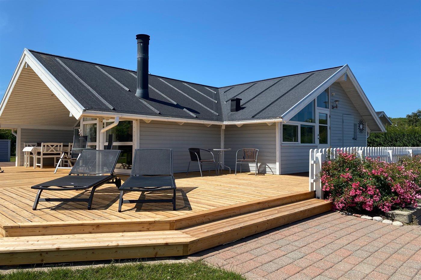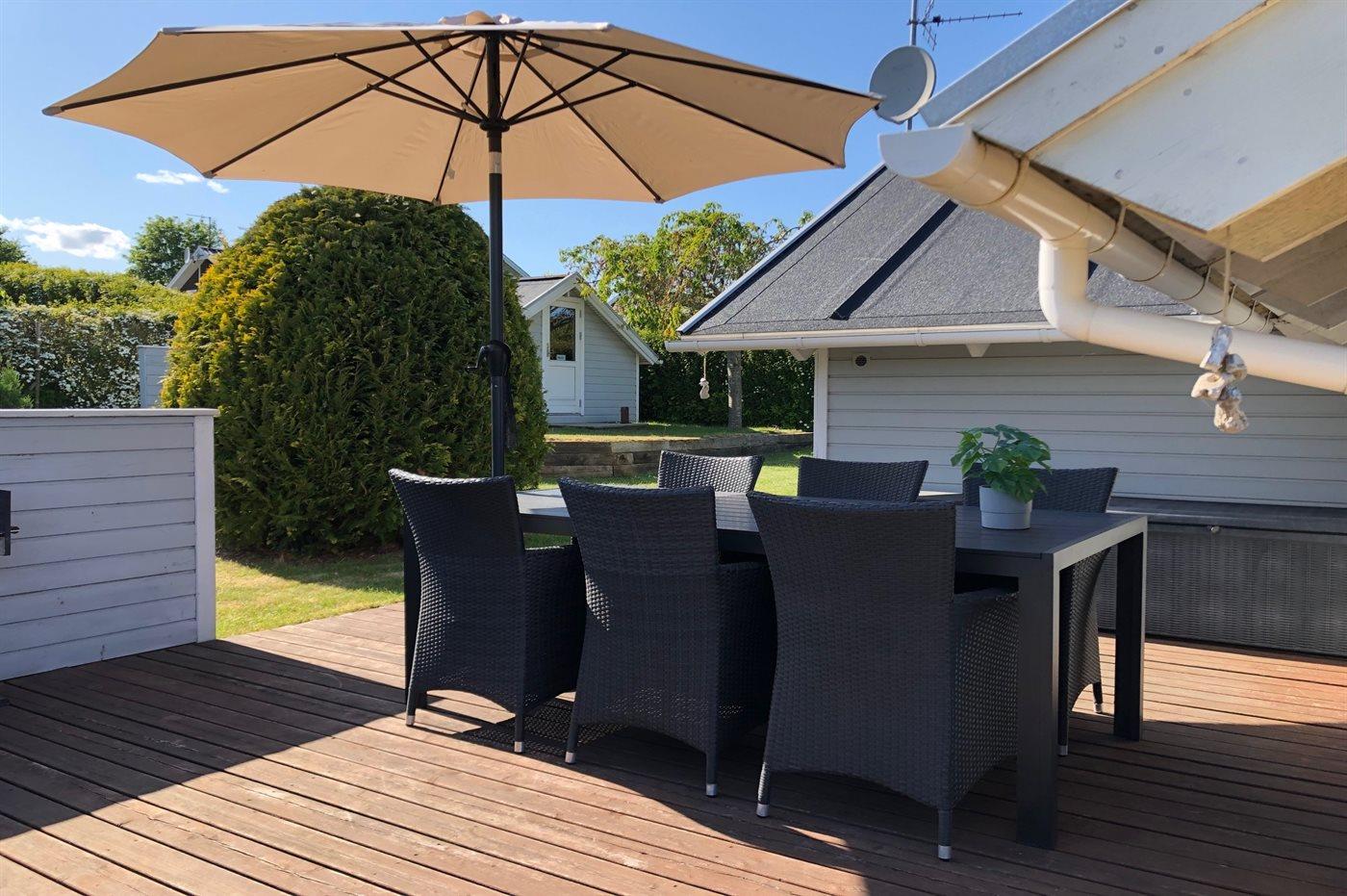 Ferieboligen er beliggende på en 1100 m² stor havegrund. Der er 200 m til havet. Nærmeste forretning er beliggende i en afstand af 5000 m. Til ferieboligen hører 60 m² terrasseareal. Desuden er der 12 m² overdækket terrasse. Der er redskabsrum. Gynge. Sandkasse. Grill til rådighed. Parkering ved ferieboligen.