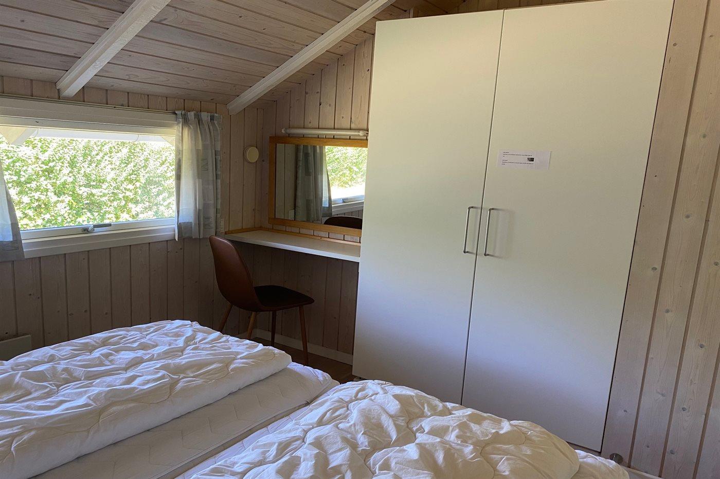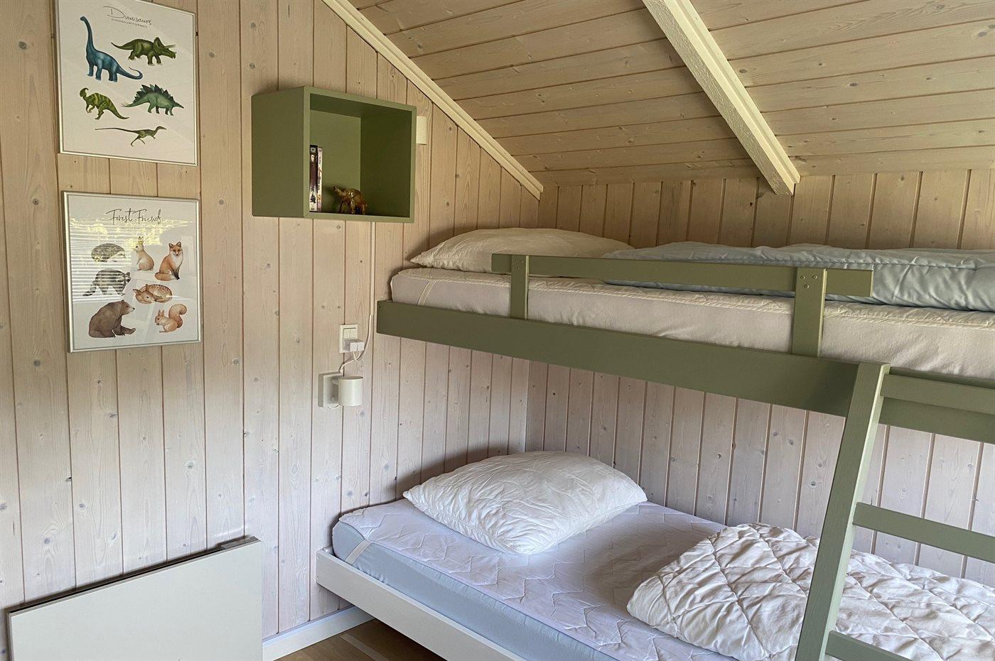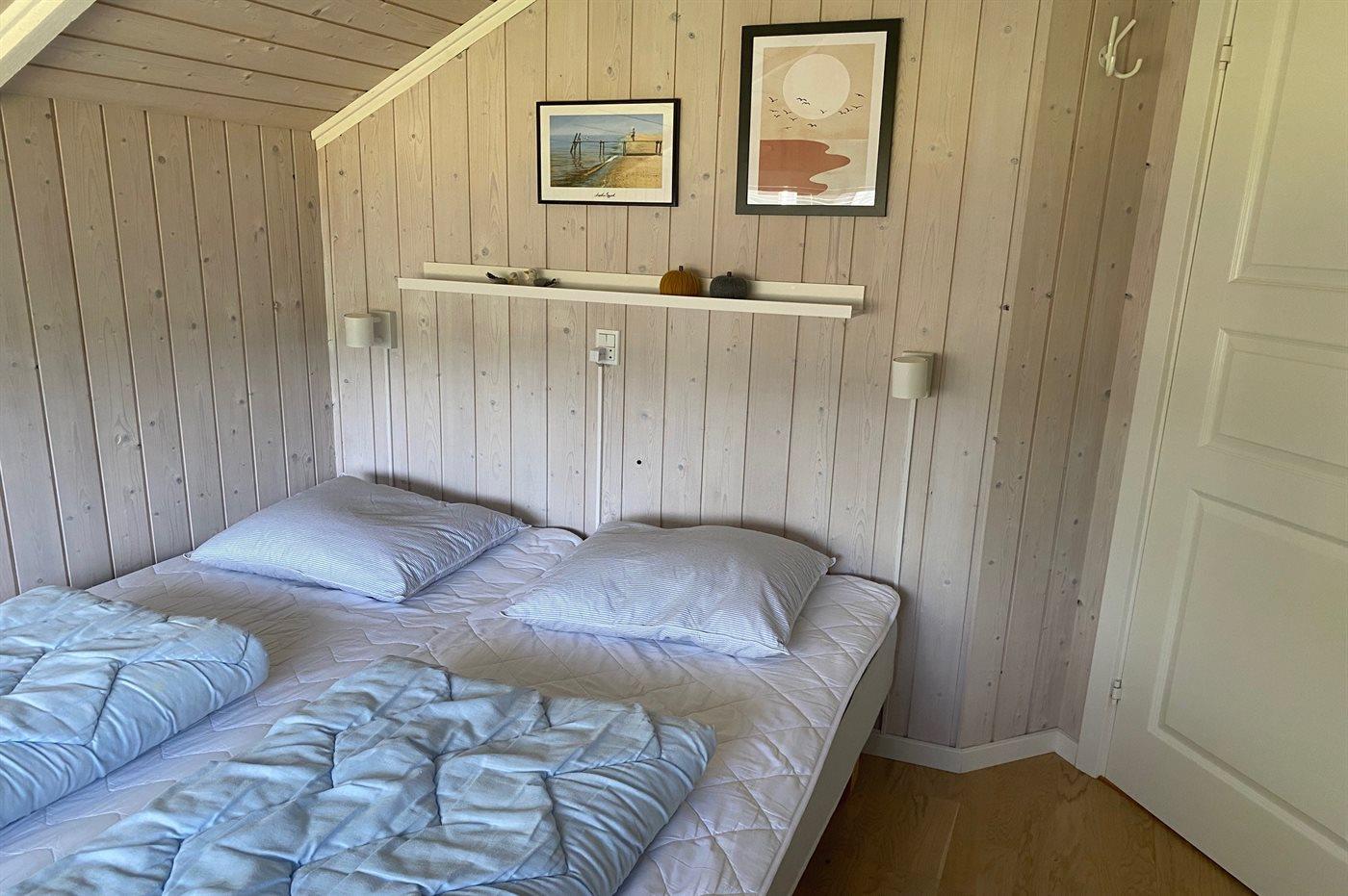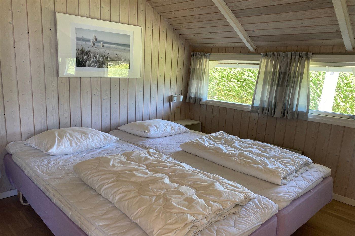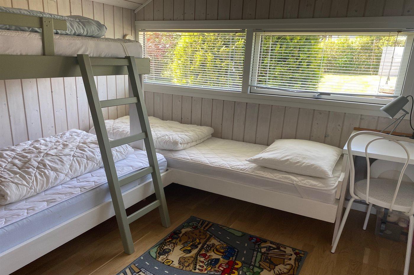 Der er i alt 3 soveværelser. Sovepladserne fordeler sig på: 4 sovepladser i dobbeltsenge. 1 soveplads i enkeltseng. 2 sovepladser i køjeseng. Derudover er der 1 stk. barneseng.