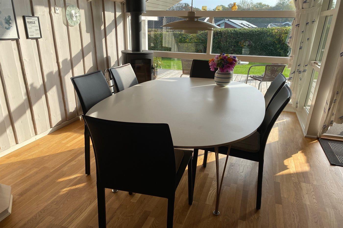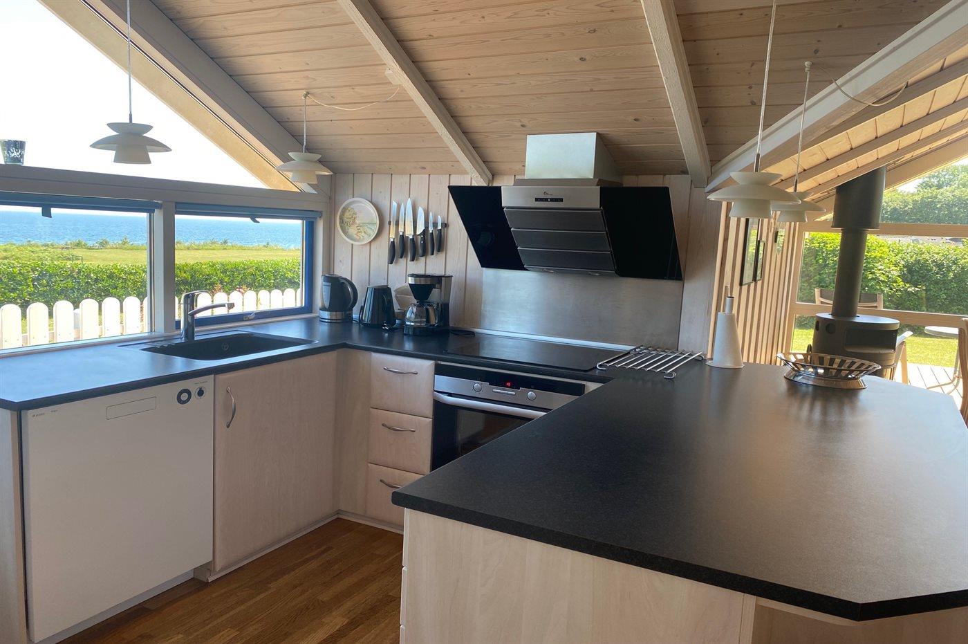 Køkkenet er udstyret med 1 køleskab. Der er 4 keramiske kogeplader, varmluftovn, mikrobølgeovn samt opvaskemaskine.
