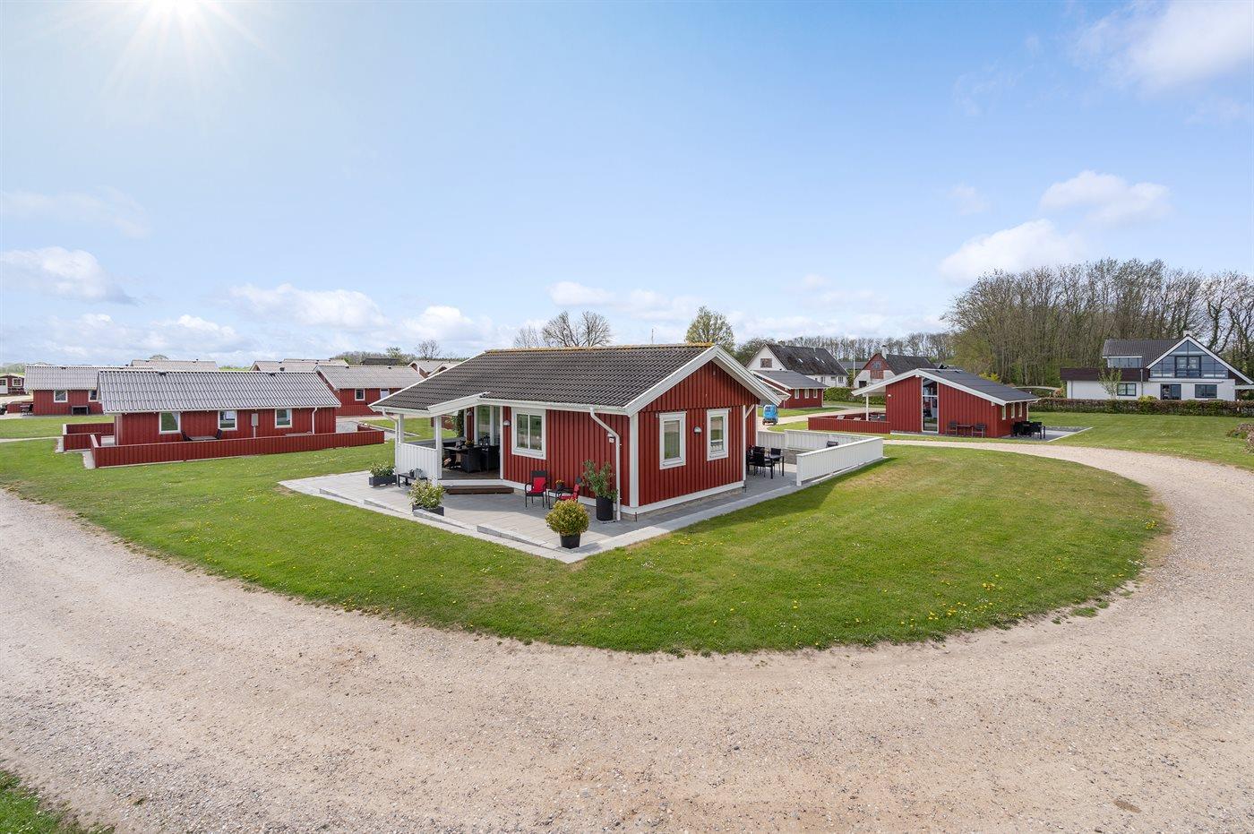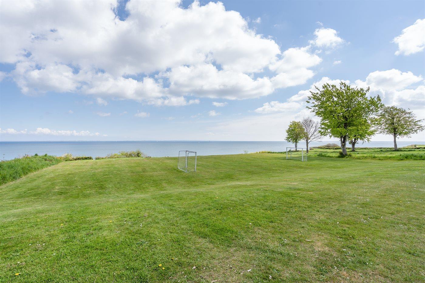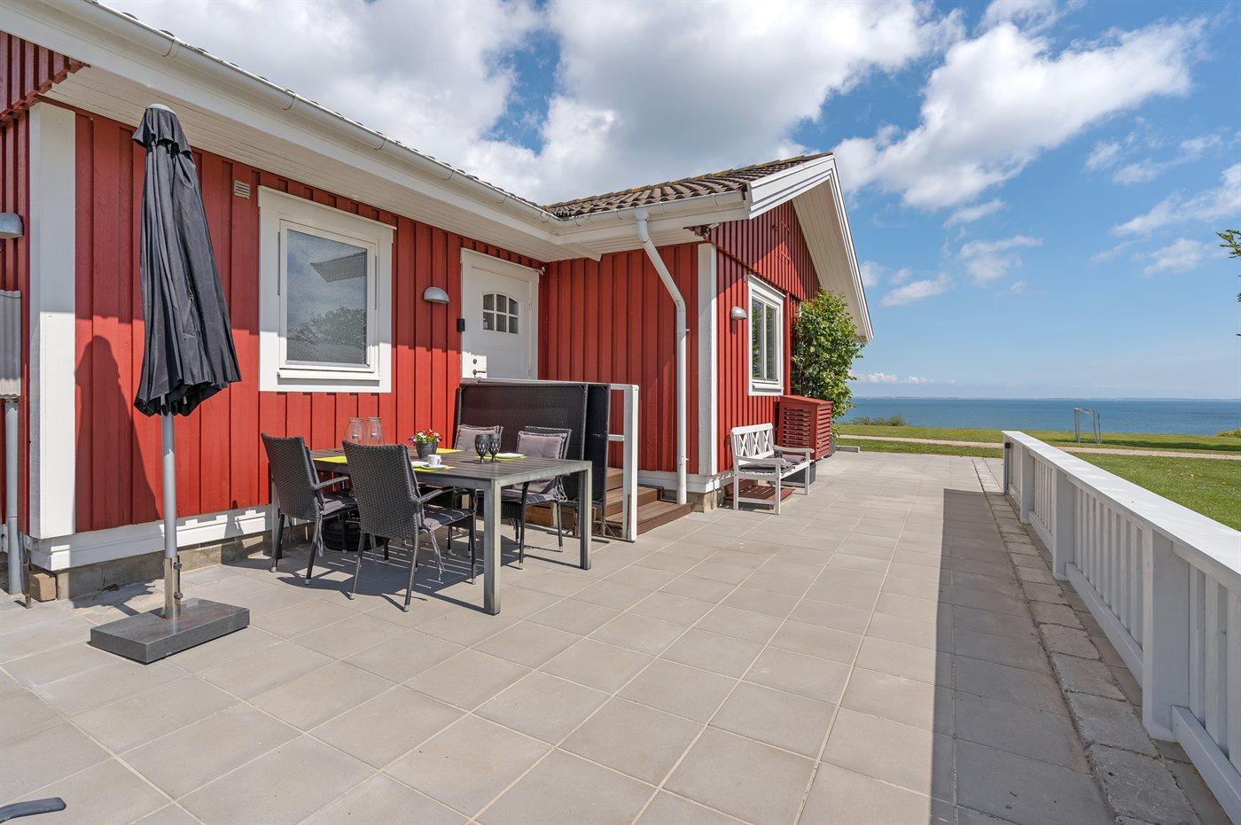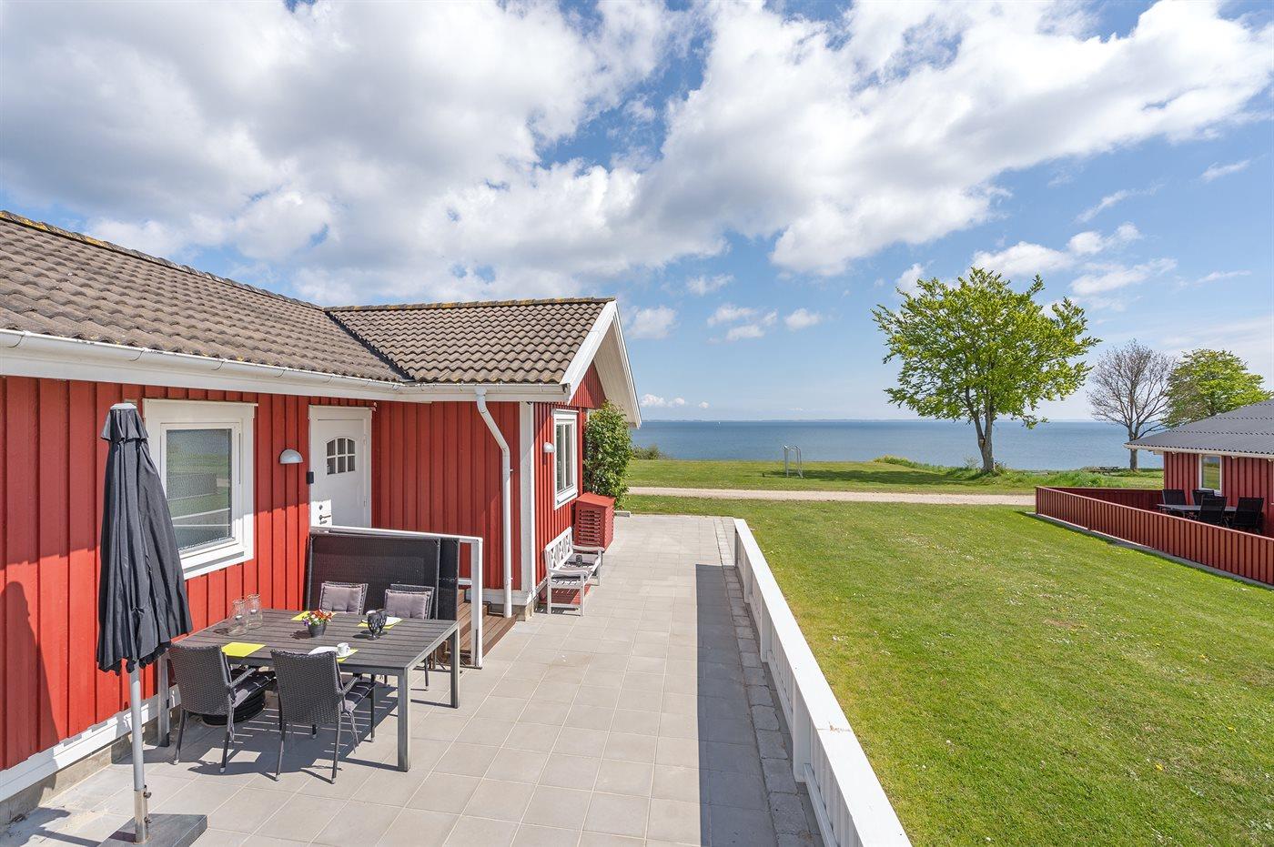 Dette pæne sommerhus ligger med enestående udsigt - ca. 100 meter fra stranden. Huset er løbende moderniseret og fremstår pænt og lyst. Der findes såvel åbne som overdækkede terrasser, alle med havudsigt. Huset ligger på et fællesareal, og foran huset findes der et stort friareal med græs, fodboldbane, bålplads, legeplads og trappe ned til vandet, hvor der er en ny badebro.