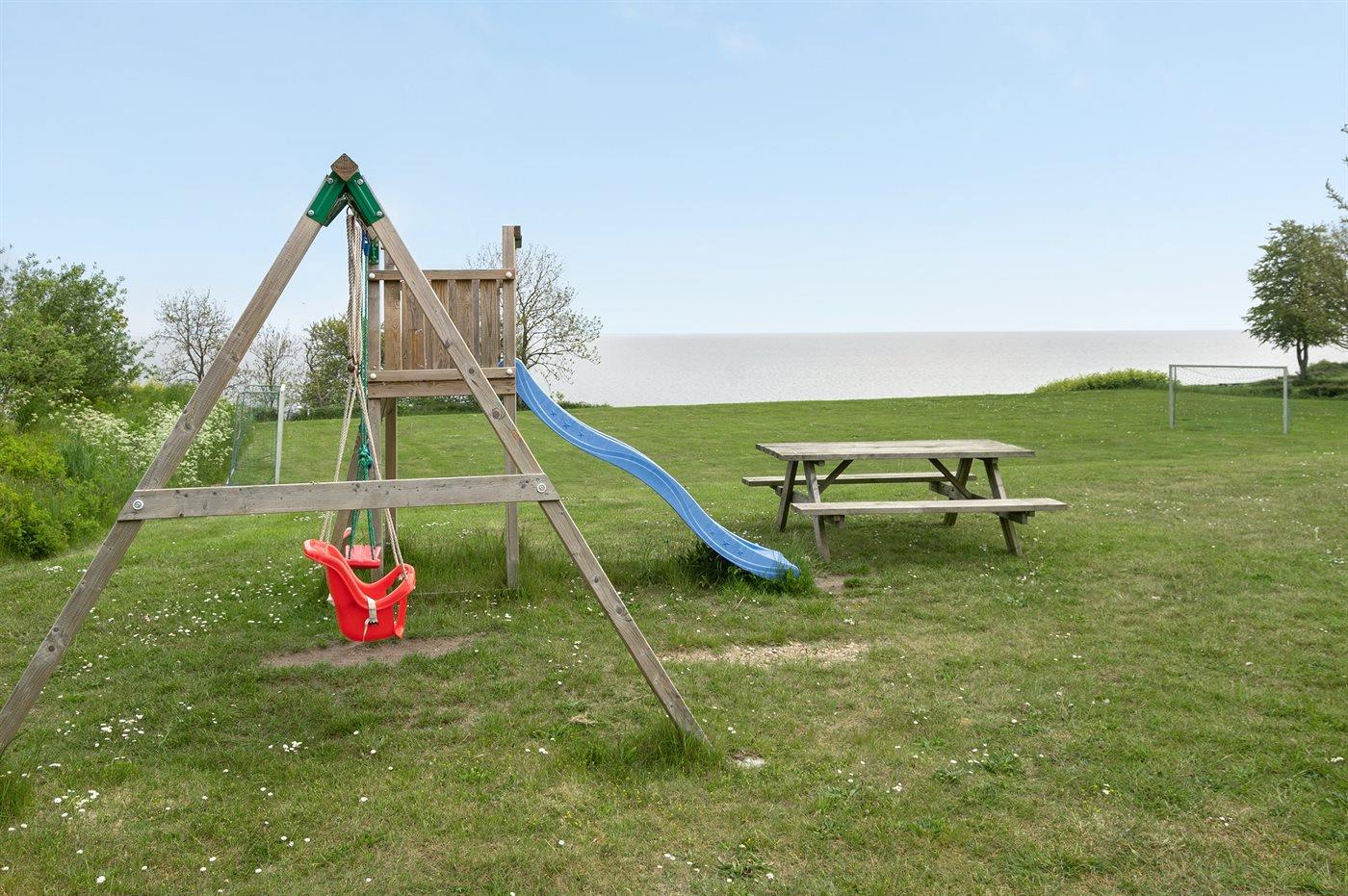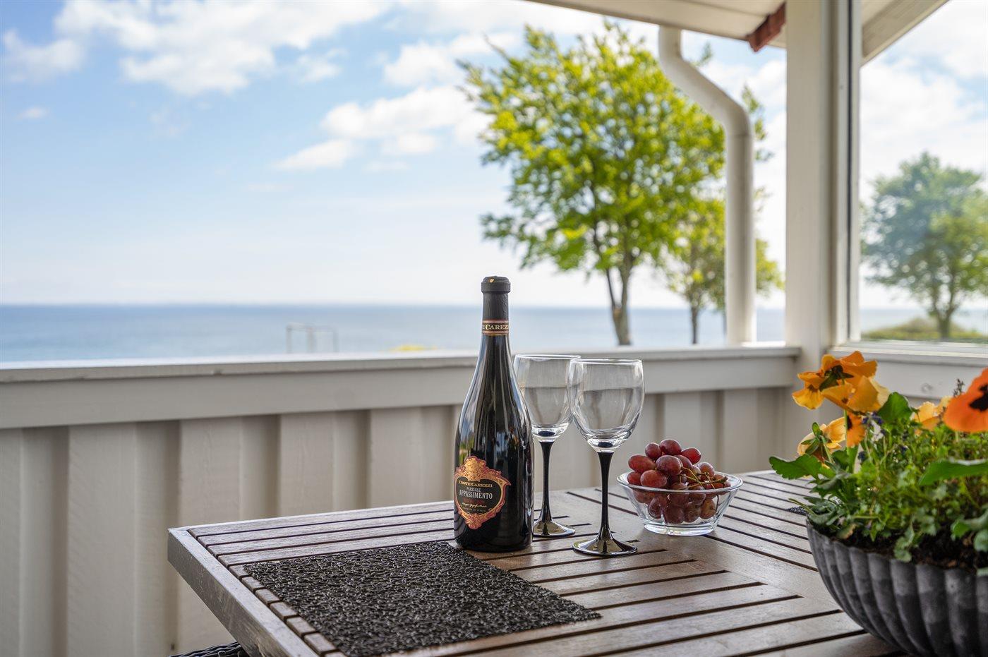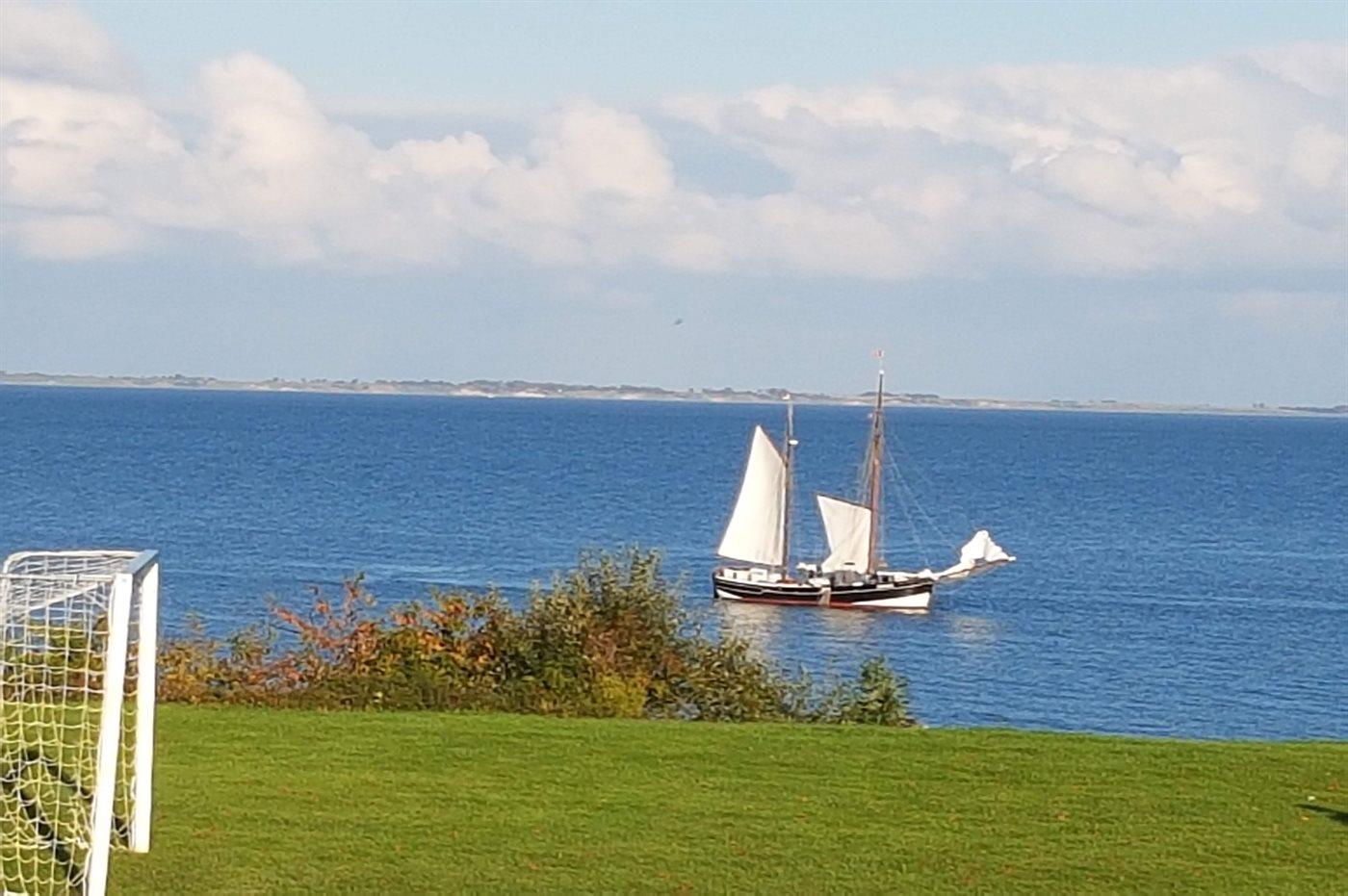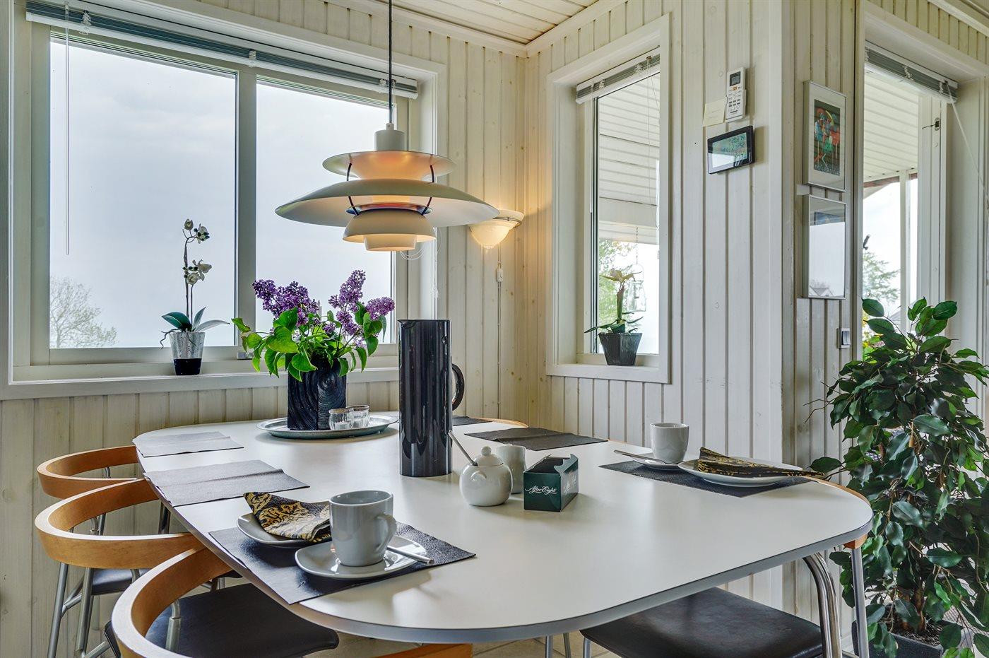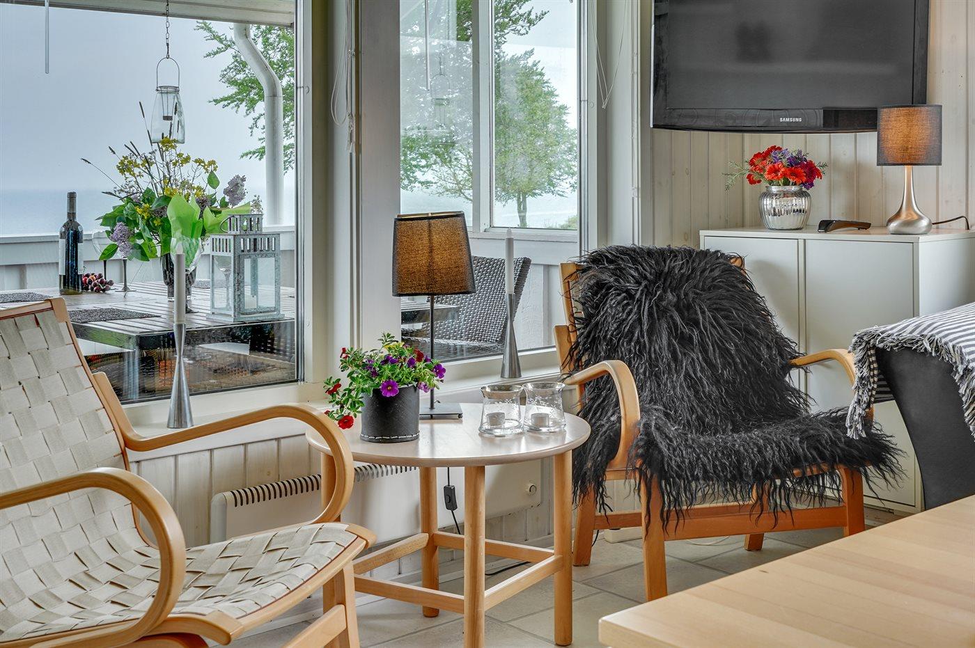 Dette pæne sommerhus ligger med enestående udsigt - ca. 100 meter fra stranden. Huset er løbende moderniseret og fremstår pænt og lyst. Der findes såvel åbne som overdækkede terrasser, alle med havudsigt. Huset ligger på et fællesareal, og foran huset findes der et stort friareal med græs, fodboldbane, bålplads, legeplads og trappe ned til vandet, hvor der er en ny badebro.
