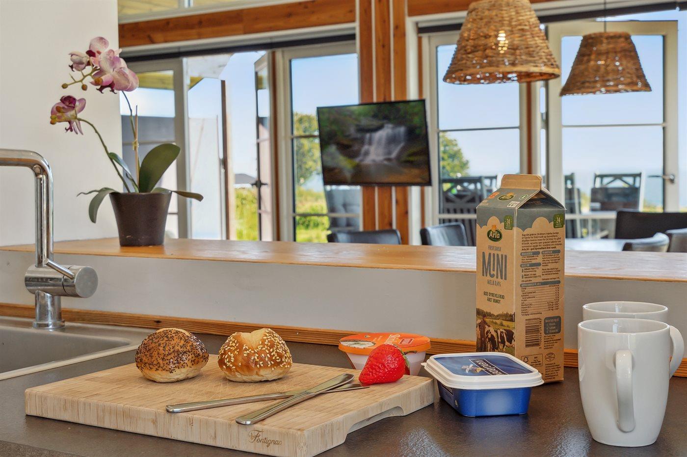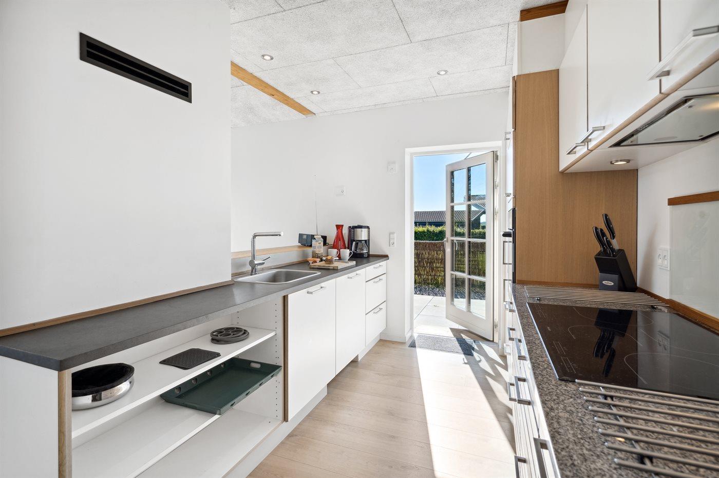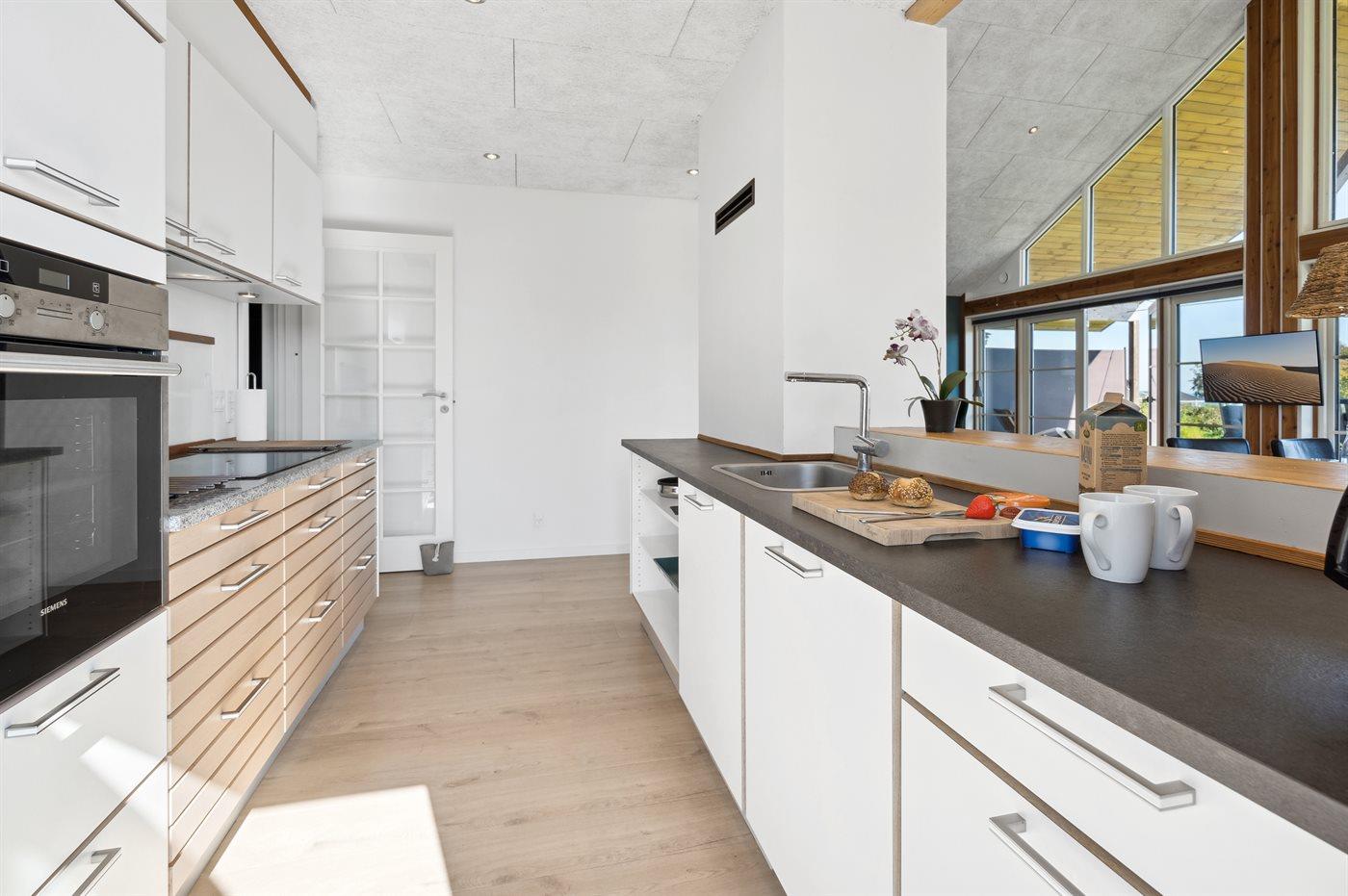 Køkkenet er udstyret med 1 køleskab. Der er 4 induktionskogeplader, varmluftovn, mikrobølgeovn samt opvaskemaskine.