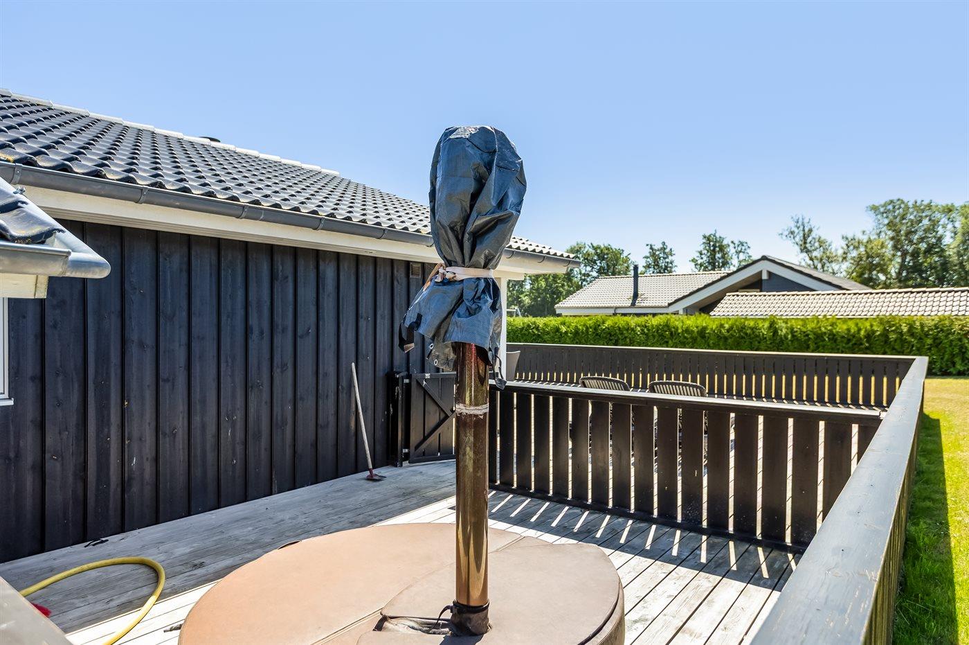 Ferieboligen er beliggende på en 1050 m² stor havegrund. Der er 400 m til havet. Der er en badebro i nærheden. Nærmeste forretning er beliggende i en afstand af 4000 m. Der er en golfbane i en afstand af 14000 m. Til ferieboligen hører åbent terrasseareal. Desuden er der overdækket terrasse. Der er redskabsrum. Der ligger en legeplads i en afstand af 500 m. Grill til rådighed. Parkering ved ferieboligen.