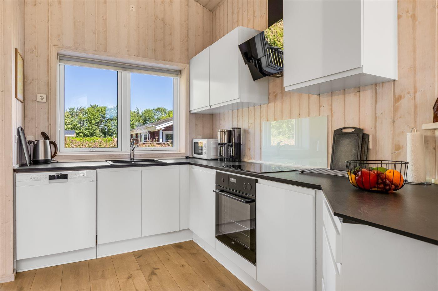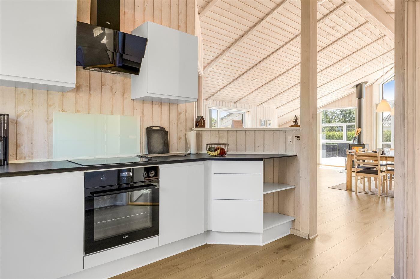 Køkkenet er udstyret med 1 køleskab. Der er 4 induktionskogeplader, varmluftovn, mikrobølgeovn samt opvaskemaskine.