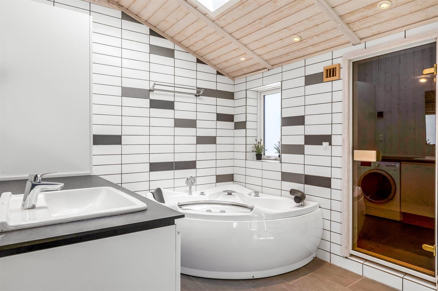 Der er 1 badeværelse med bruseniche og 1 toilet.. Der er gulvvarme på 1 badeværelse. I saunaen er der mulighed for afslapning.