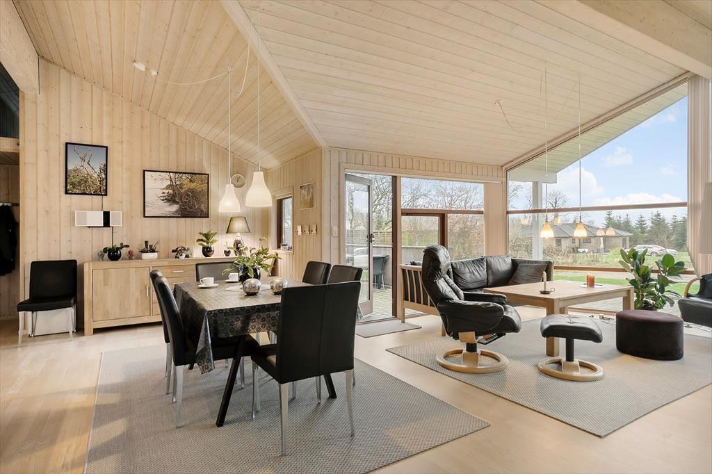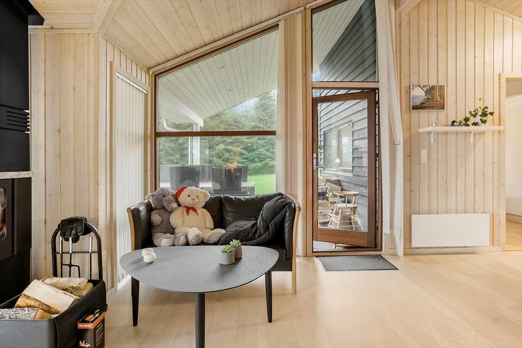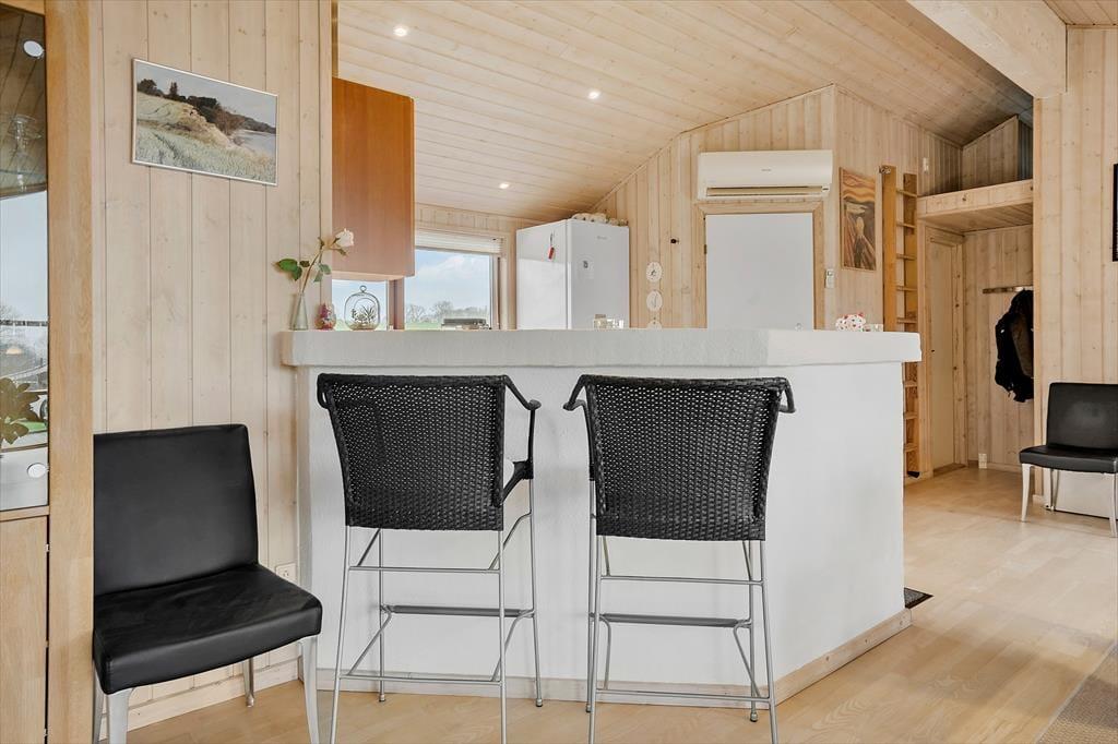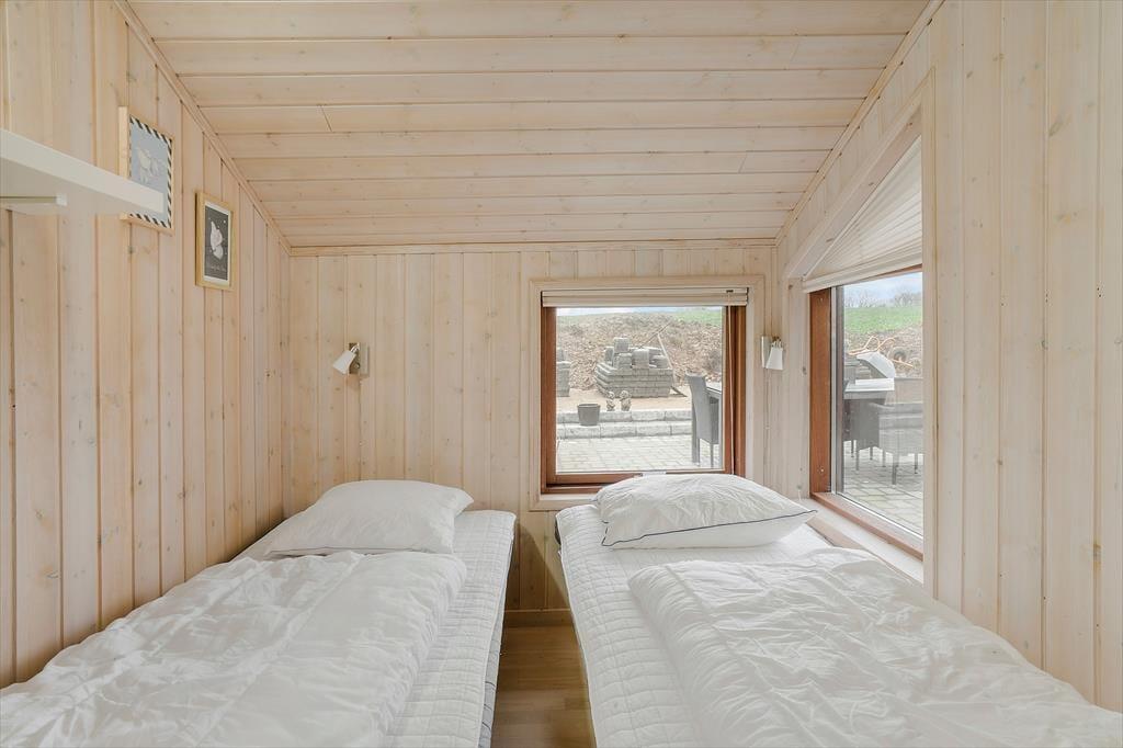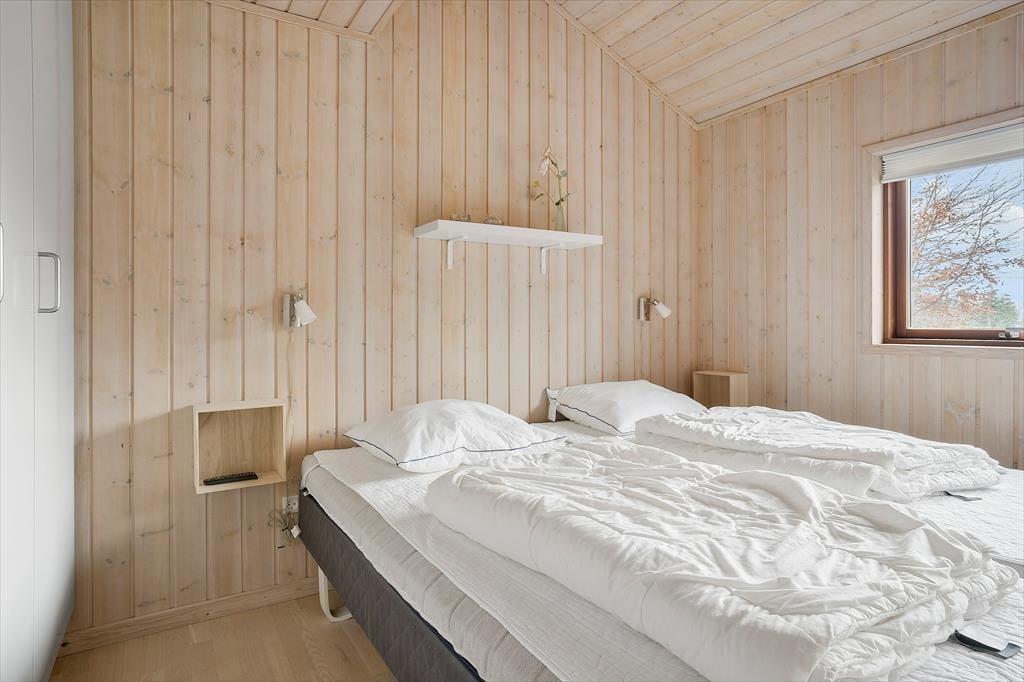 Dette sommerhus fra 2009 er indrettet med et stort åbent køkken i forbindelse med spisestue og stue. I stuen kan man få ekstra hygge ved at tænde op i husets brændeovn. Der er 3 soveværelser - 1 værelse med 2 enkeltsenge og 2 værelser med en dobbeltseng i hvert. Desuden er der 2 badeværelser, det ene med et spabad. I husets bryggers er der en vaskesøjle med vaskemaskine og tørretumbler.