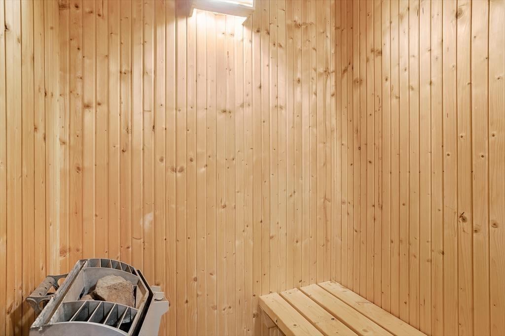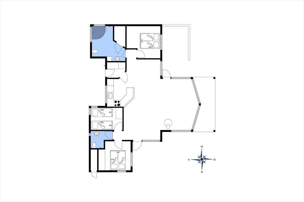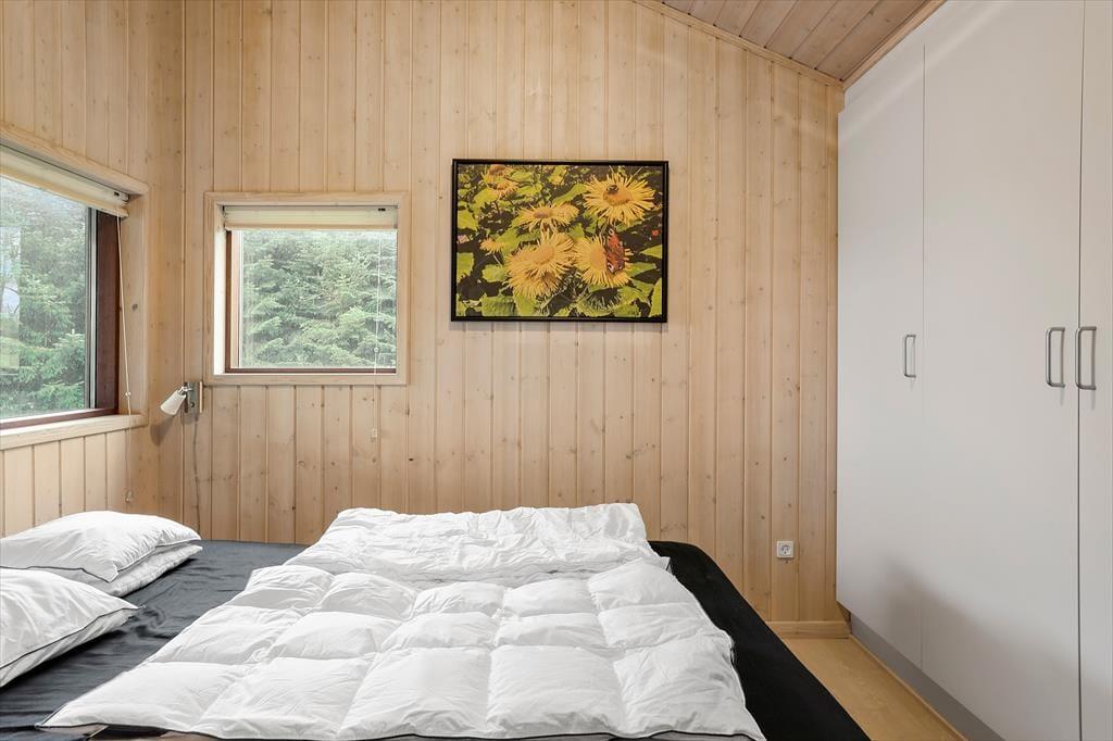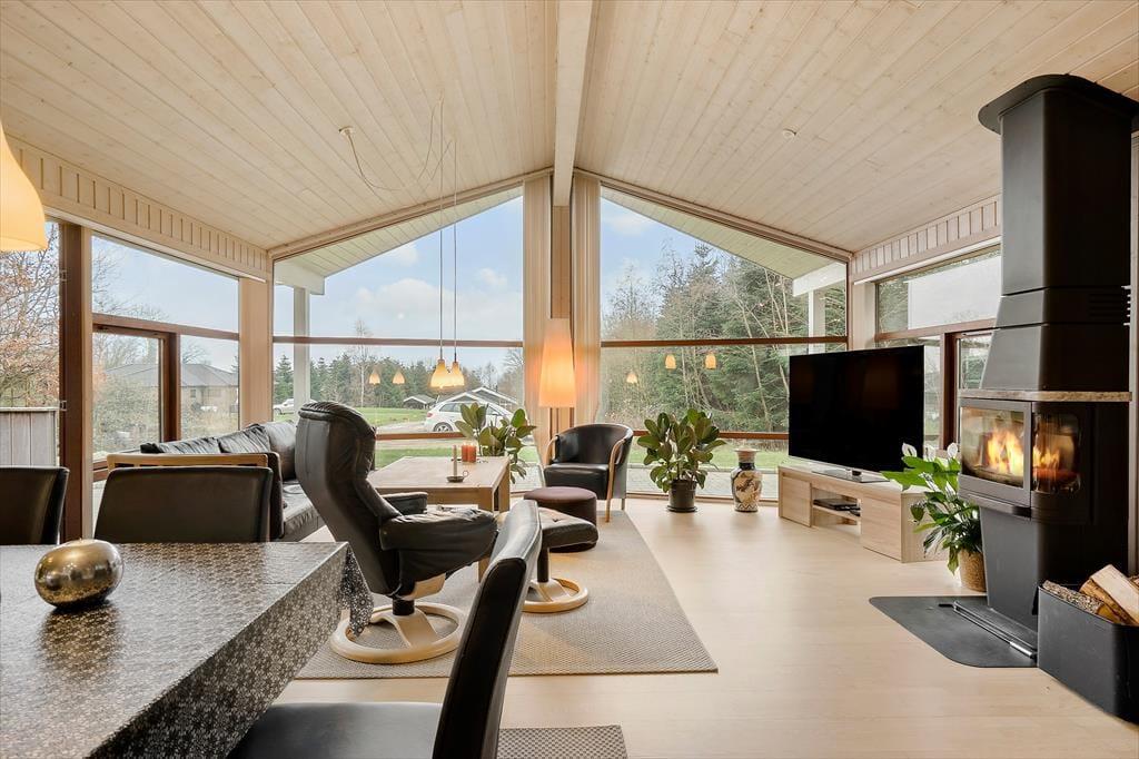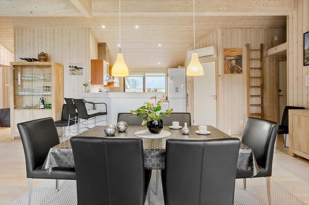 Dette sommerhus fra 2009 er indrettet med et stort åbent køkken i forbindelse med spisestue og stue. I stuen kan man få ekstra hygge ved at tænde op i husets brændeovn. Der er 3 soveværelser - 1 værelse med 2 enkeltsenge og 2 værelser med en dobbeltseng i hvert. Desuden er der 2 badeværelser, det ene med et spabad. I husets bryggers er der en vaskesøjle med vaskemaskine og tørretumbler.