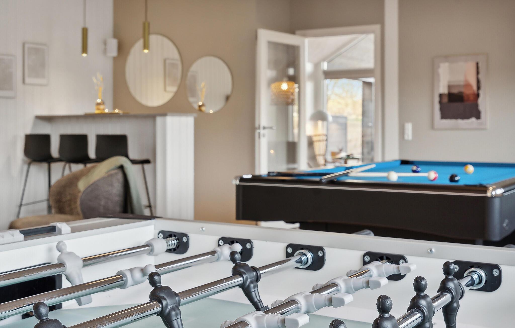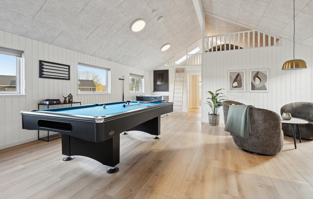 Lad jer forkæle med de bedste faciliteter i dette rummelige og smagfuldt indrettede feriehus. Spil billard, snup en dyst ved bordfodboldbordet eller forkæl jer selv med en afslappende pause i saunaen eller den opvarmede indendørspool. Samles til fælles måltider i den stilfulde stemning i spisepladsen og organiser spændende filmaftener i den indbydende stue.