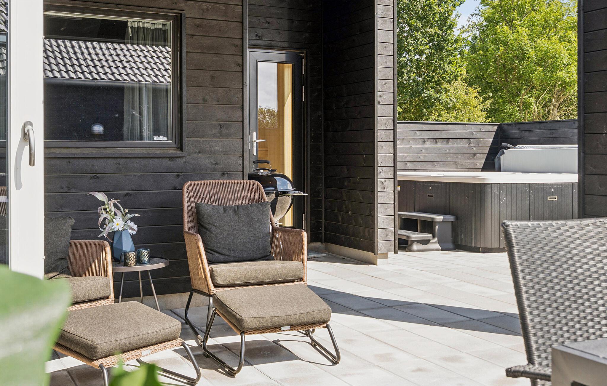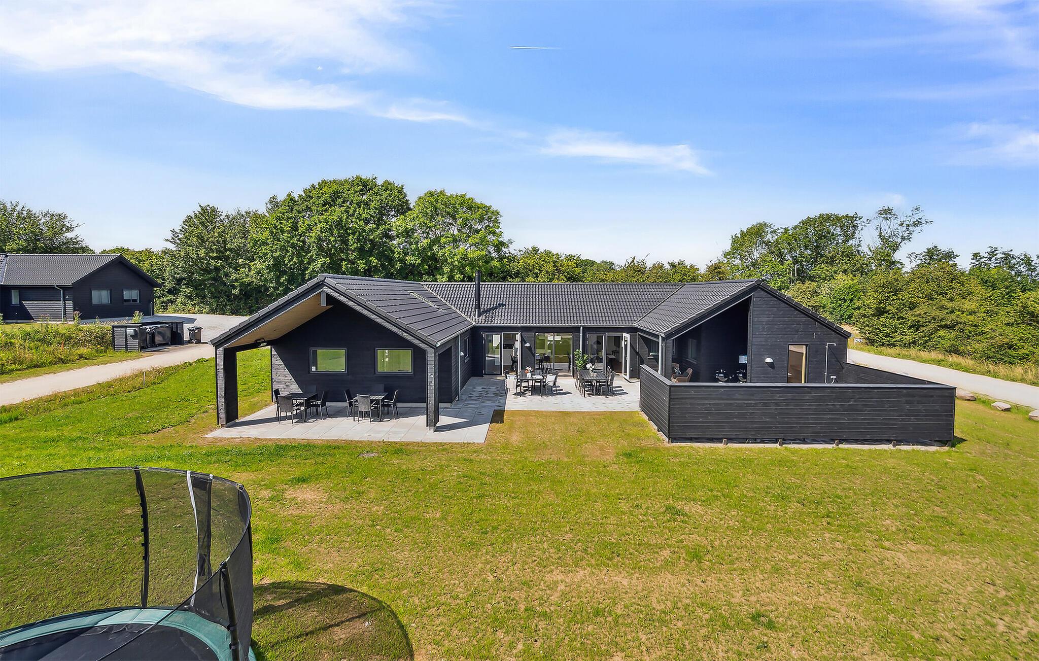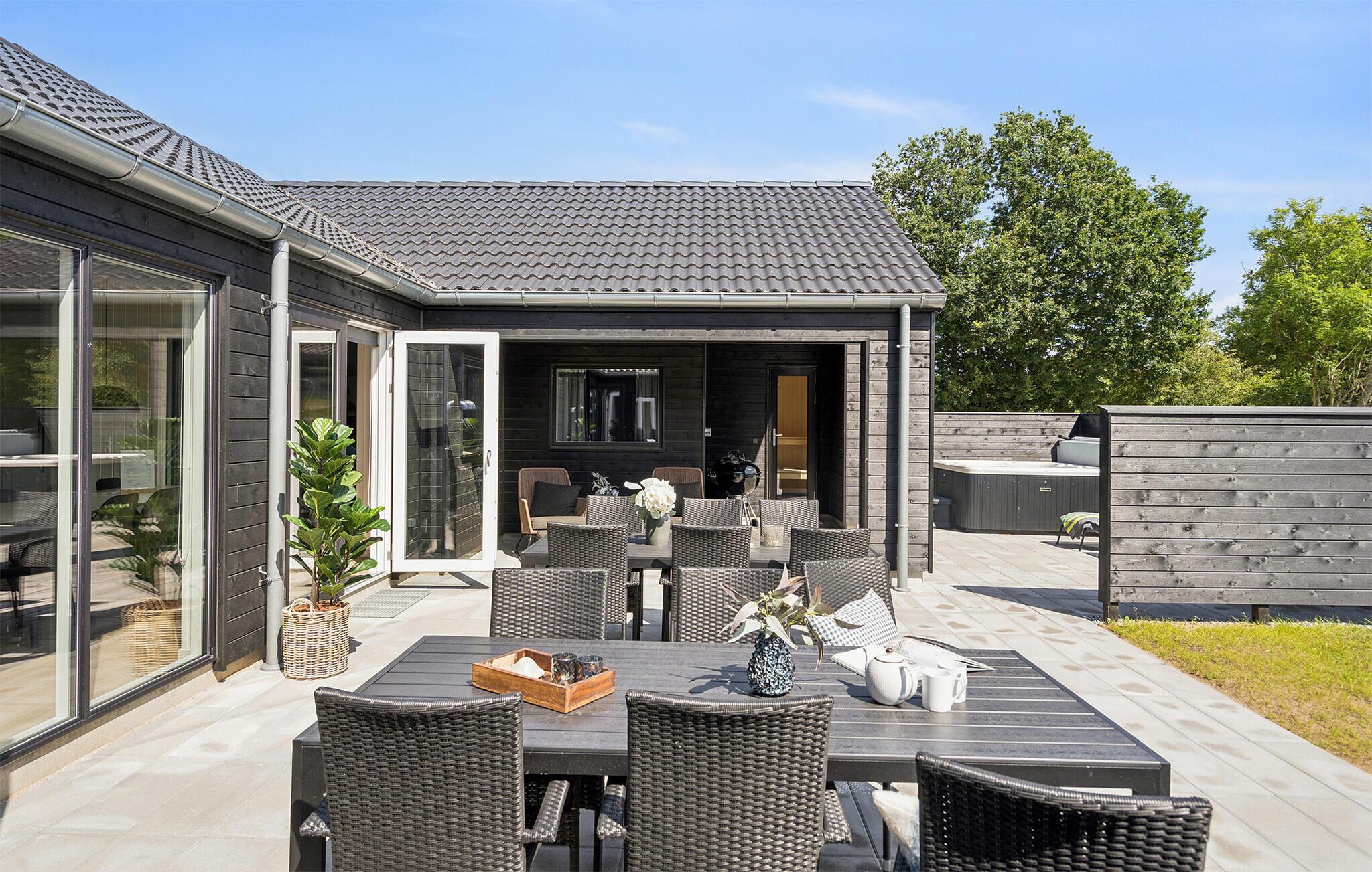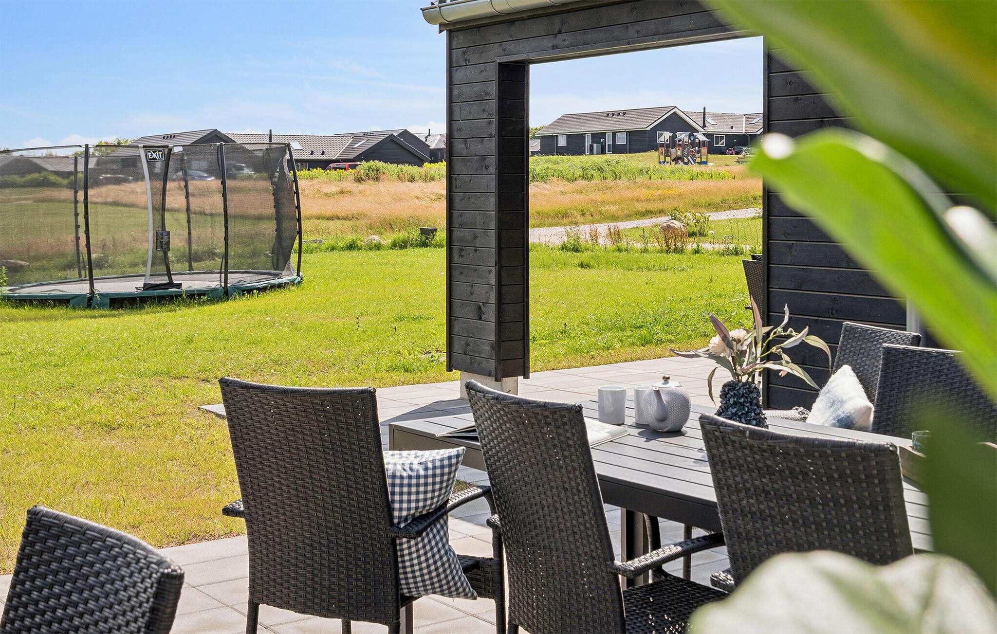 Udenfor indbyder den store terrasse til hyggestunder. Nyd dagens måltider udendørs, slap af i solen eller træk jer tilbage med en bog. Børnene kan se frem til en trampolin i haven. For øjeblikke med velvære er der et spabad til rådighed, oplagt til at afslappe krop og sind.