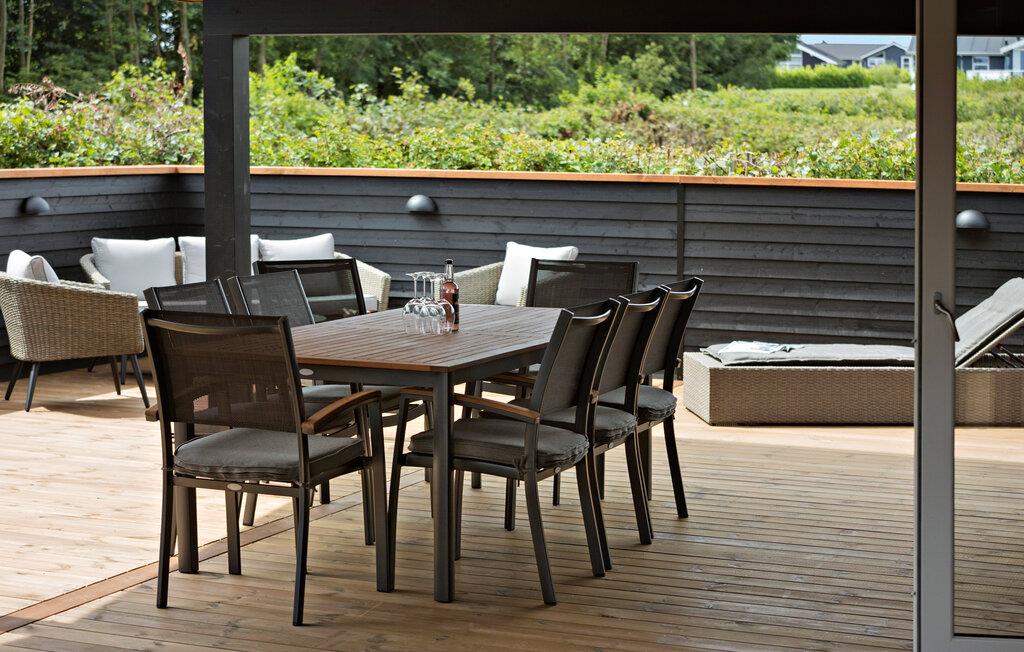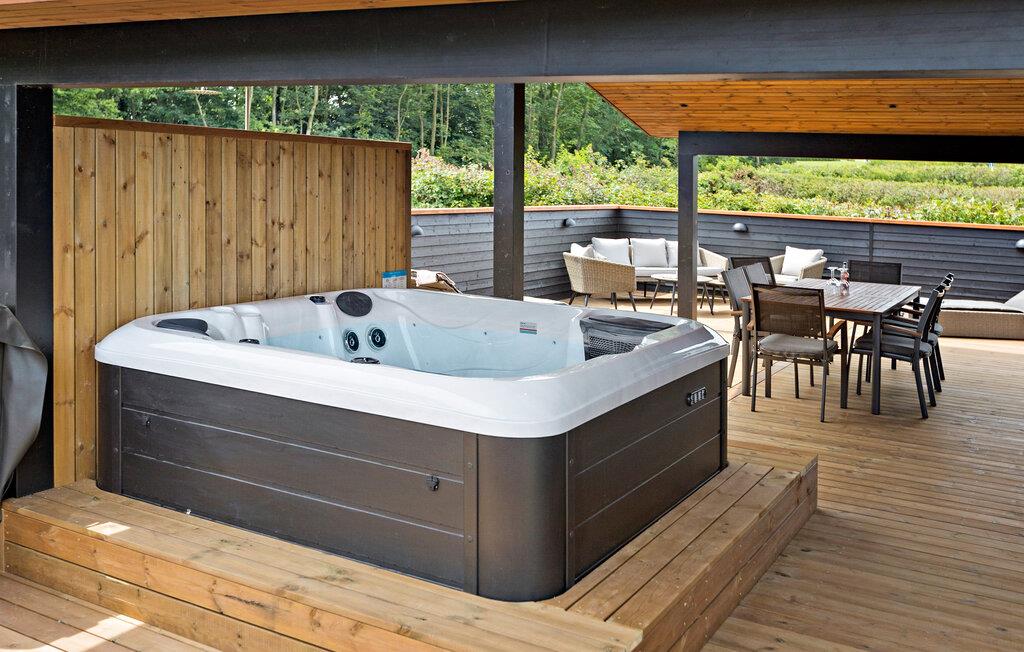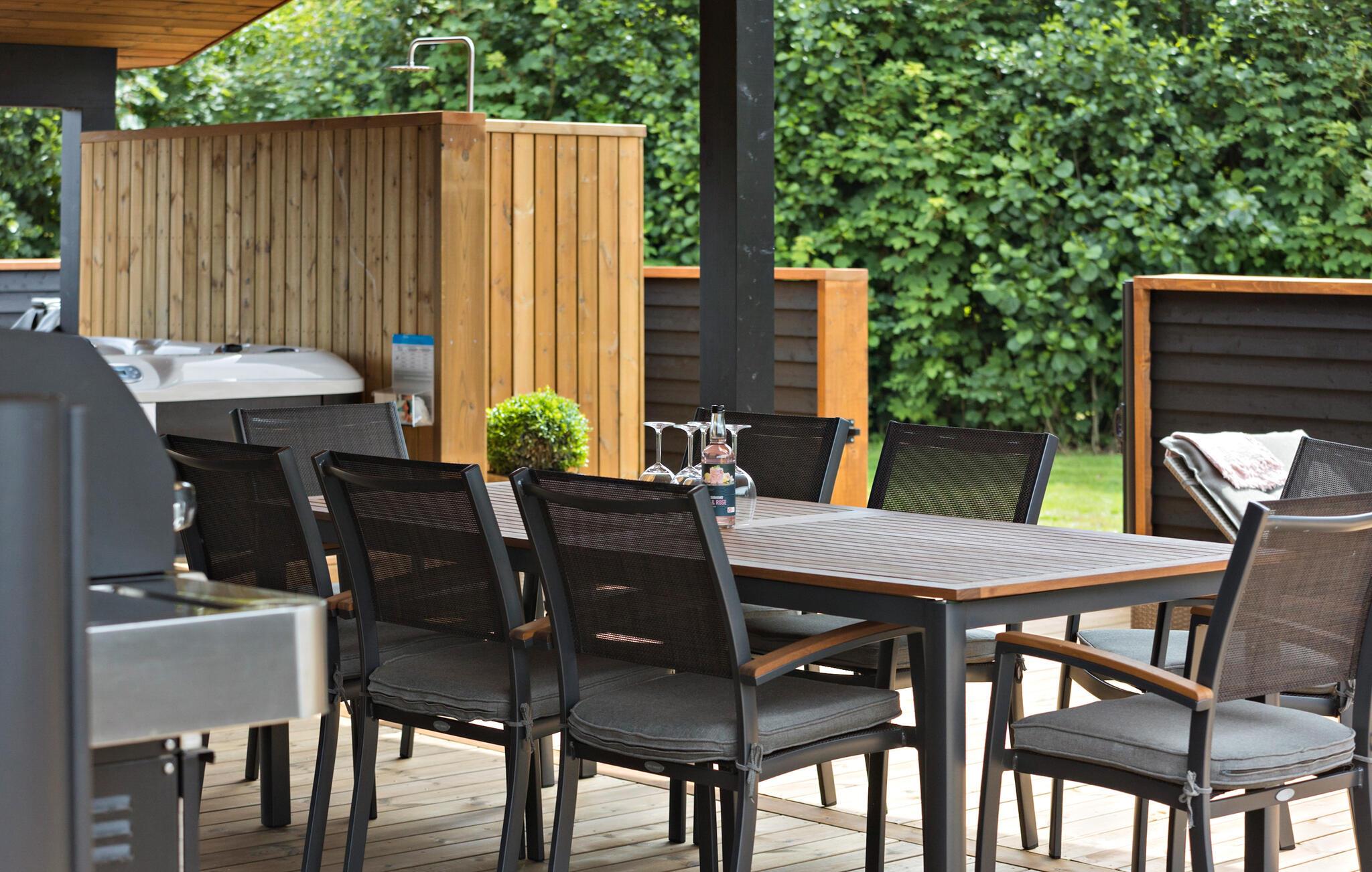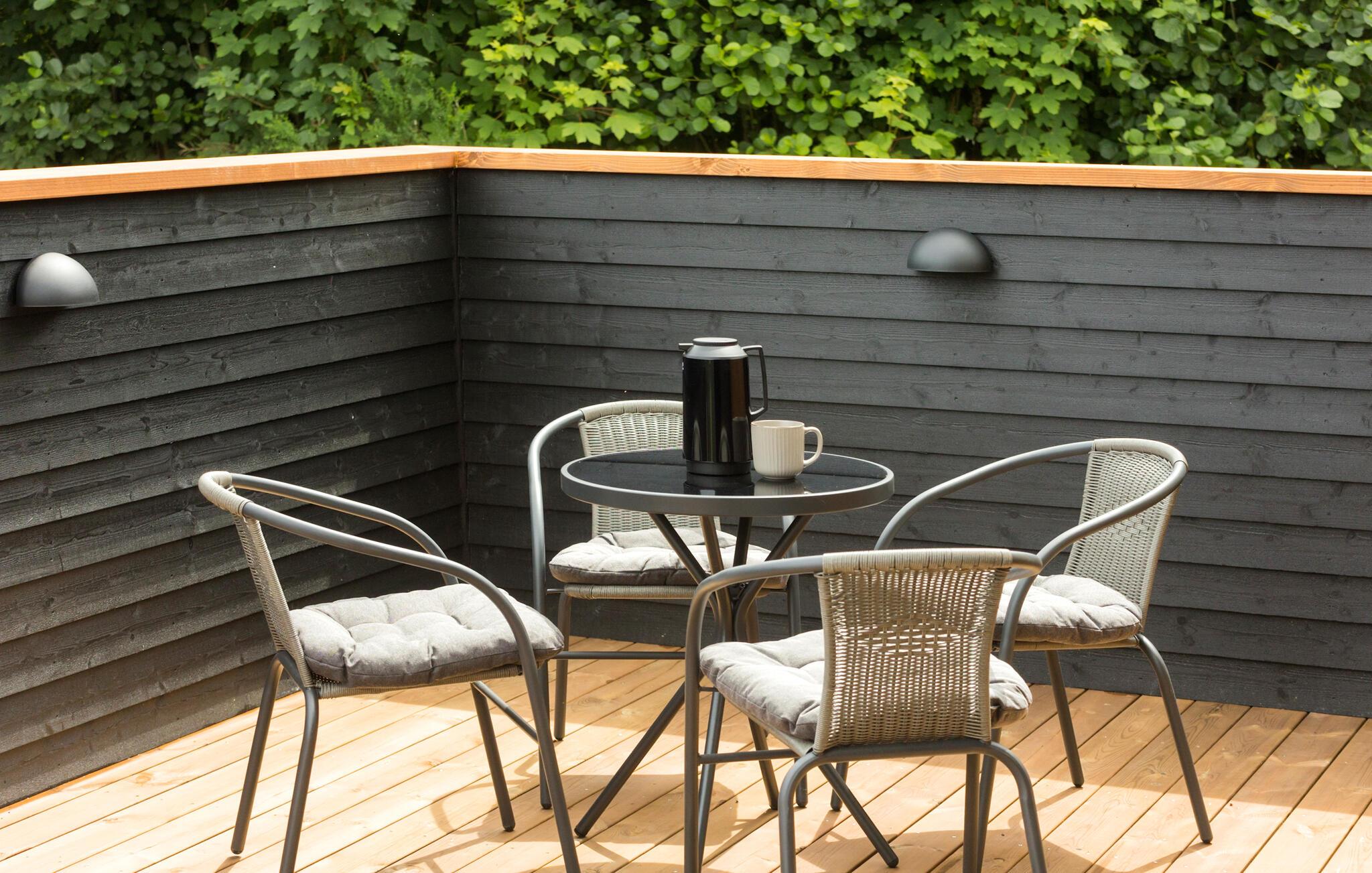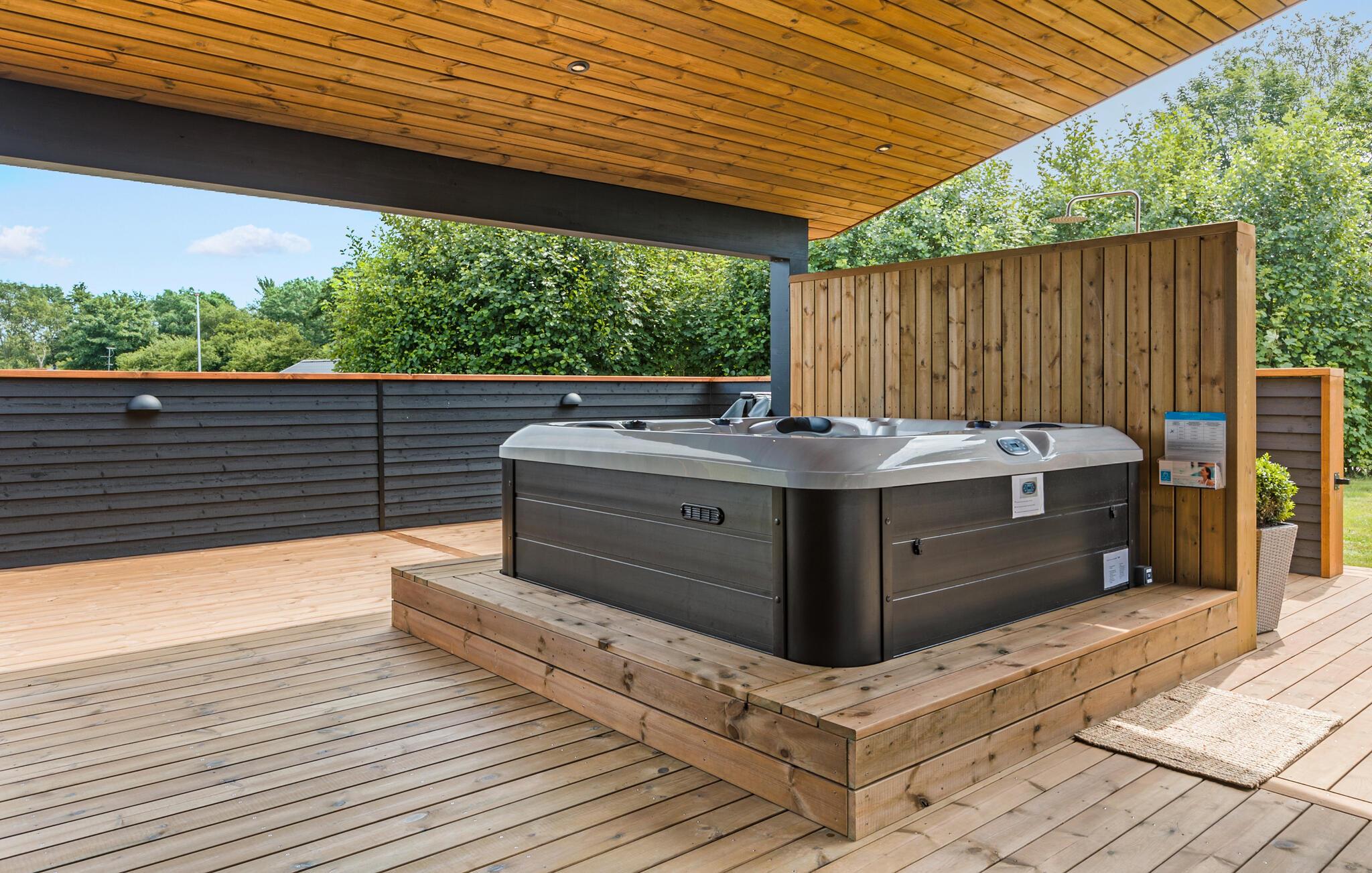 Prikken over i'et er dog den særdeles rummelig og ualmindeligt veludstyrede terrasse, der er delvist overdækket, så I frit kan vælge mellem sol og skygge i løbet af dagen. Nyd det gode vejr, lad jer bage igennem i solen og køl jer dejligt af i den udendørs bruser. Skulle vejret holde hele dagen, kan I købe gode bøffer med hjem til grillen, inden I runder dagen af med en skøn tur i det udendørs spabad under stjernerne.