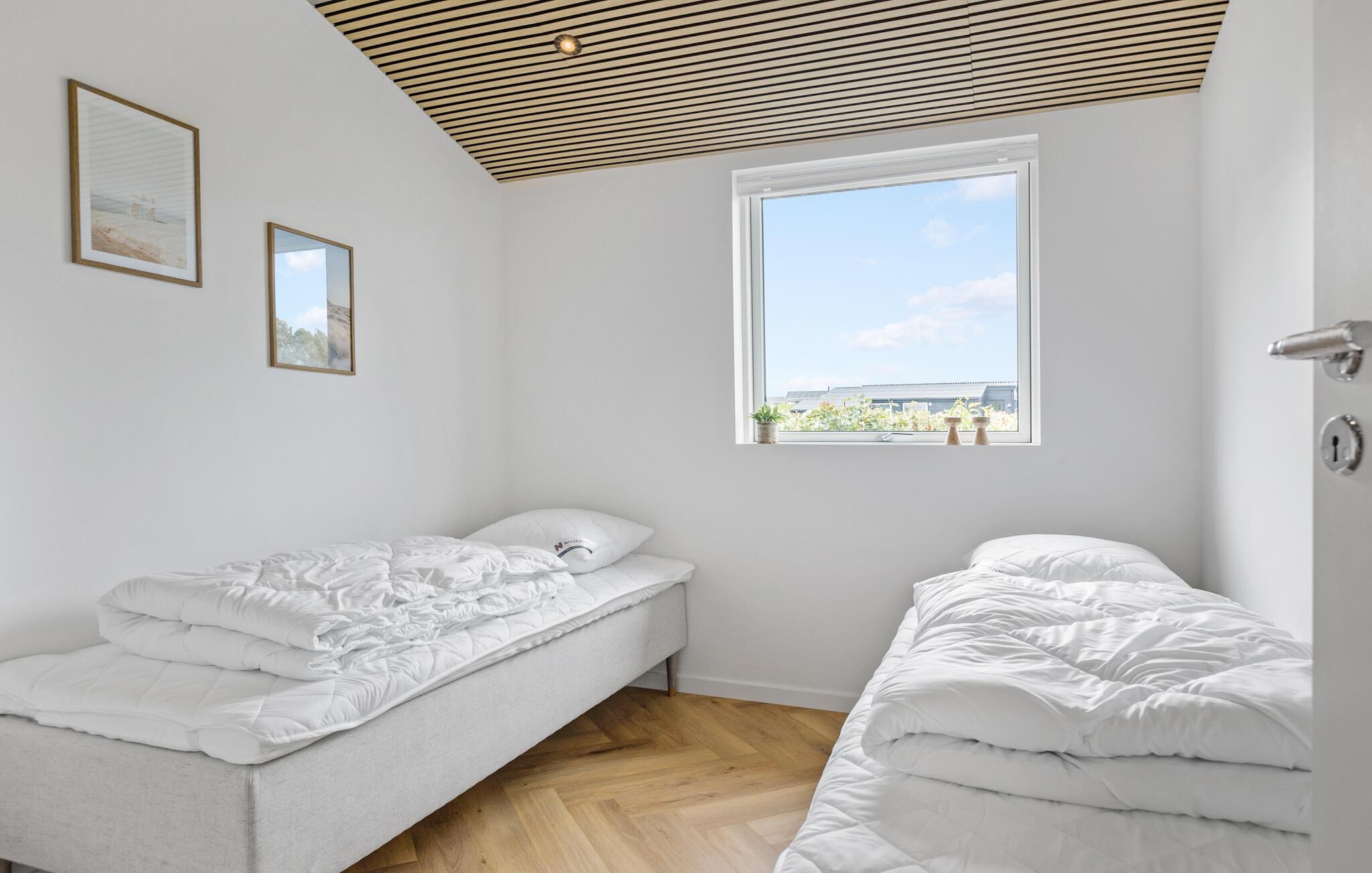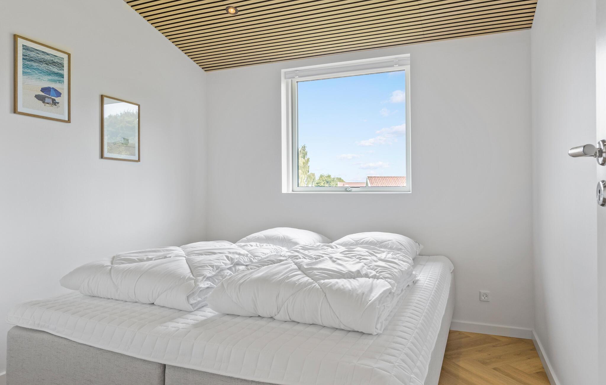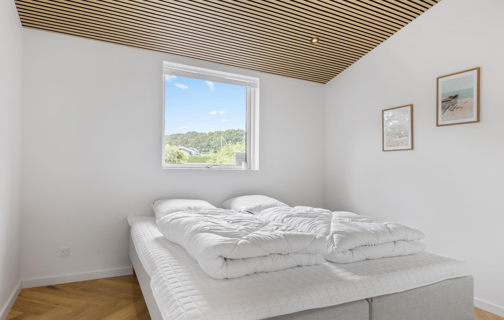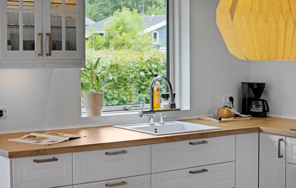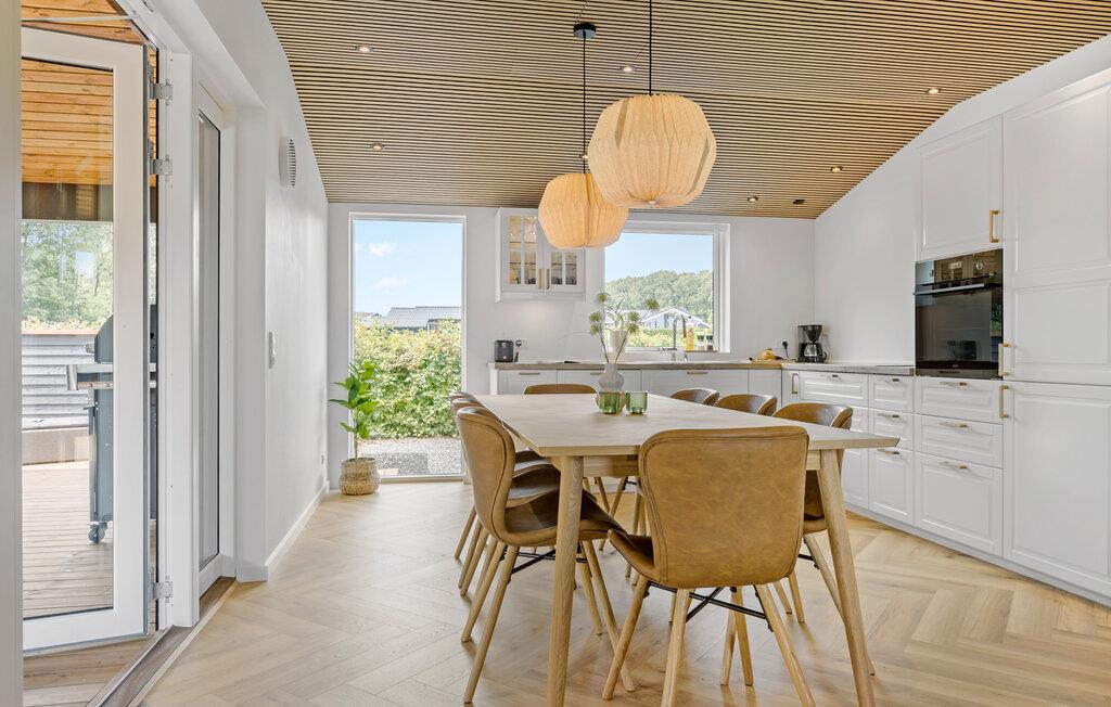Velkommen til dette moderne feriehus, der ligger i dejlige omgivelser tæt på Mommark Strand, og hvor I får en vidunderlig ramme om et ophold som større familie. Huset er flot indrettet med materialer af høj kvalitet, komfortable møbler og et fuldt udstyret køkken, hvor familiens kokke kan kræse om livretterne efter en herlig dag på farten. Lad aftenen gå på hæld med lidt lækre snacks og en god film på tv'et, hvis ikke I da hellere vil forkæle jer selv med en aftentur i boblebadet i badeværelset?