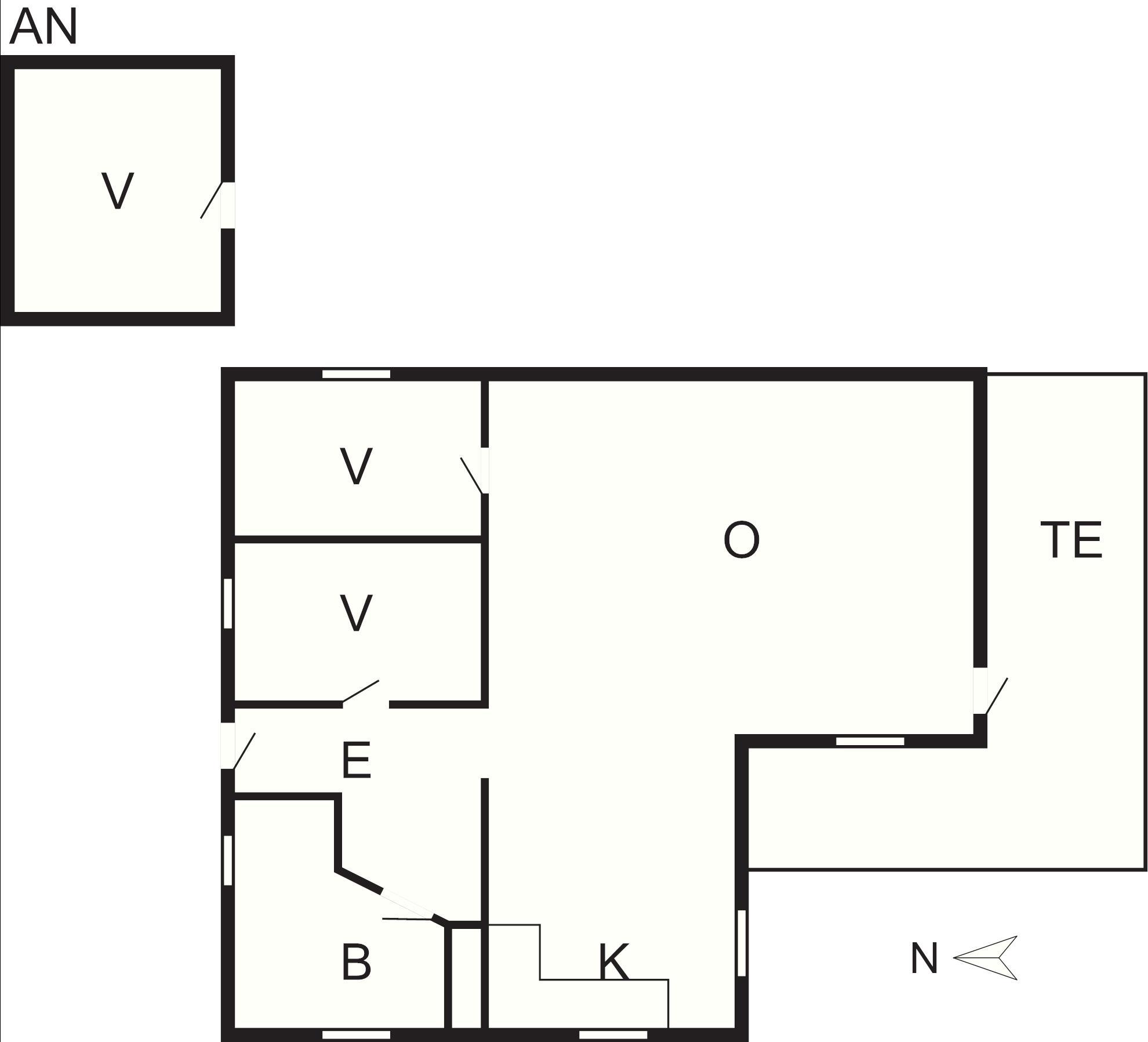 Indenfor finder du en entré, et stort, moderniseret badeværelse med bruseniche, køkken, opholds- og spiseplads samt to soveværelser. Det ene soveværelse har en dobbeltseng, det andet har to enkeltsenge, der ikke kan skubbes sammen. I annekset er der yderligere to senge, som heller ikke kan skubbes sammen.
