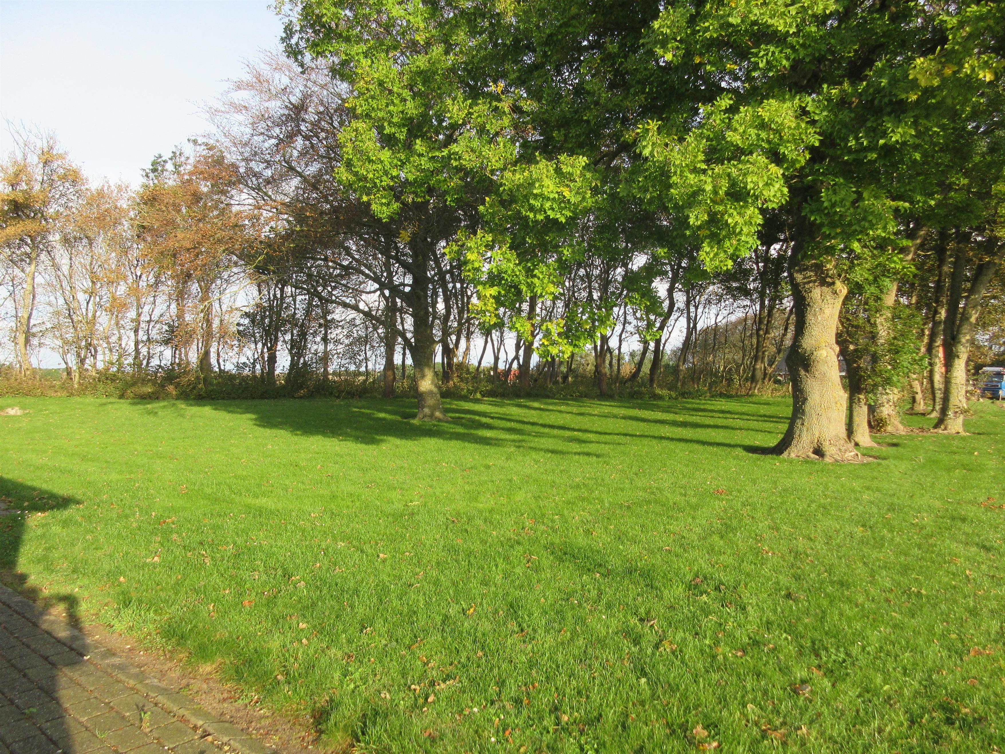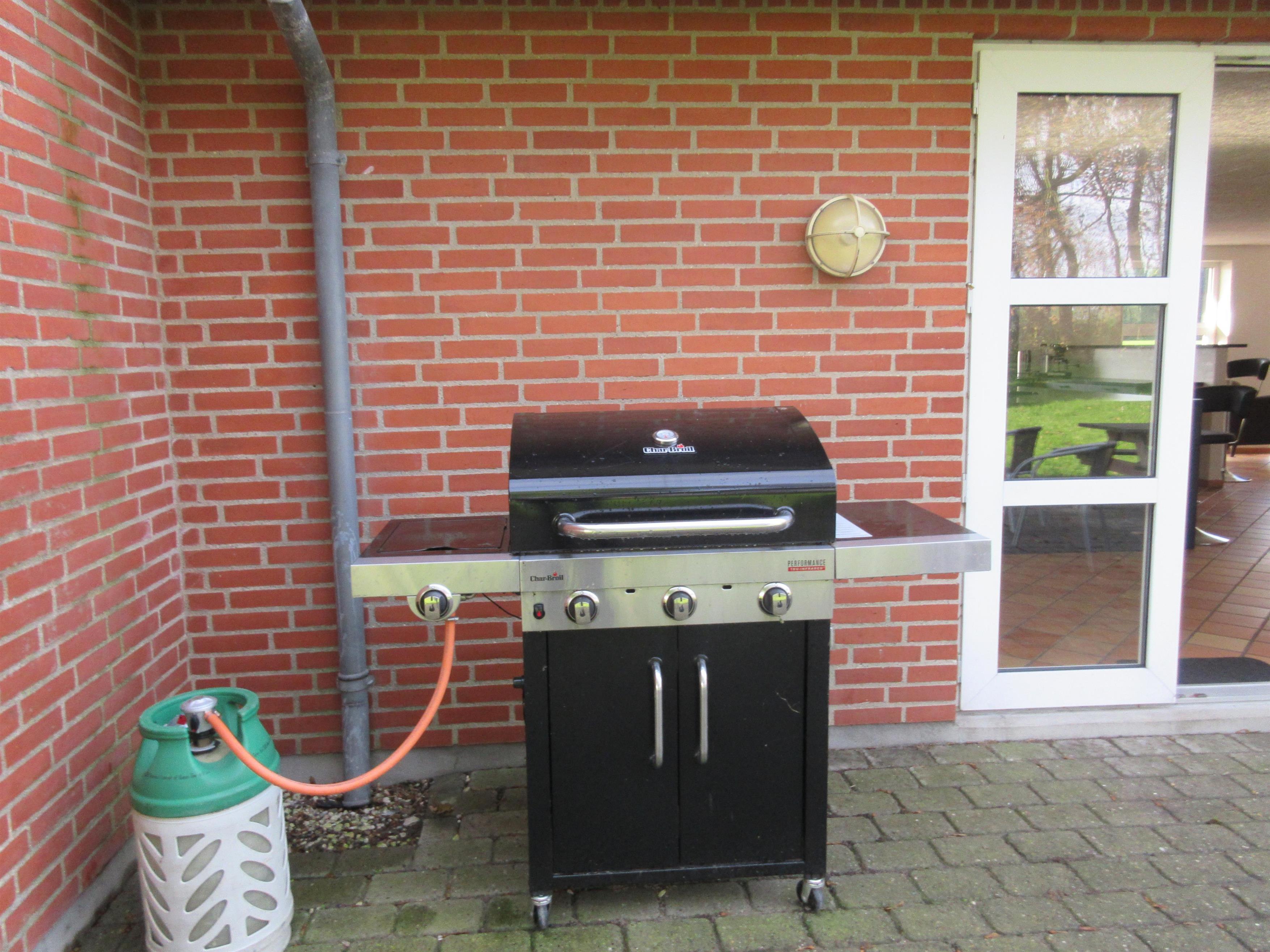Der er flere terrasser med havemøbler og grill og stor have med mange træer.