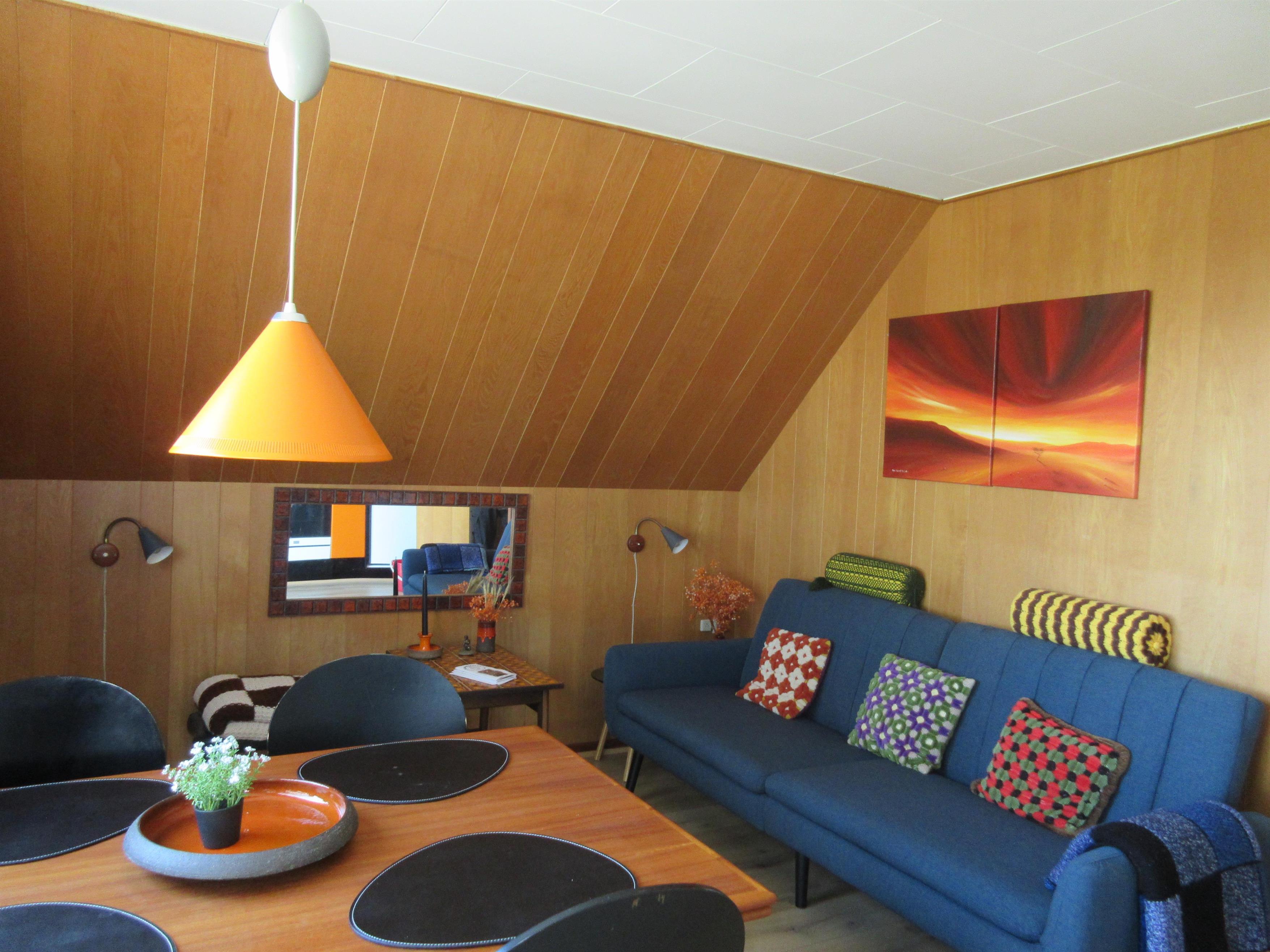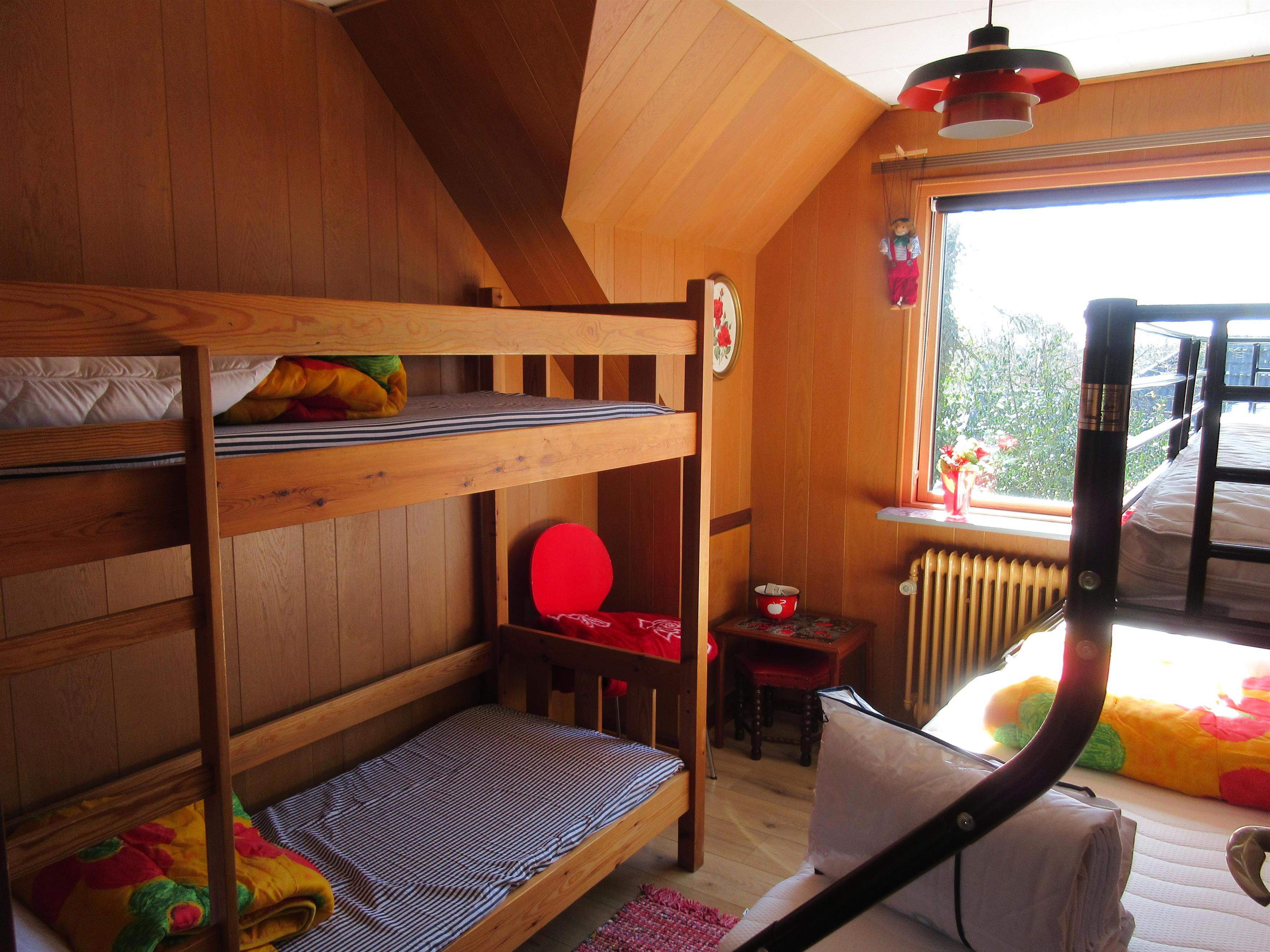 Stor skøn ferielejlighed på 1. sal med egen indgang. Renoveret i 2022 og køkkenet er holdt i bedste retrostil. Stor tagterrasse på 50m2 med havemøbler og grill. Der er to værelser. Et værelse med db. seng og et værelse med familiekøje og køjeseng. Desuden en db. sovesofa i køkken/opholdsrum. Stor boldbane må benyttes til leg.