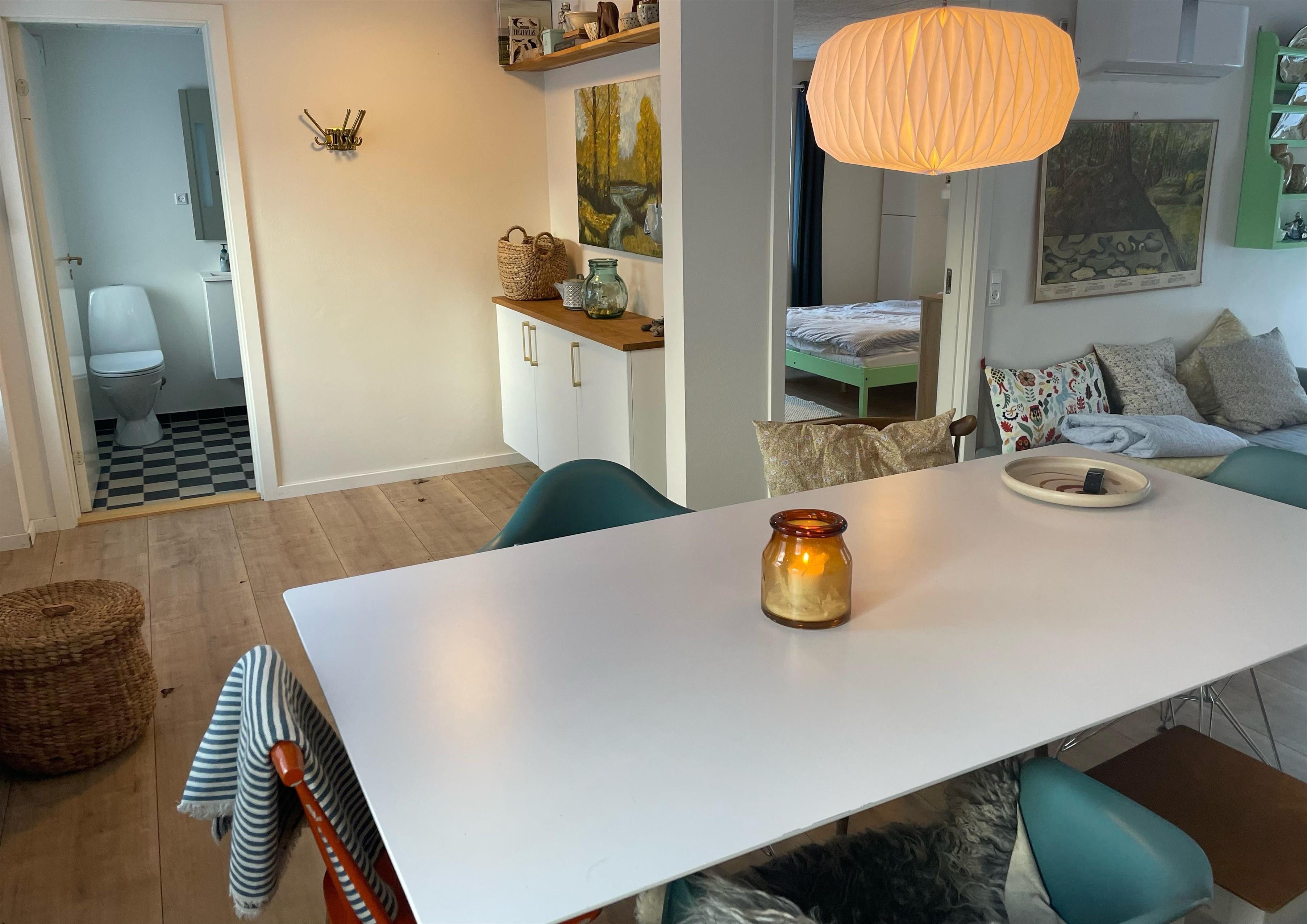Der er 4 værelser, 2 med dobbeltseng og 2 med 1½ mands senge. I spisestuen er der en daybe