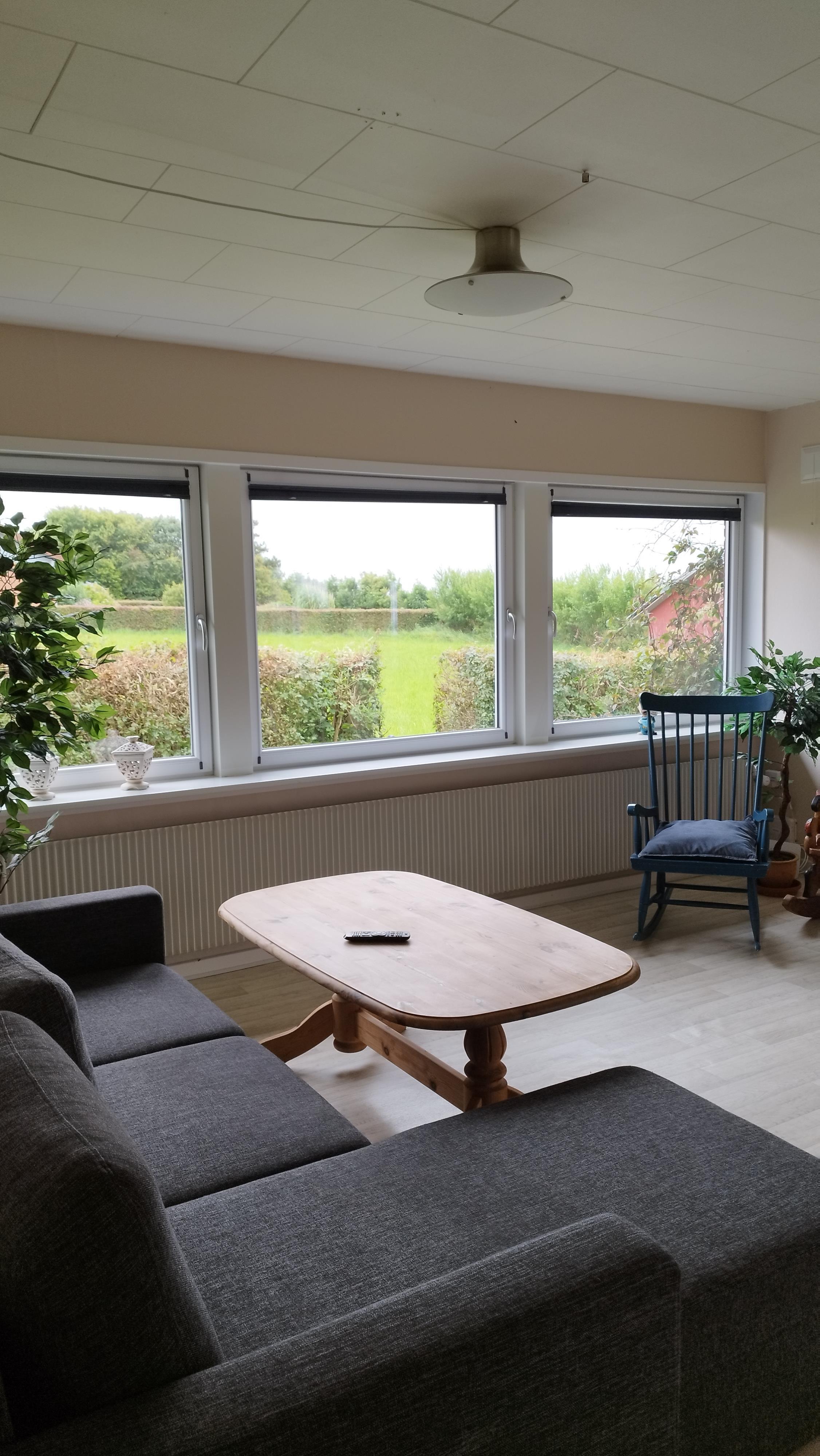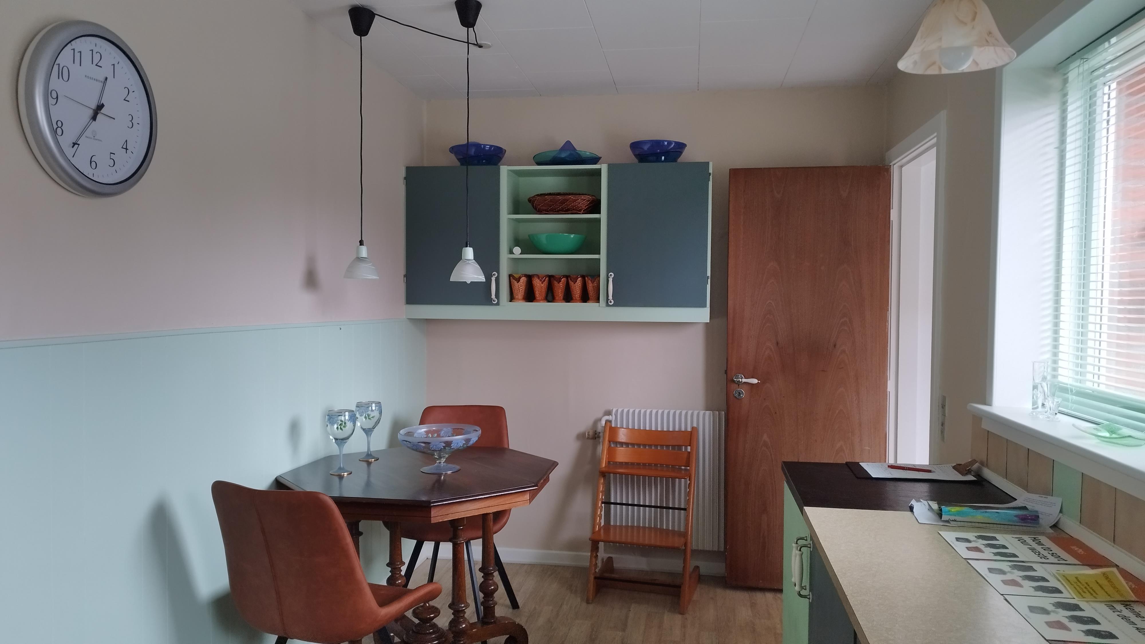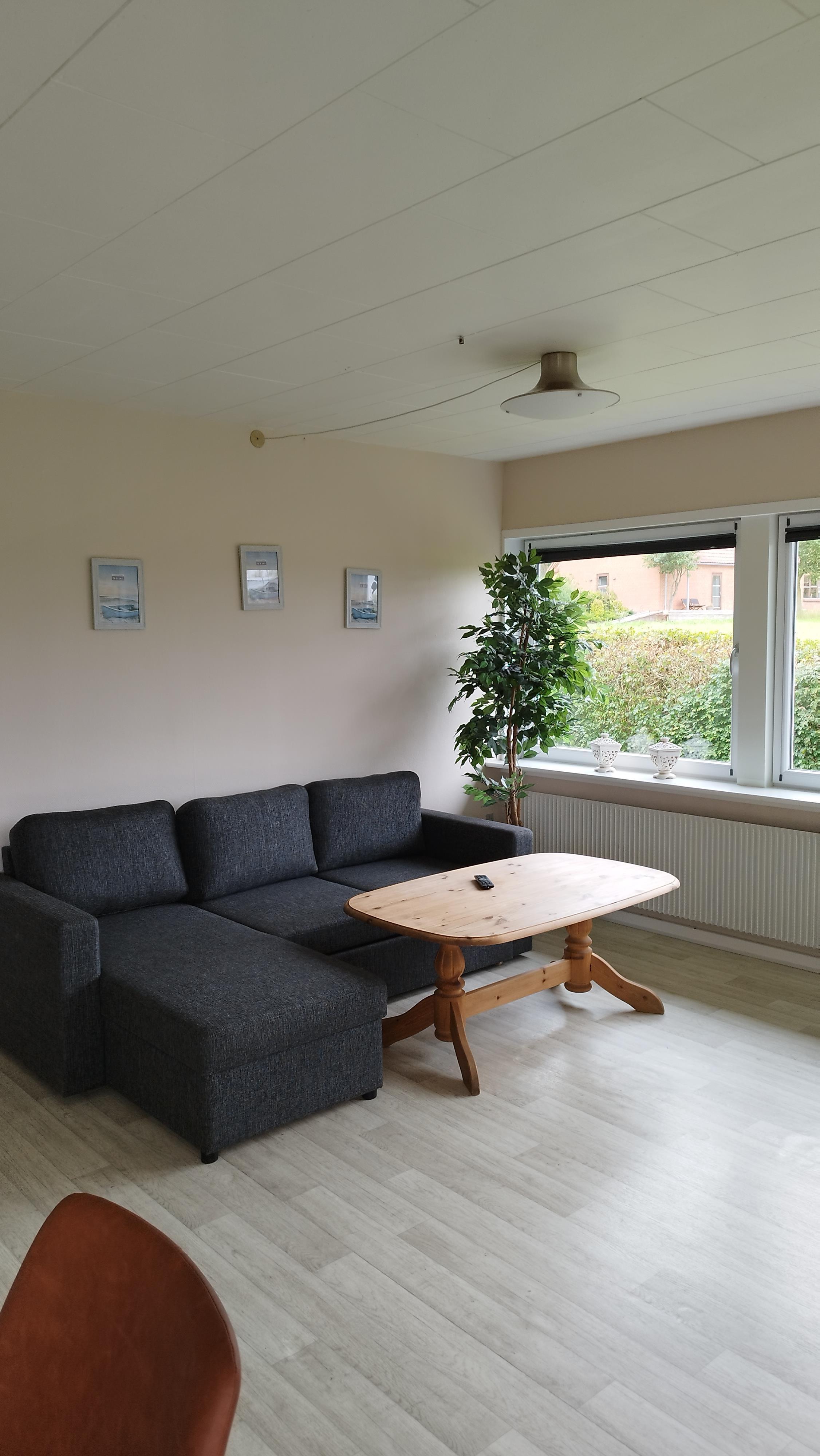 Indenfor mødes du af en lys og indbydende atmosfære. Boligen har tre soveværelser – et med dobbeltseng, et med enkeltseng og et med køjeseng – samt en sovesofa i stuen, der giver ekstra soveplads. Stuen er indrettet med både en hyggelig tv-krog og en spiseafdeling, og det fuldt udstyrede køkken gør det nemt at tilberede måltider i hjemlige rammer. I bryggerset finder du både vaskemaskine og tørretumbler, og der er desuden et lille rum med træningsmaskine, hvor du kan nyde udsigten over markerne og fjorden, mens du får pulsen op.