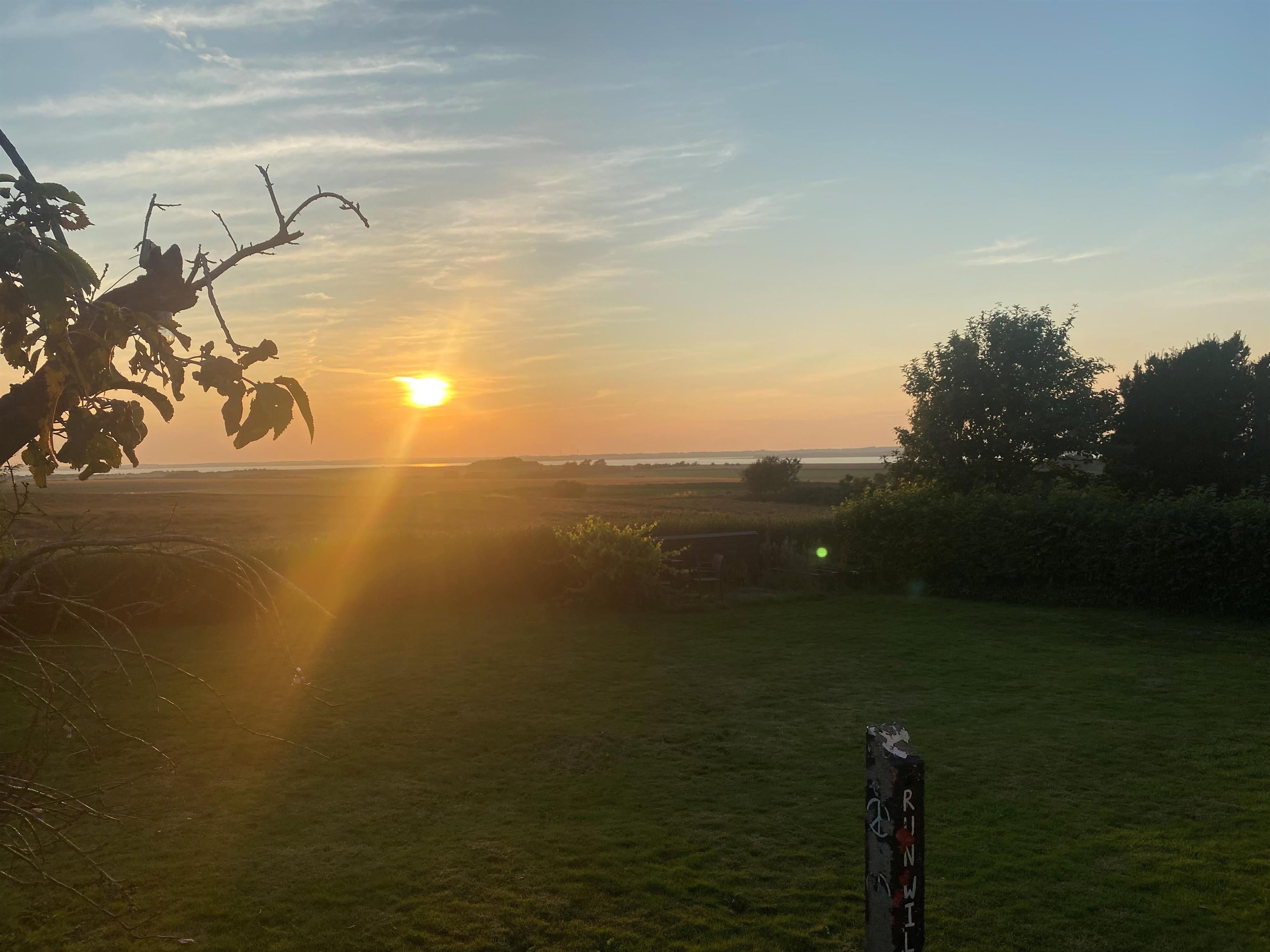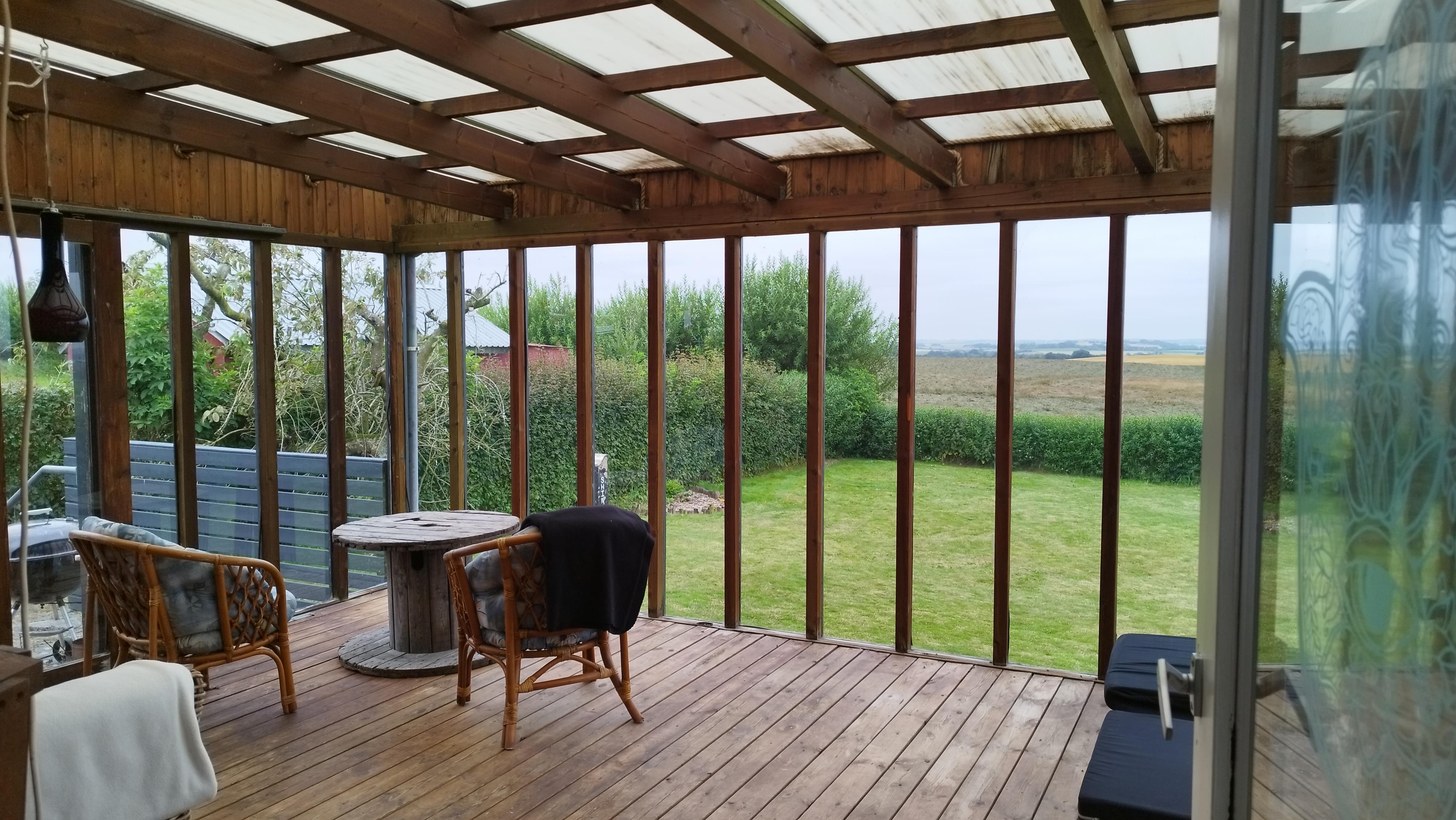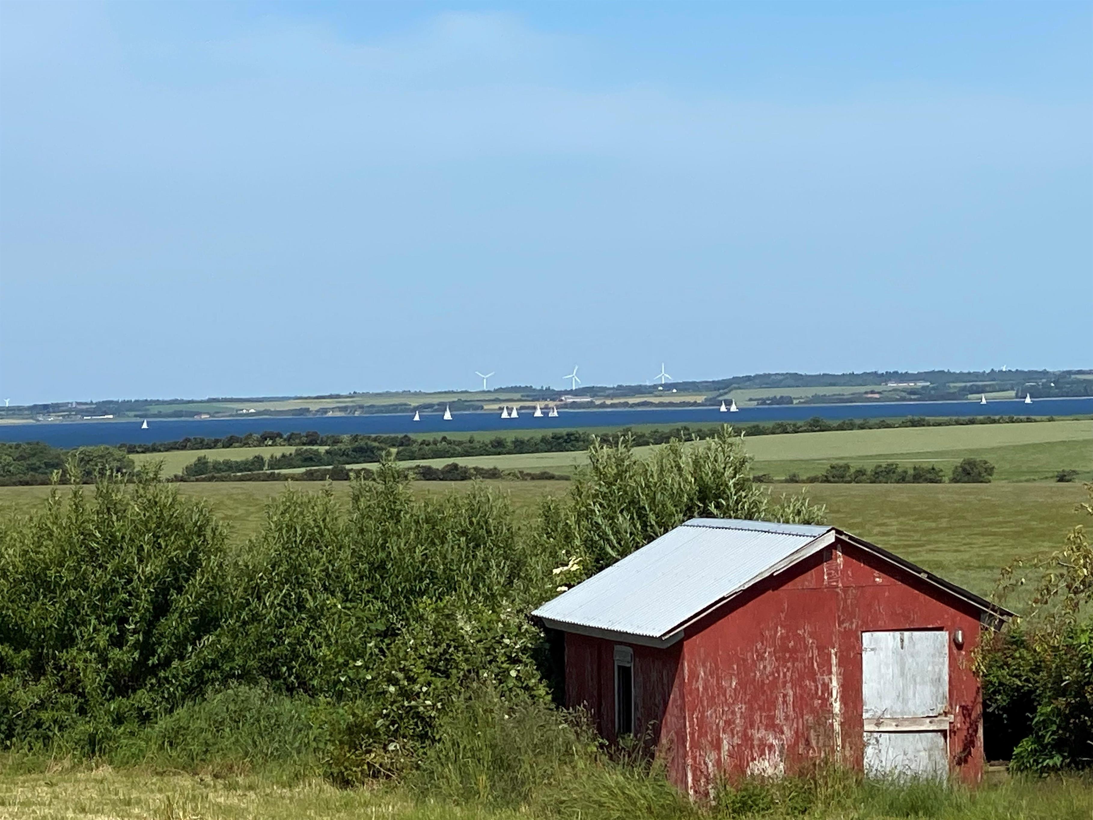 Udenfor venter en overdækket terrasse med havemøbler, hvor du kan nyde morgenkaffen eller aftensmaden med udsigt til det åbne landskab og vandet i horisonten. Haven byder på en stor græsplæne, legeområde til børnene og en hyggelig bålplads, der indbyder til samvær og snobrød under stjernerne.