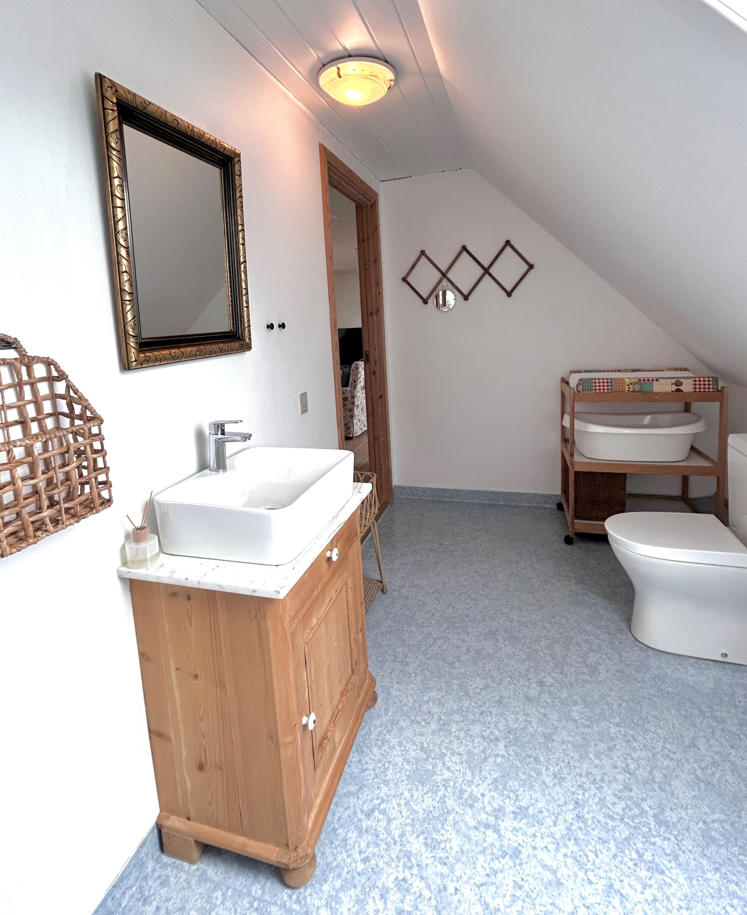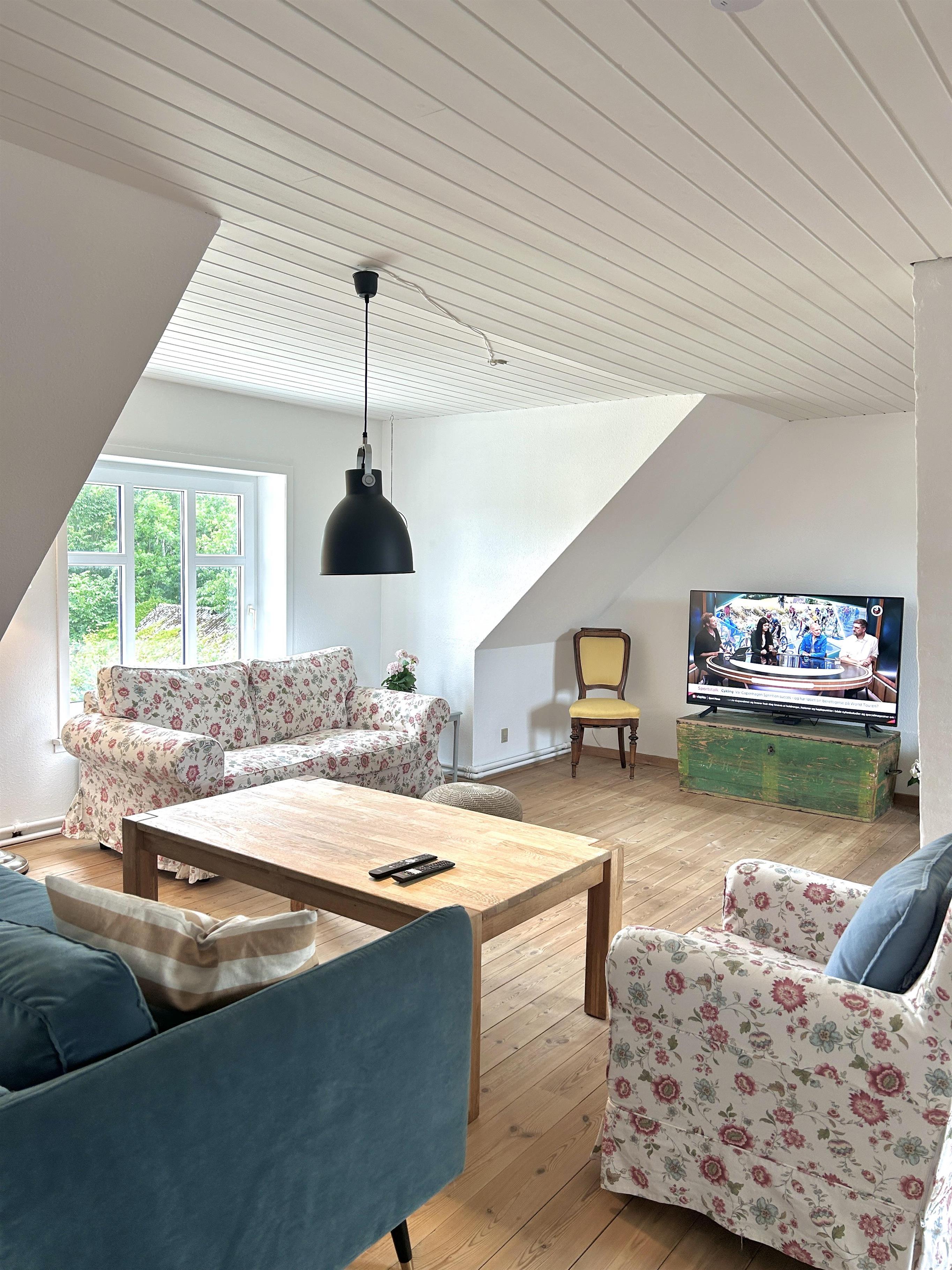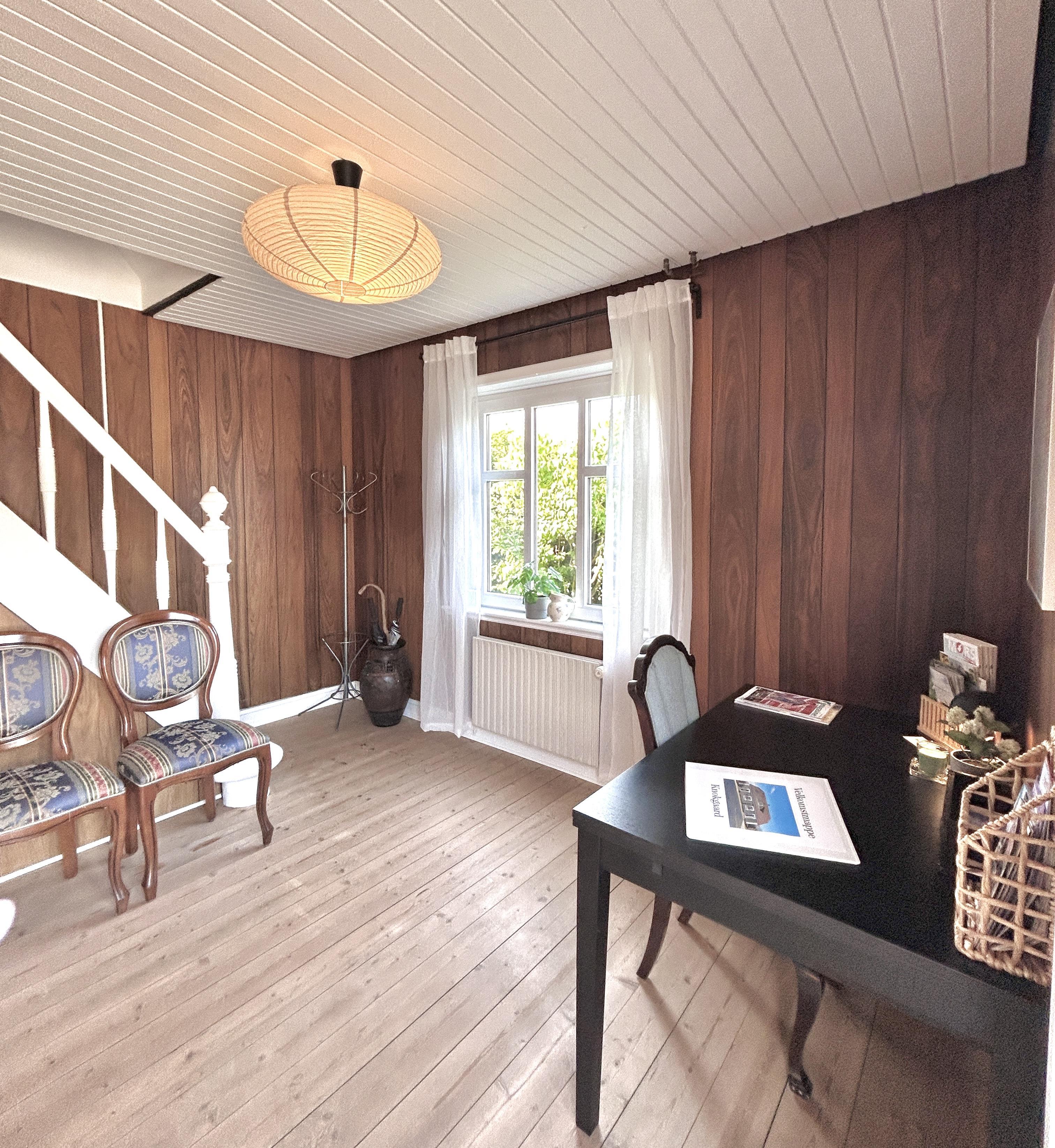 - Fem soveværelser og to badeværelser (stuen og førstesal)