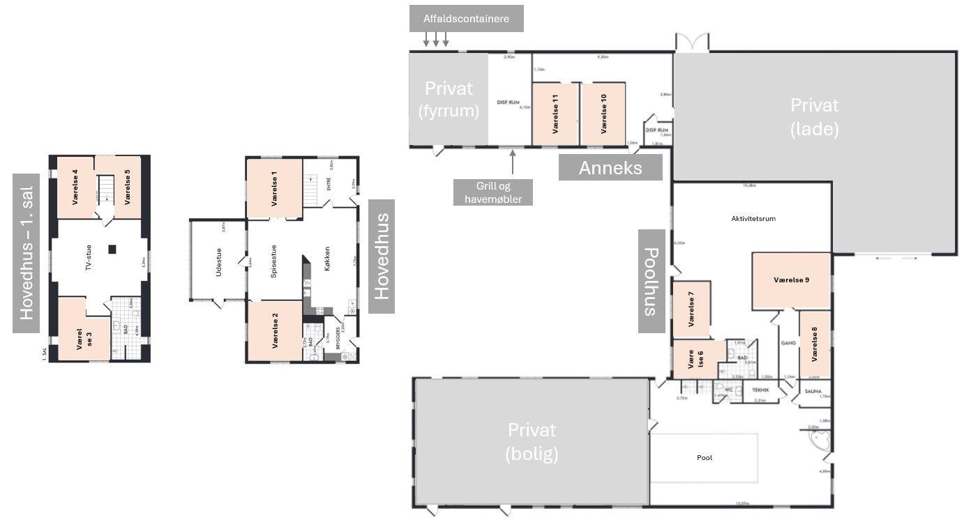- To store soveværelser (adgang til toilet og bad sker via poolhus eller hovedhus)