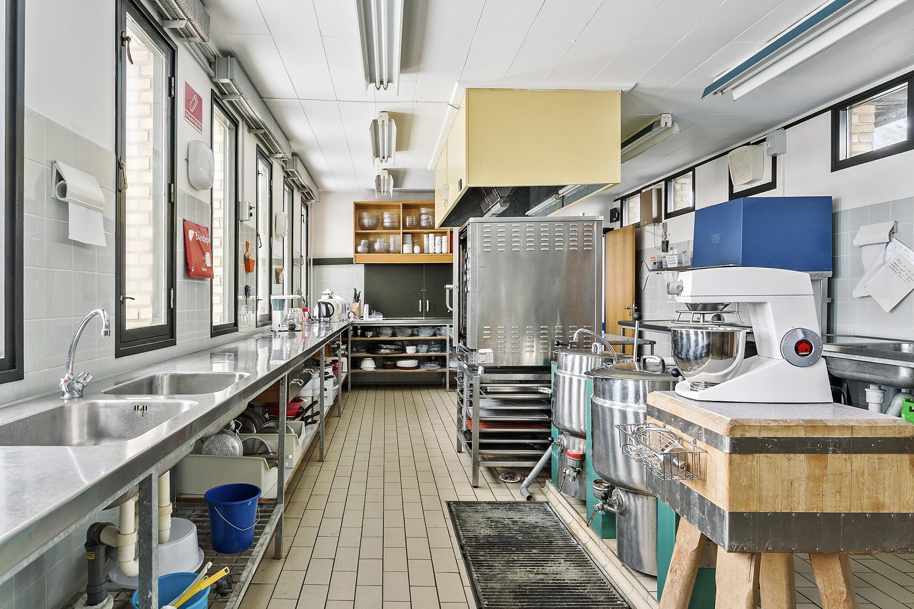 Storkøkken med alt hvad der hører til, bl.a. 2 store køleskabe, lille fryser og stor opvaskemaskine.