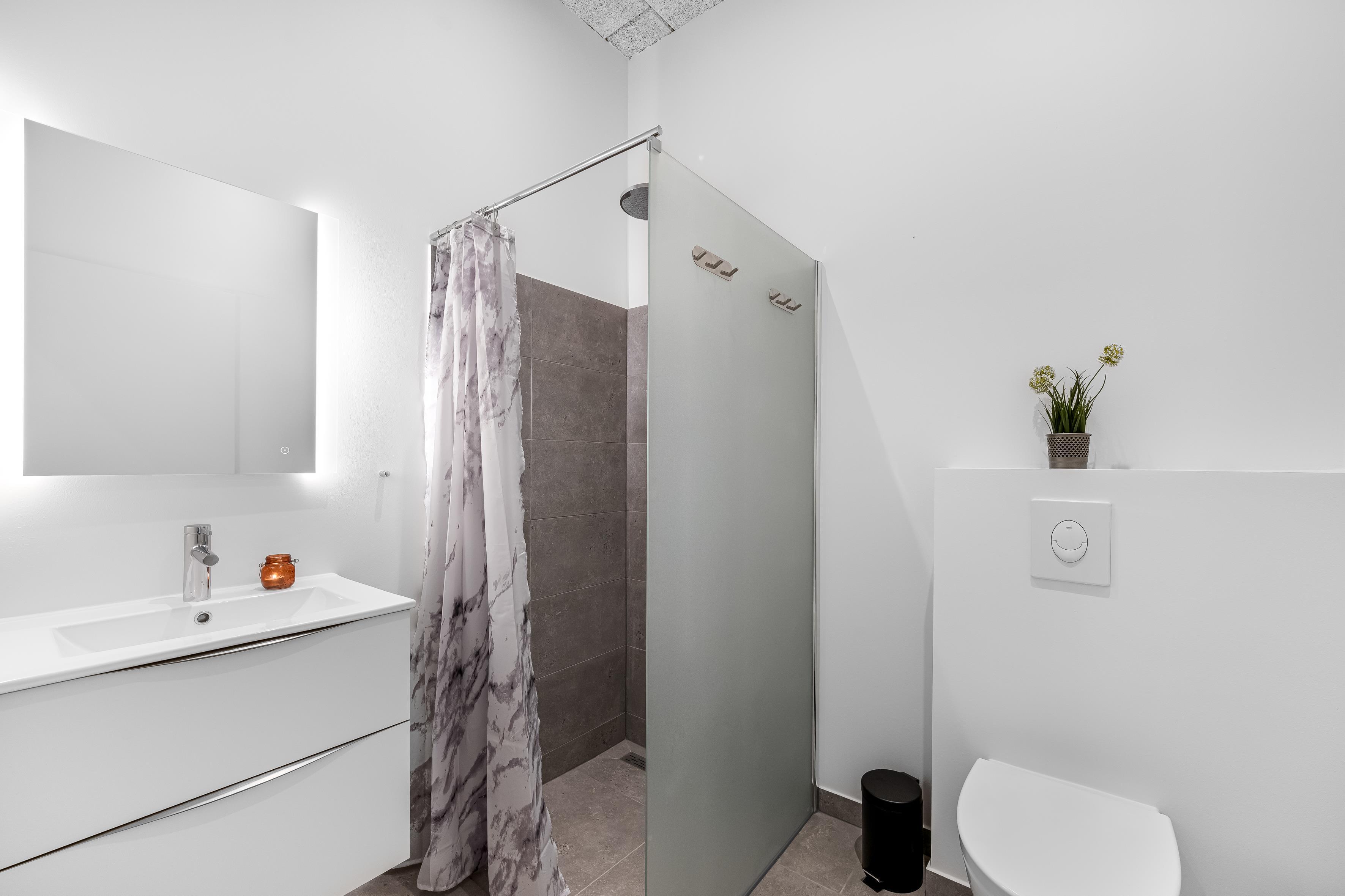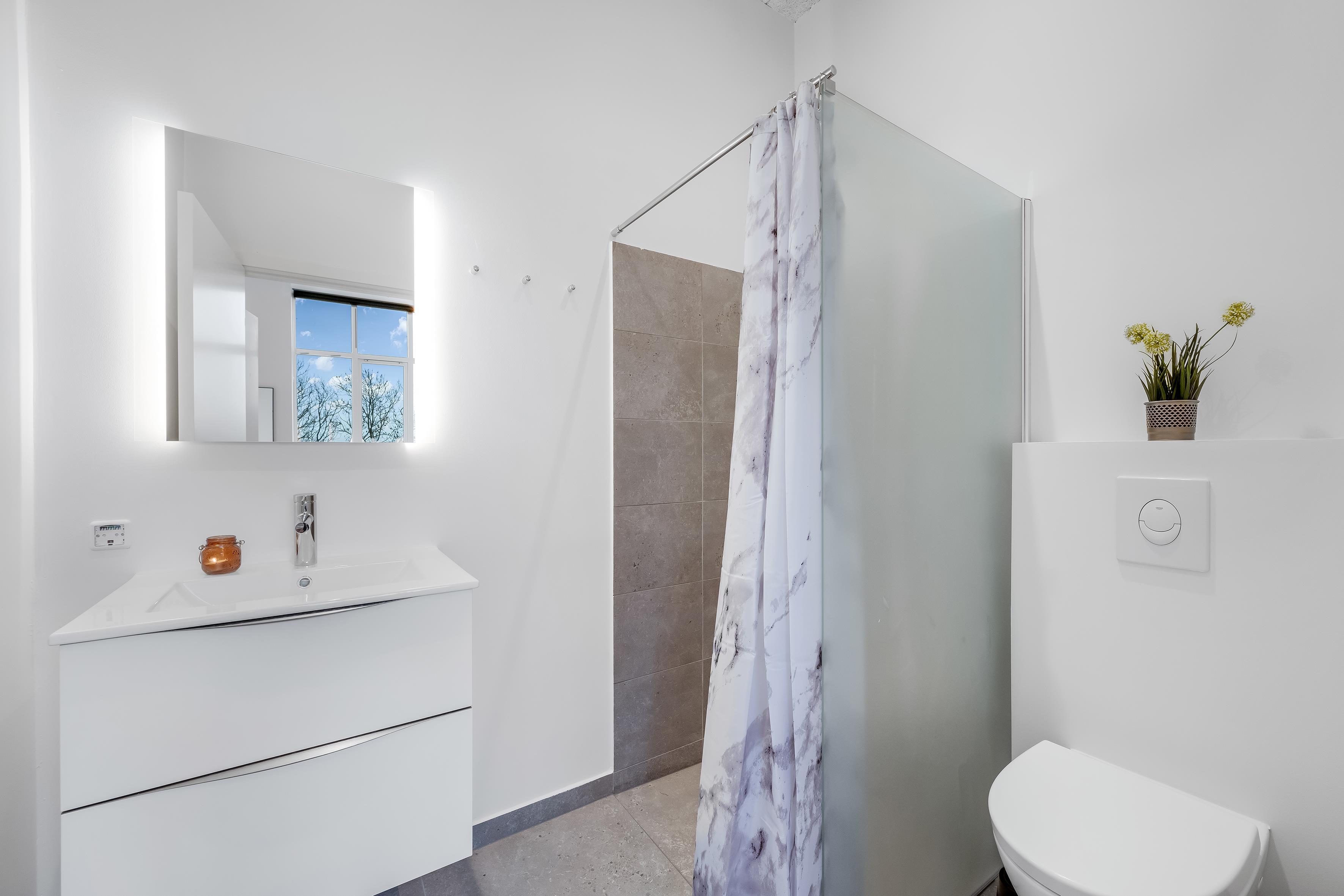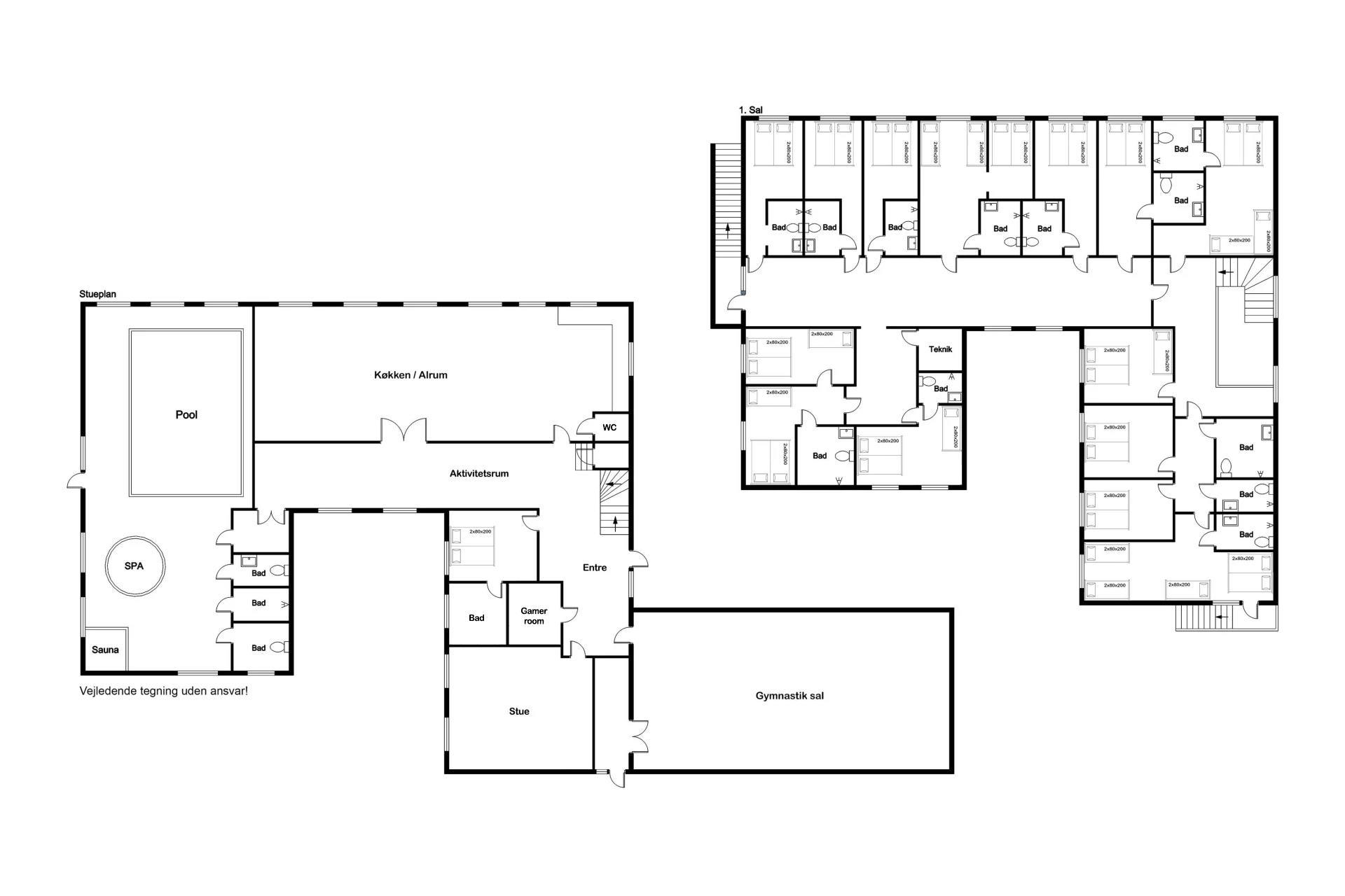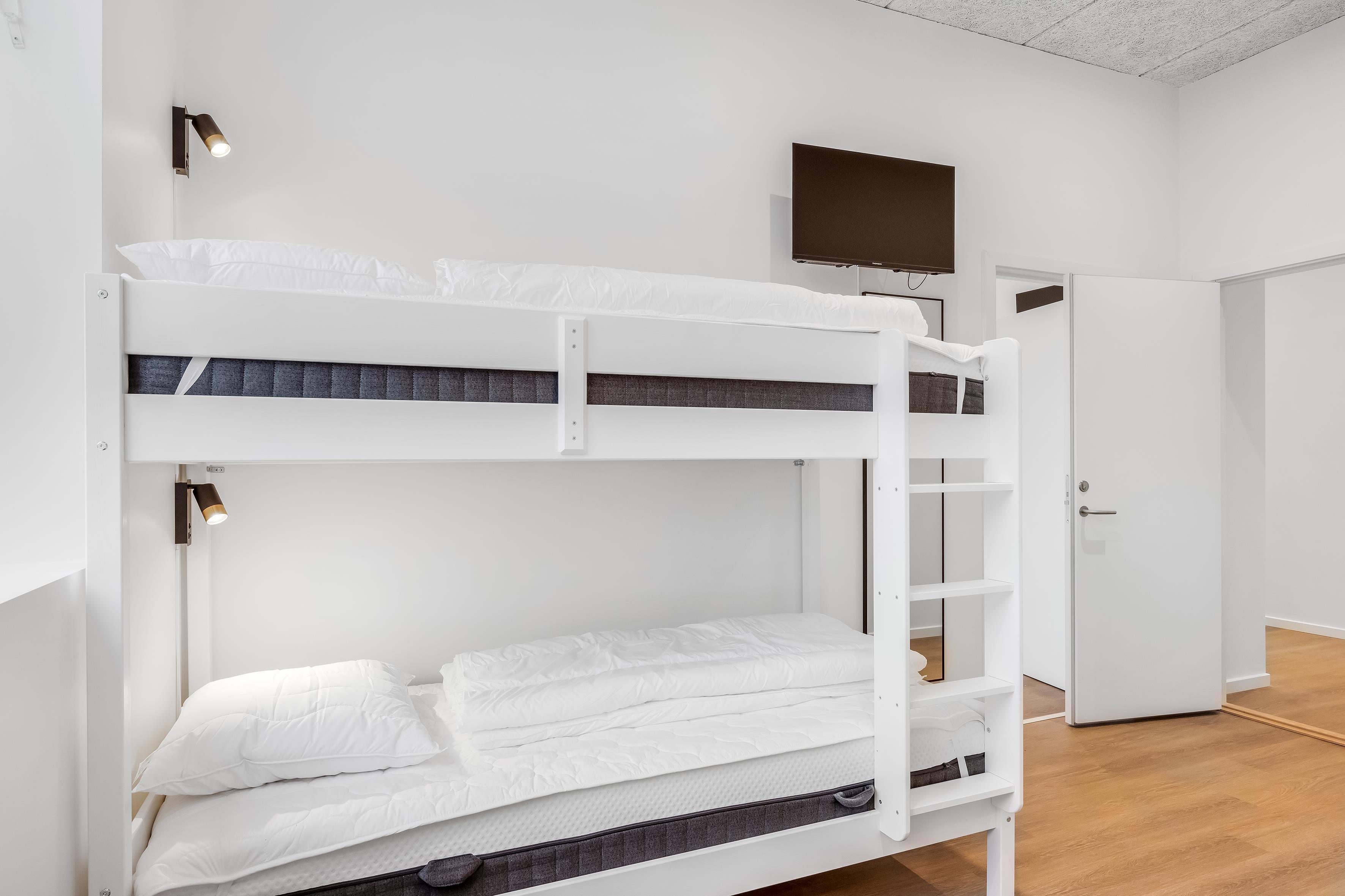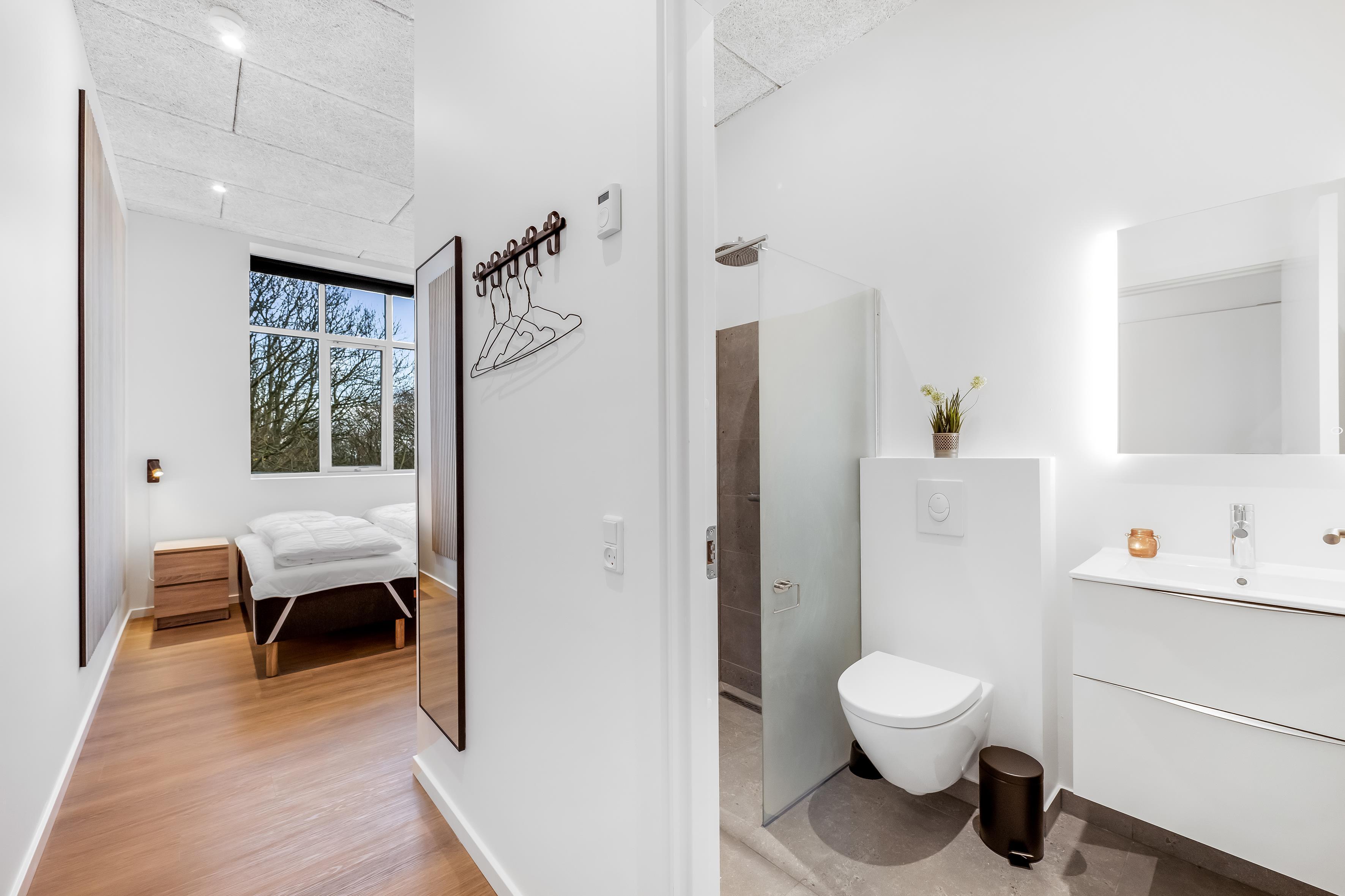 Indendørs findes der 16 rummelige soveværelser, der kan rumme op til 50 personer. Hvert værelse er udstyret med komfortable senge og på hovedparten af værelserne er der desuden et badeværelse, så der er plads til alle. Huset har i alt 15 badeværelser, hver med toilet, håndvask og bruseniche, som gør det nemt for en stor gruppe at forberede sig på dagens eventyr. Derudover er der gulvvarme i hele huset, inklusiv badeværelserne, hvilket sikrer en behagelig temperatur året rundt.