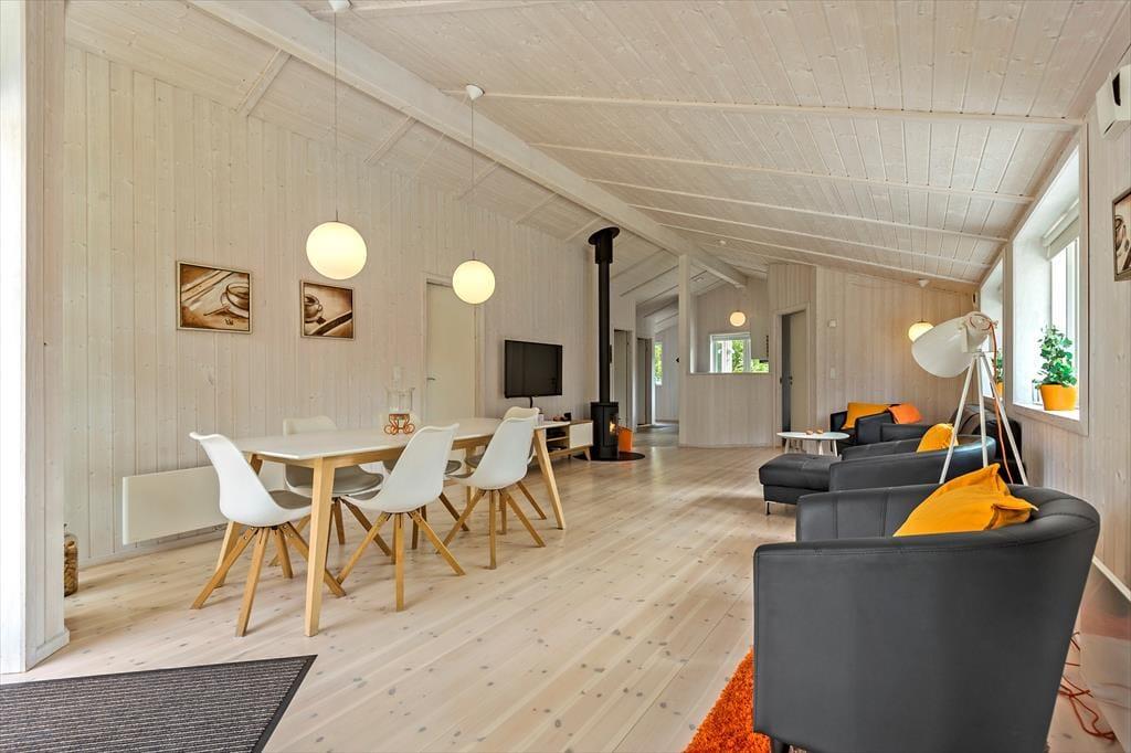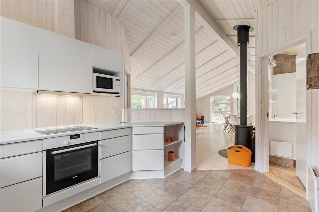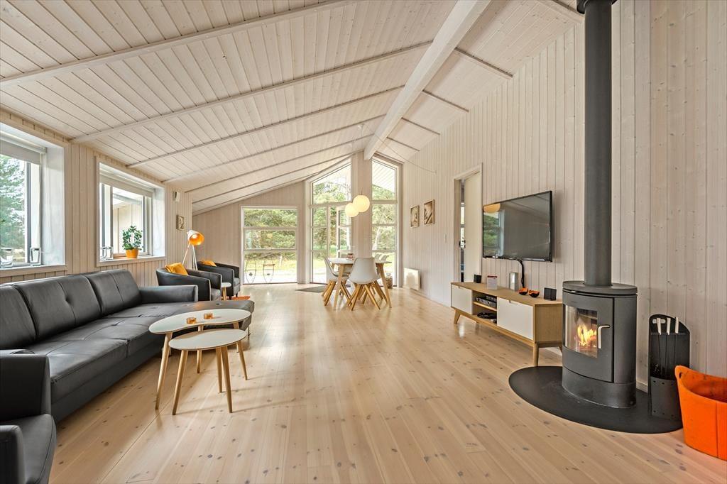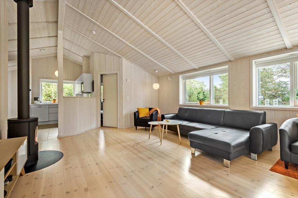 Sommerhuset er på hele 110 m2, så inden døre er der masser af plads til seks feriegæster. Alle rum er smagfuldt indrettet med moderne møblement, og de lyse farvetoner og det gode naturlige lysindfald er med til at skabe en skøn atmosfære. I opholdsafdelingen kan I slænge jer i sofaafdelingen nær brændeovnen, spille brætspil ved spisebordet eller tage en slapper i alkoven – eventuelt mens aftensmaden passer sig selv i ovnen i det åbne køkken. Trænger I virkelig til at koble af, er det måske tid til en tur i saunaen og spabadet. Begge dele finder I på badeværelset, der hører med til planløsningen på samme vis som et gæstetoilet og tre rummelige soveværelser.