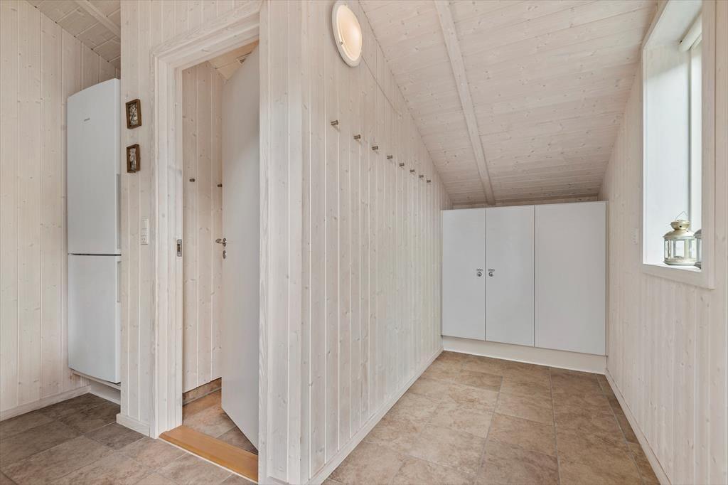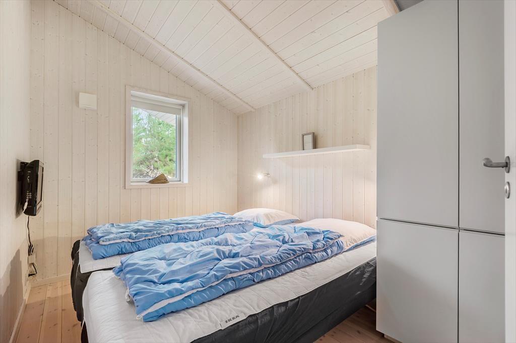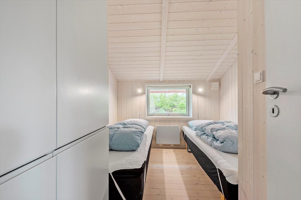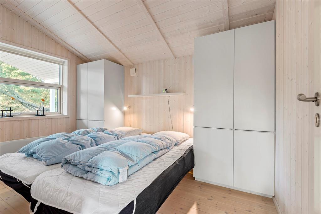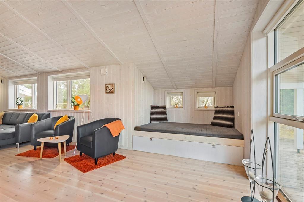 Sommerhuset er på hele 110 m2, så inden døre er der masser af plads til seks feriegæster. Alle rum er smagfuldt indrettet med moderne møblement, og de lyse farvetoner og det gode naturlige lysindfald er med til at skabe en skøn atmosfære. I opholdsafdelingen kan I slænge jer i sofaafdelingen nær brændeovnen, spille brætspil ved spisebordet eller tage en slapper i alkoven – eventuelt mens aftensmaden passer sig selv i ovnen i det åbne køkken. Trænger I virkelig til at koble af, er det måske tid til en tur i saunaen og spabadet. Begge dele finder I på badeværelset, der hører med til planløsningen på samme vis som et gæstetoilet og tre rummelige soveværelser.