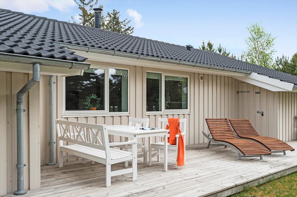 På den store naturgrund er der noget for både børn og voksne. I kan også hygge jer på den store træterrasse, der smyger sig om tre af husets sider. Ikke mindst på den sydvendte del af terrassen er der rig mulighed for at finde en solrig opholdsplads dagen lang, og om aftenen kan I flytte om på vestsiden af huset, hvor terrassen er delvist overdækket.