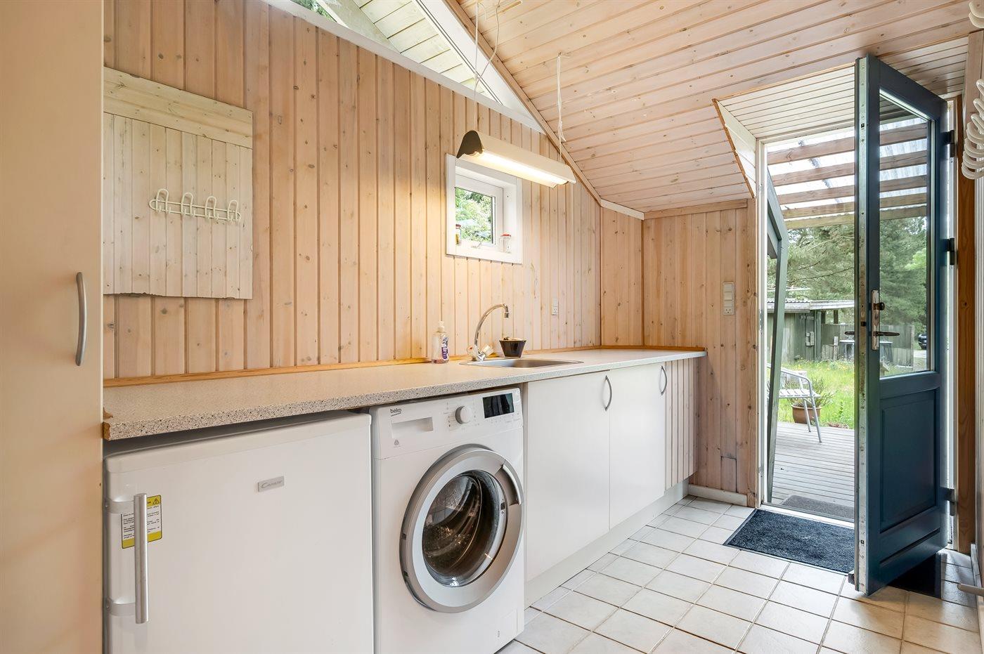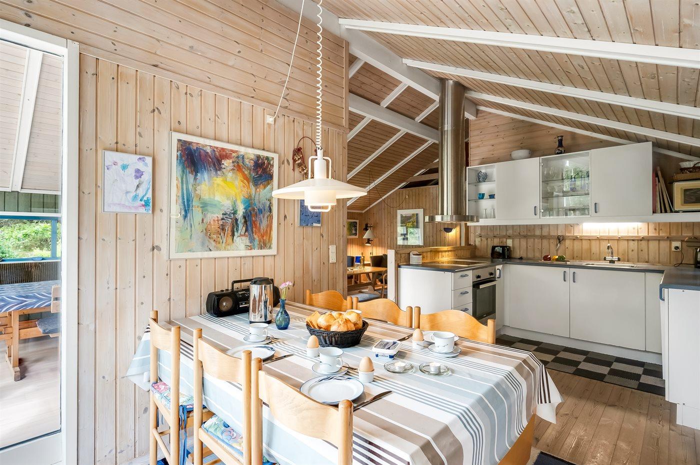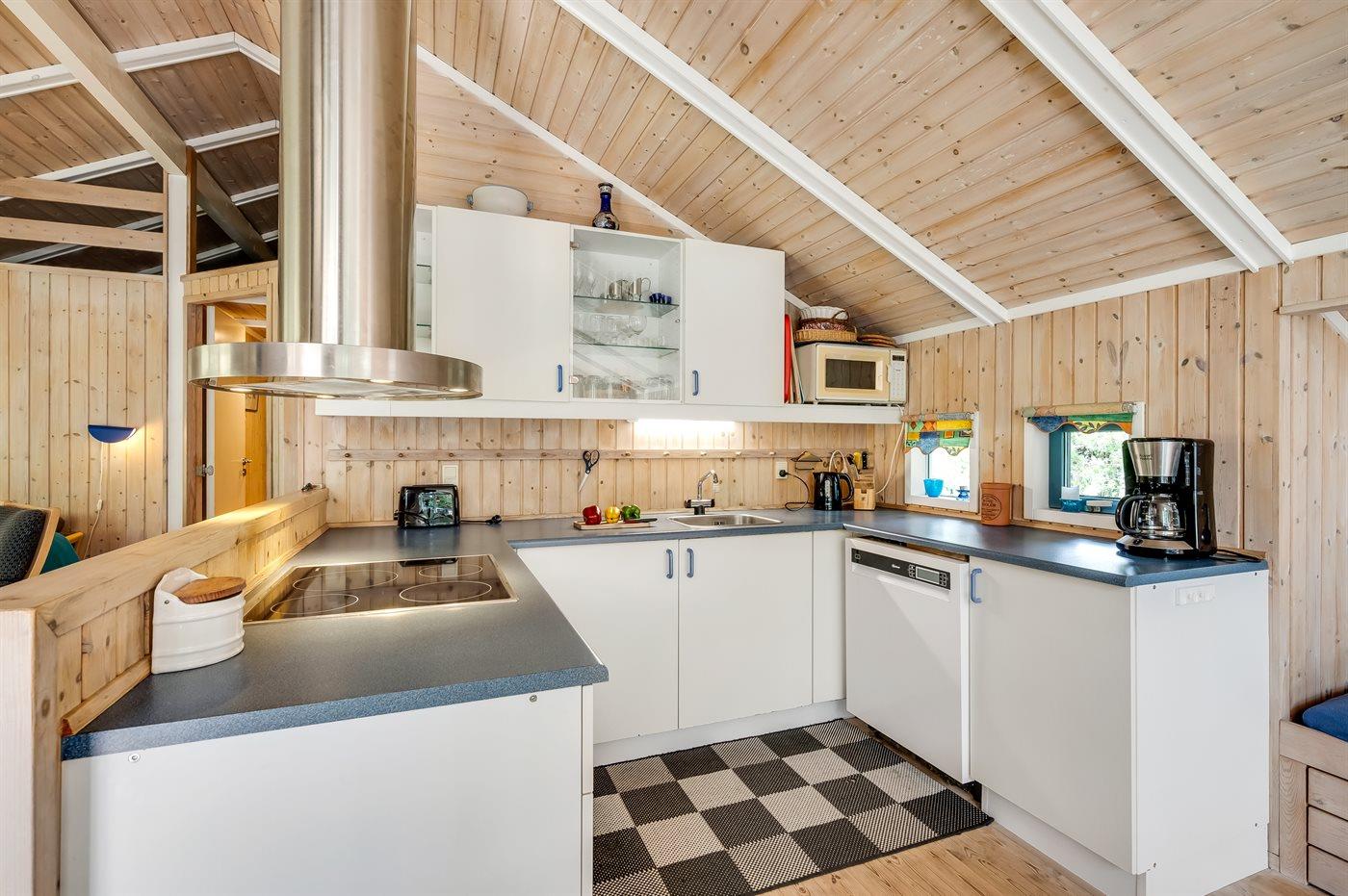 Køkkenet er udstyret med 1 køleskab. Der er 4 induktionskogeplader, varmluftovn samt opvaskemaskine.
