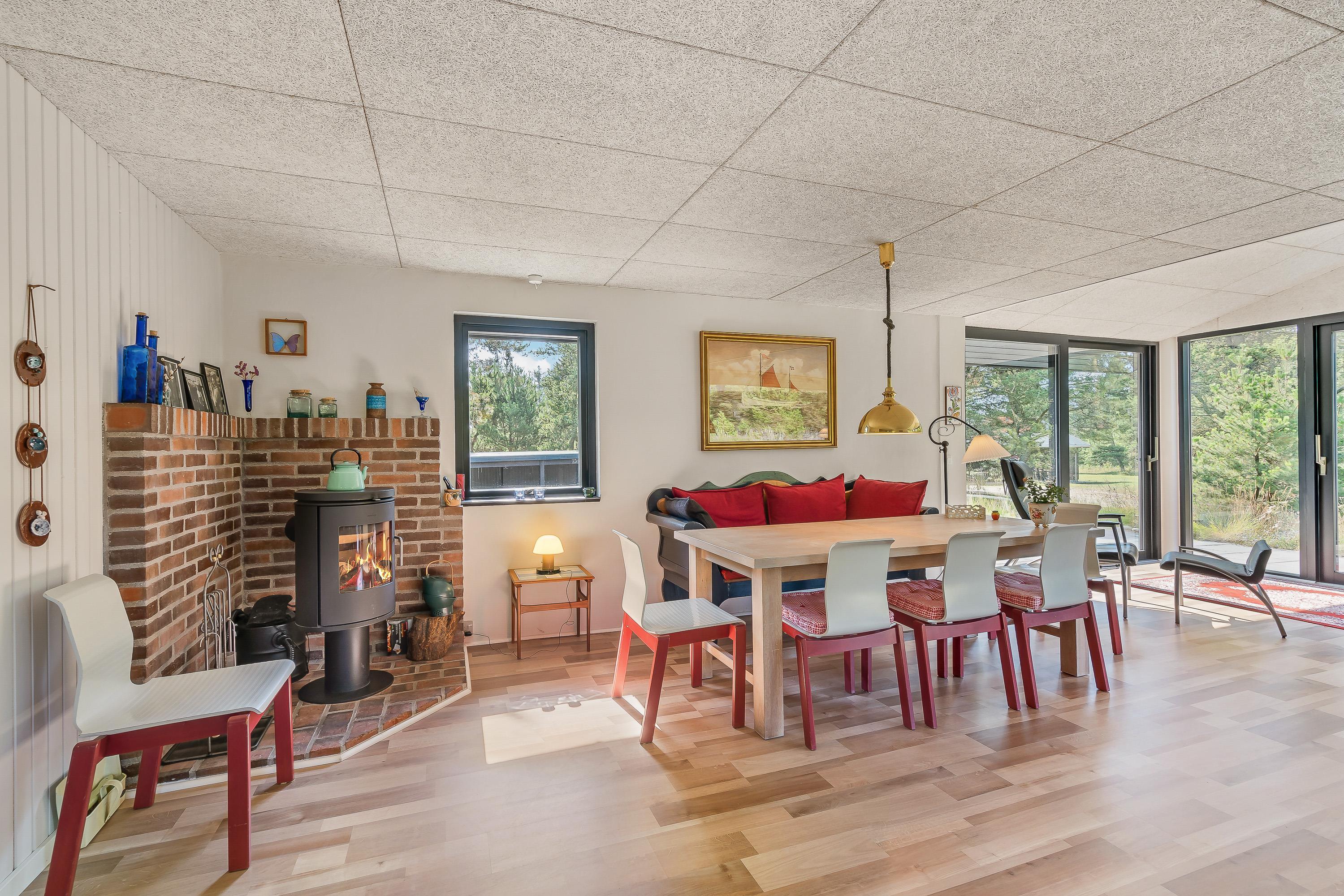 Den hyggelige stemning i alrummet bliver fuldendt af brændeovnen, der knitrer i baggrunden og spreder en dejlig varme i rummet. Derudover er sommerhuset udstyret med en varmepumpe, der sørger for gode indendørs temperaturer på energivenlig vis.