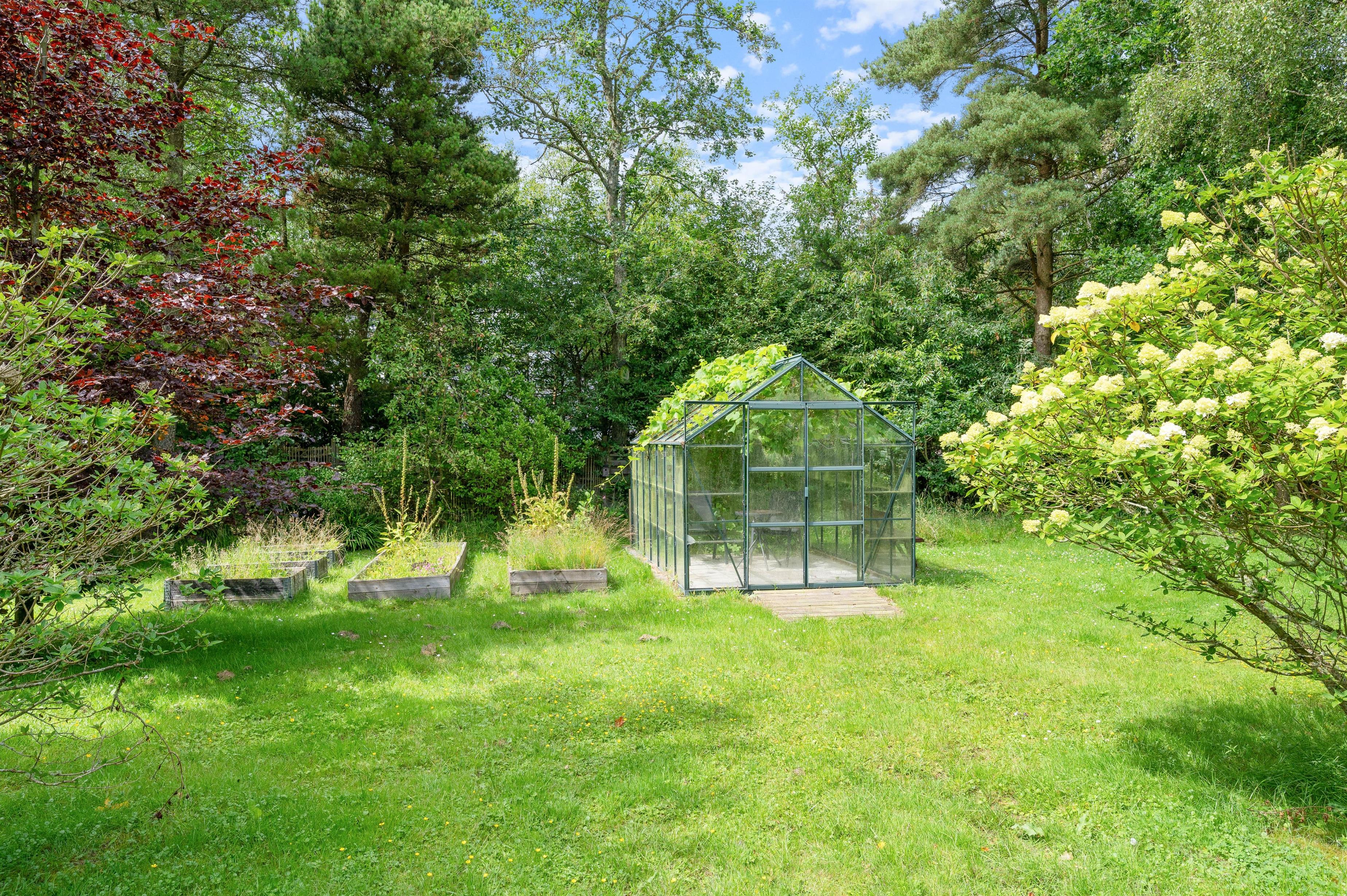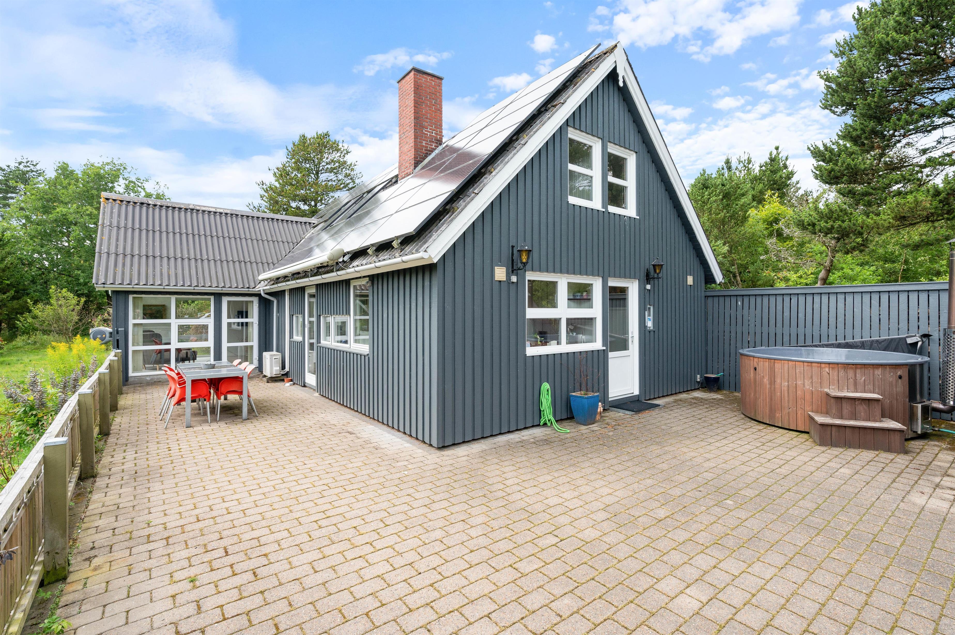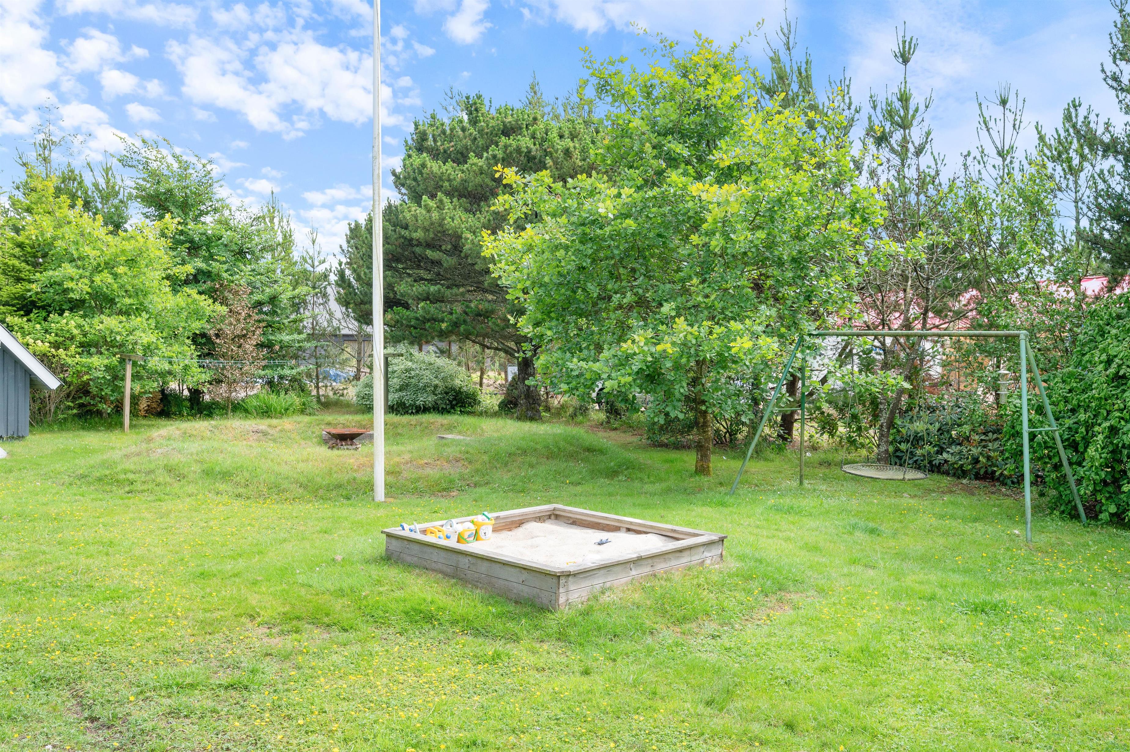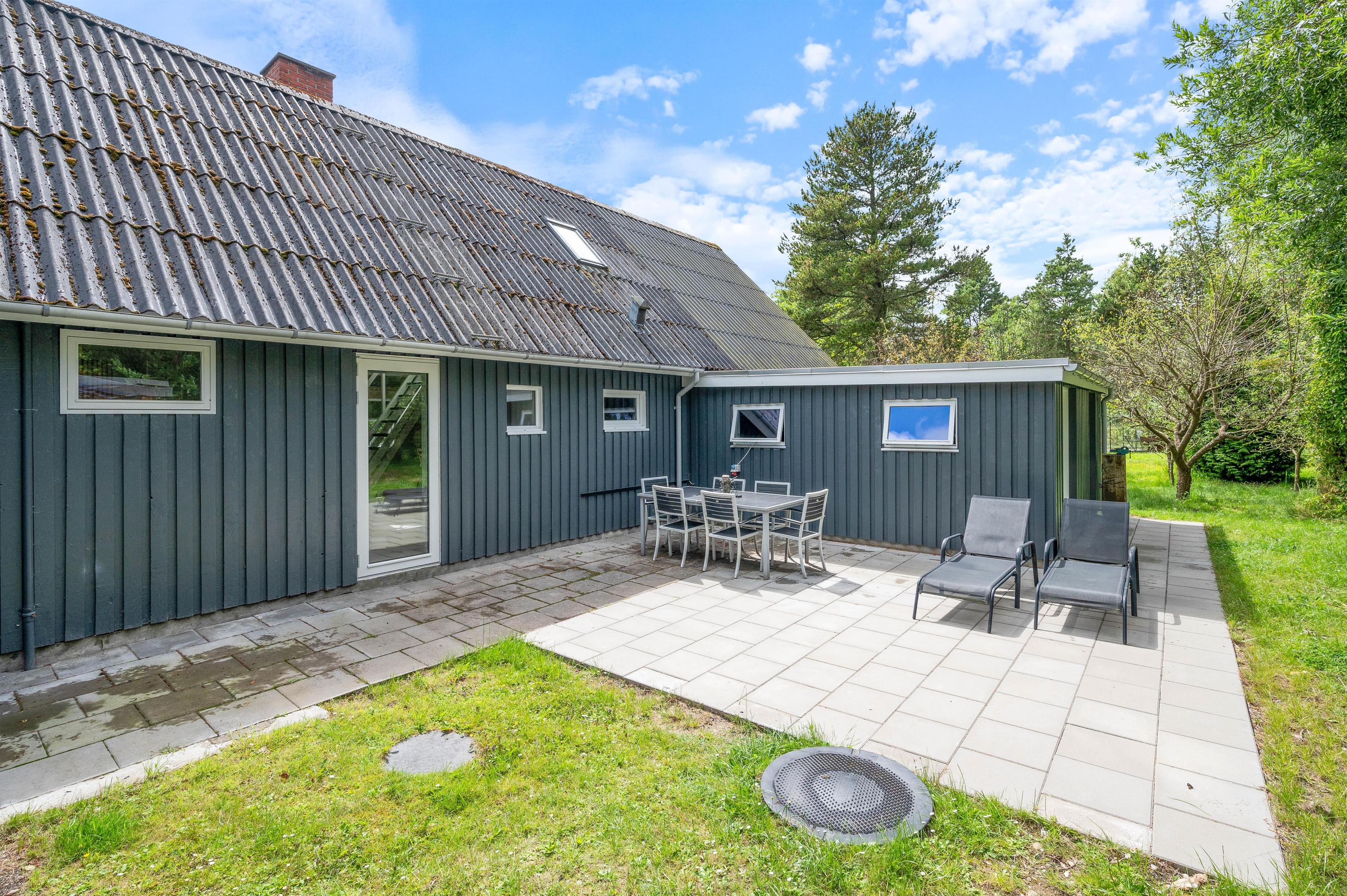 På den åbne terrasse kan I slikke solskin på de komfortable havemøbler. Tag et afslappende bad i vildmarksbadet under stjernehimlen eller tænd op i grillen, og slut dagen af med et lækkert grillmåltid sammen, imens skyggerne bliver lange. Til de små er der sandkasse og gynger. Sammen kan i gå på opdagelse på den 3000 kvm store plænegrund, omkranset af høje træer og med hyggelige pletter at samles på, spille boldspil eller et spil viking.