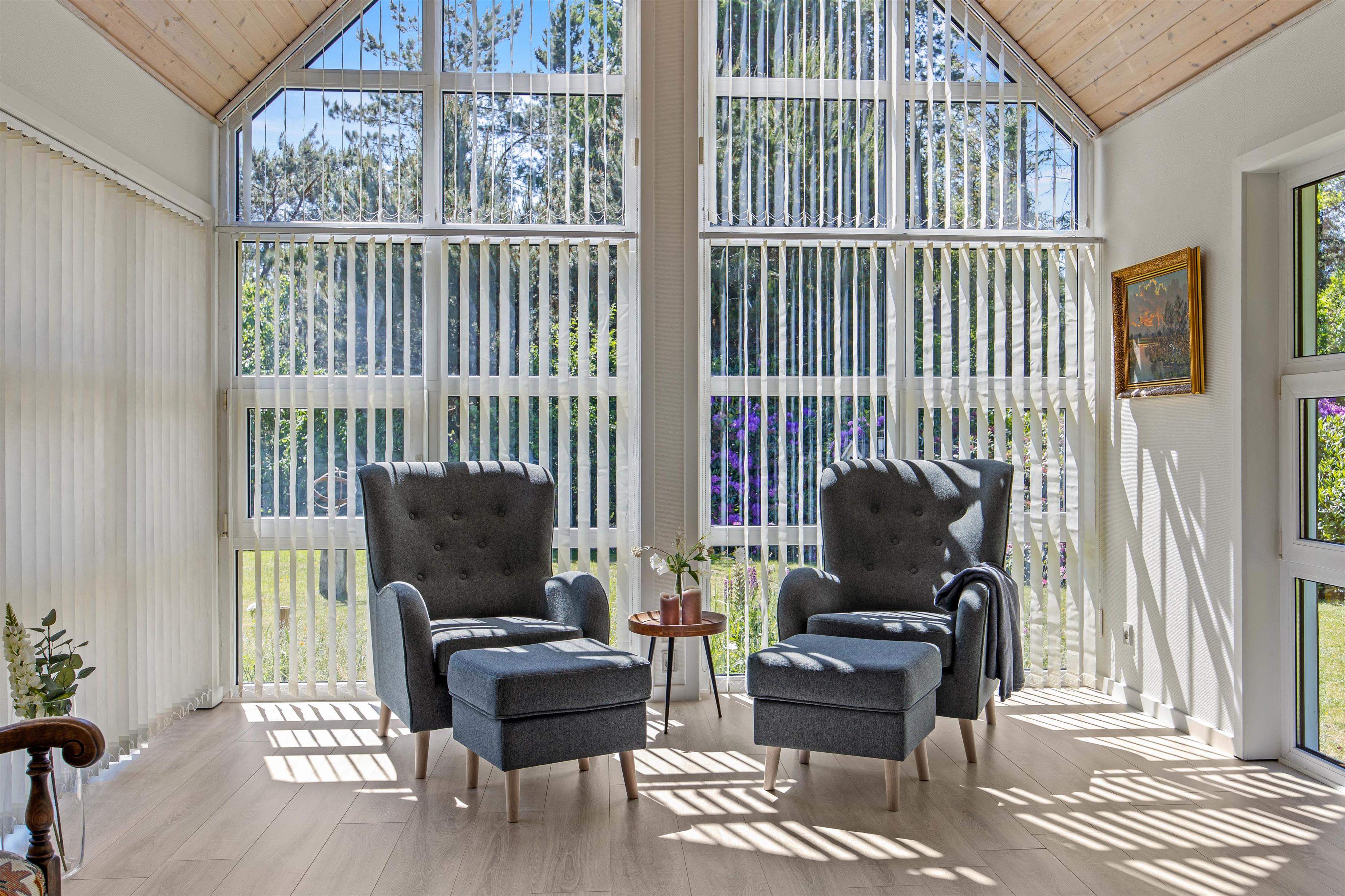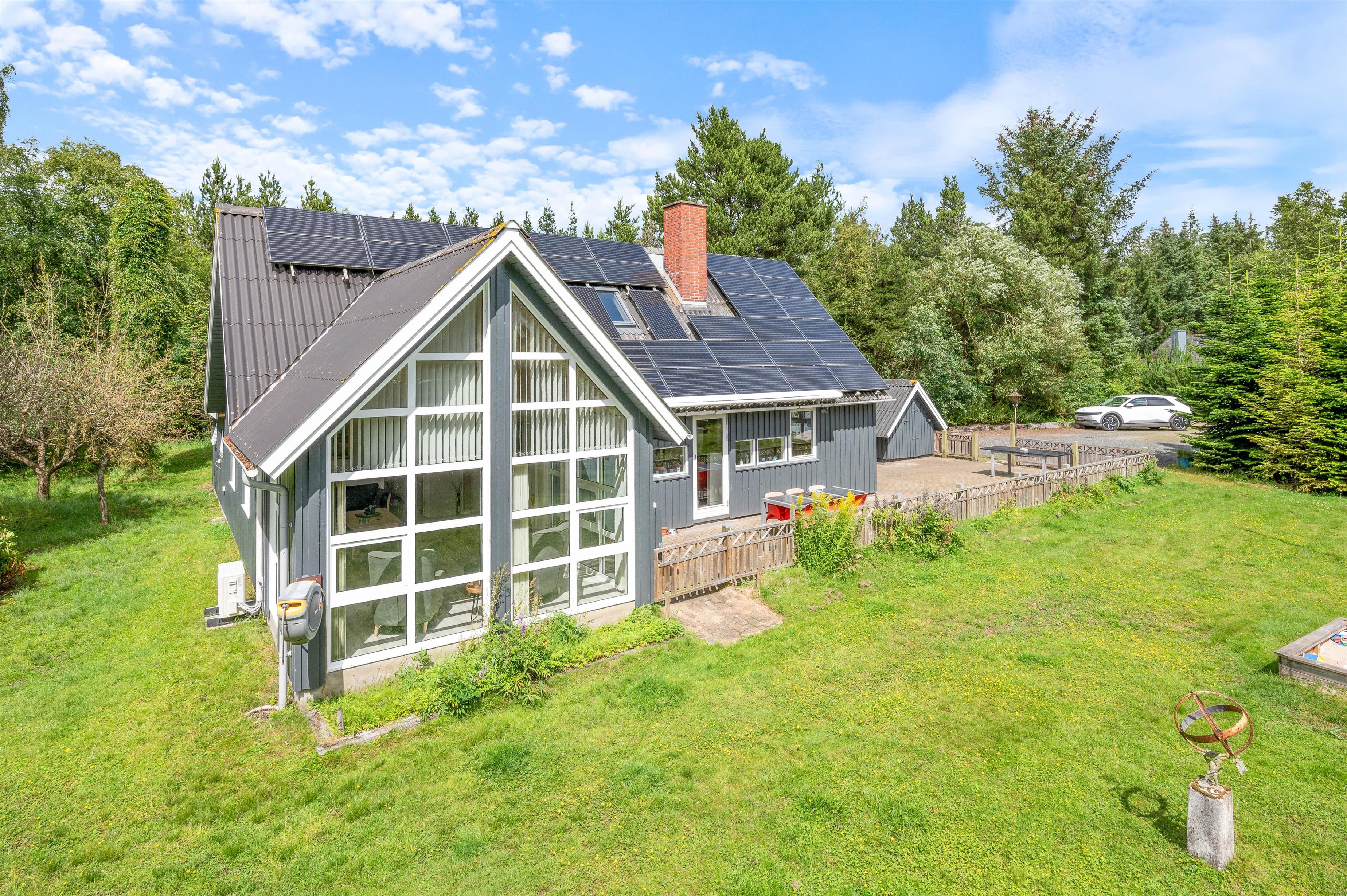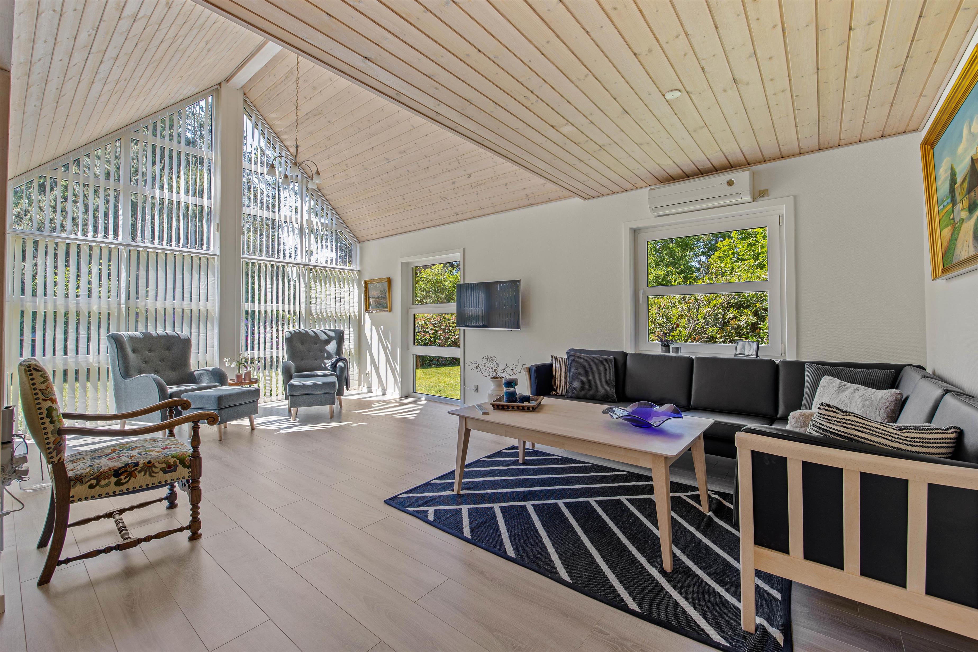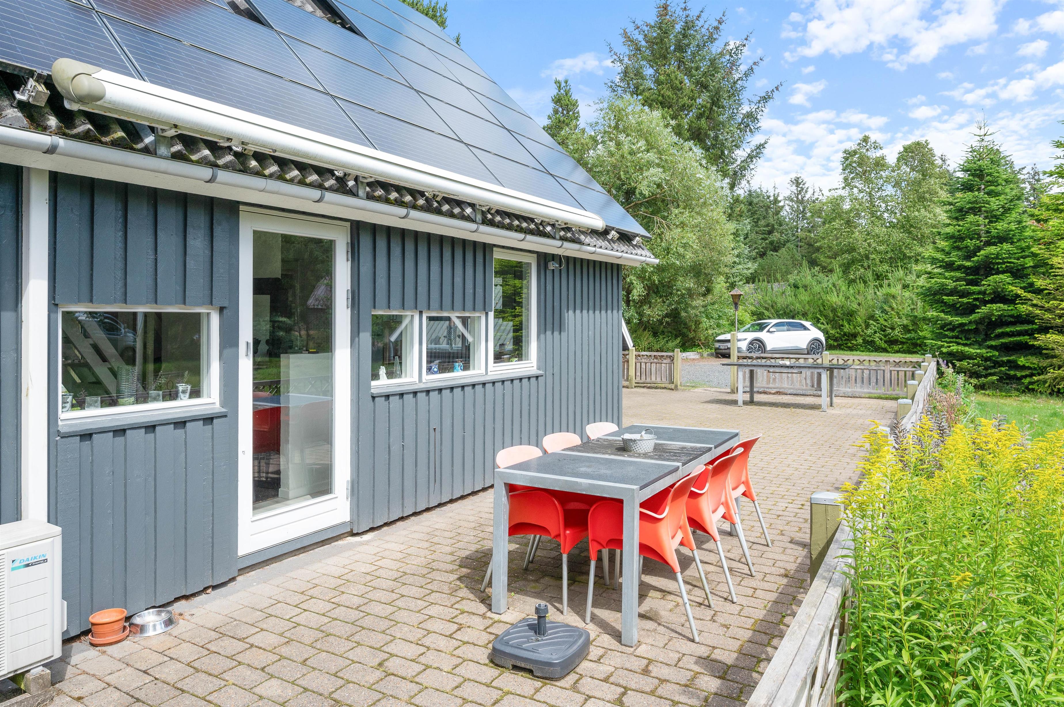 På den åbne terrasse kan I slikke solskin på de komfortable havemøbler. Tag et afslappende bad i vildmarksbadet under stjernehimlen eller tænd op i grillen, og slut dagen af med et lækkert grillmåltid sammen, imens skyggerne bliver lange. Til de små er der sandkasse og gynger. Sammen kan i gå på opdagelse på den 3000 kvm store plænegrund, omkranset af høje træer og med hyggelige pletter at samles på, spille boldspil eller et spil viking.