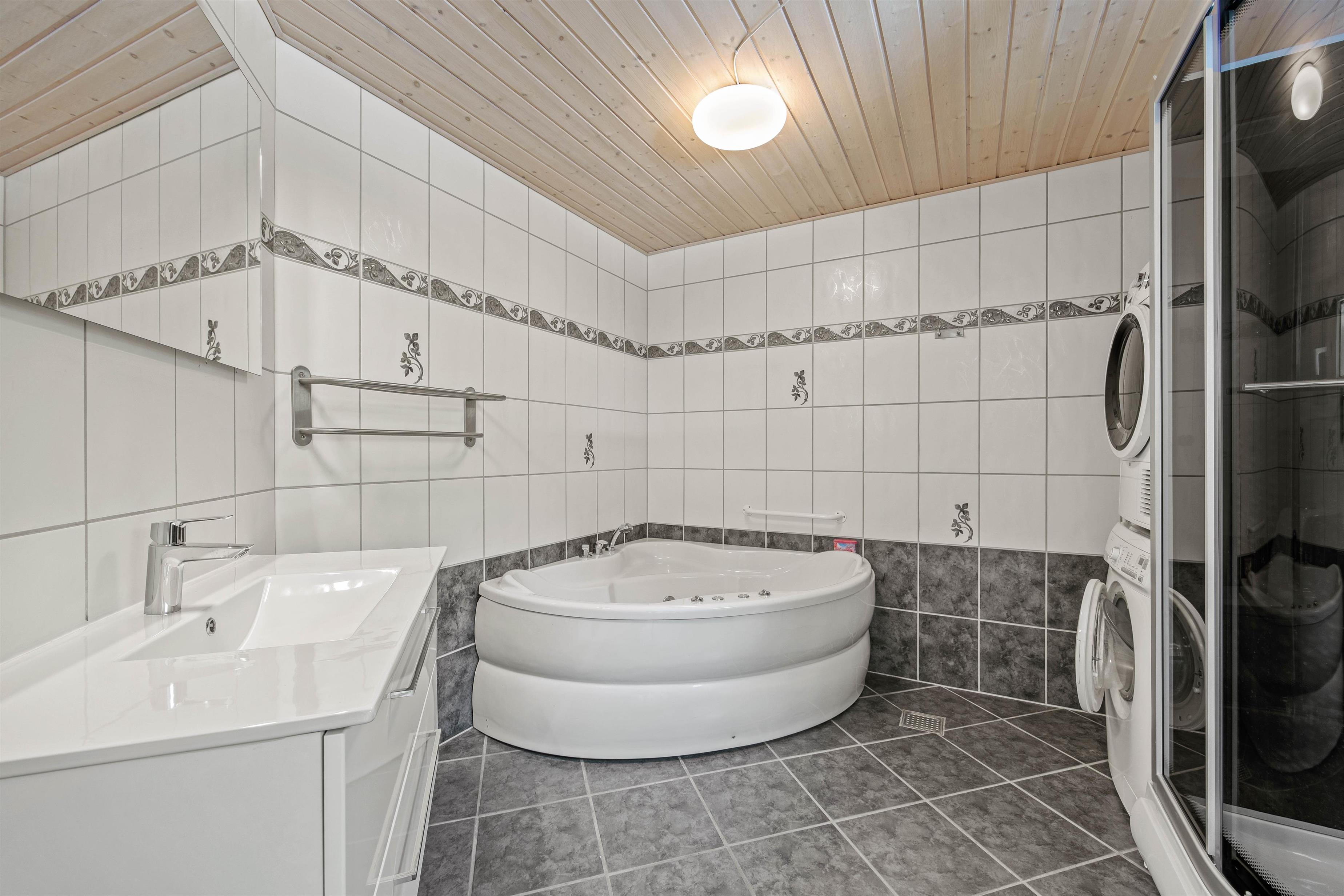 De 2 badeværelser har gulvvarme, så I ikke behøver at frygte kø eller kolde fødder under tandbørstningen. I det ene er også et spabad, så I kan slappe af med lidt wellness på ferien. De 4 soveværelser er forsynet med dobbeltsenge, så I kan sove godt ud i den friske vesterhavsluft. I behøver ikke at undvære moderne fornødenheder, som vaskemaskine, tørretumbler, opvaskemaskine og en energibesparende varmepumpe på ferien.