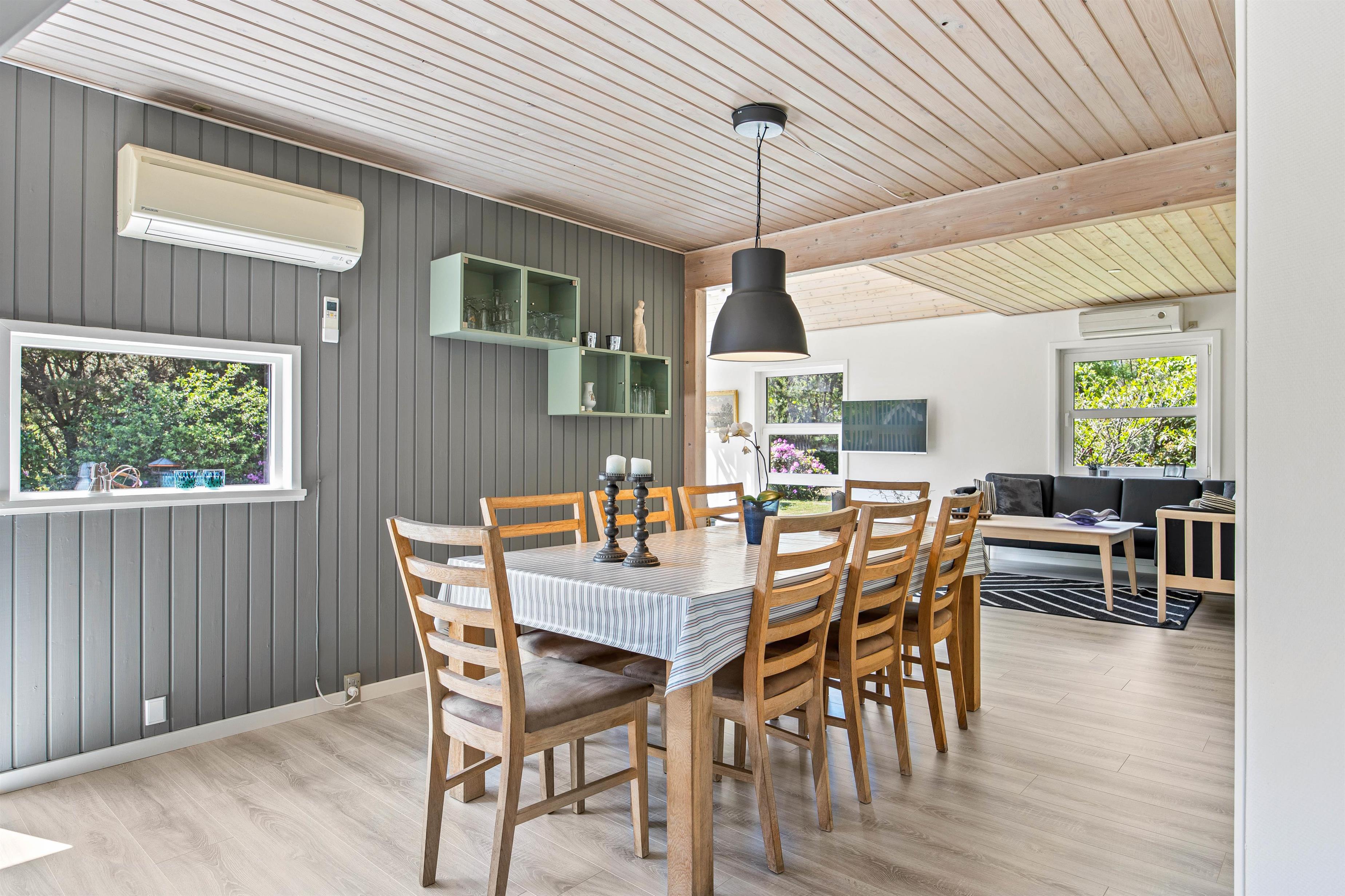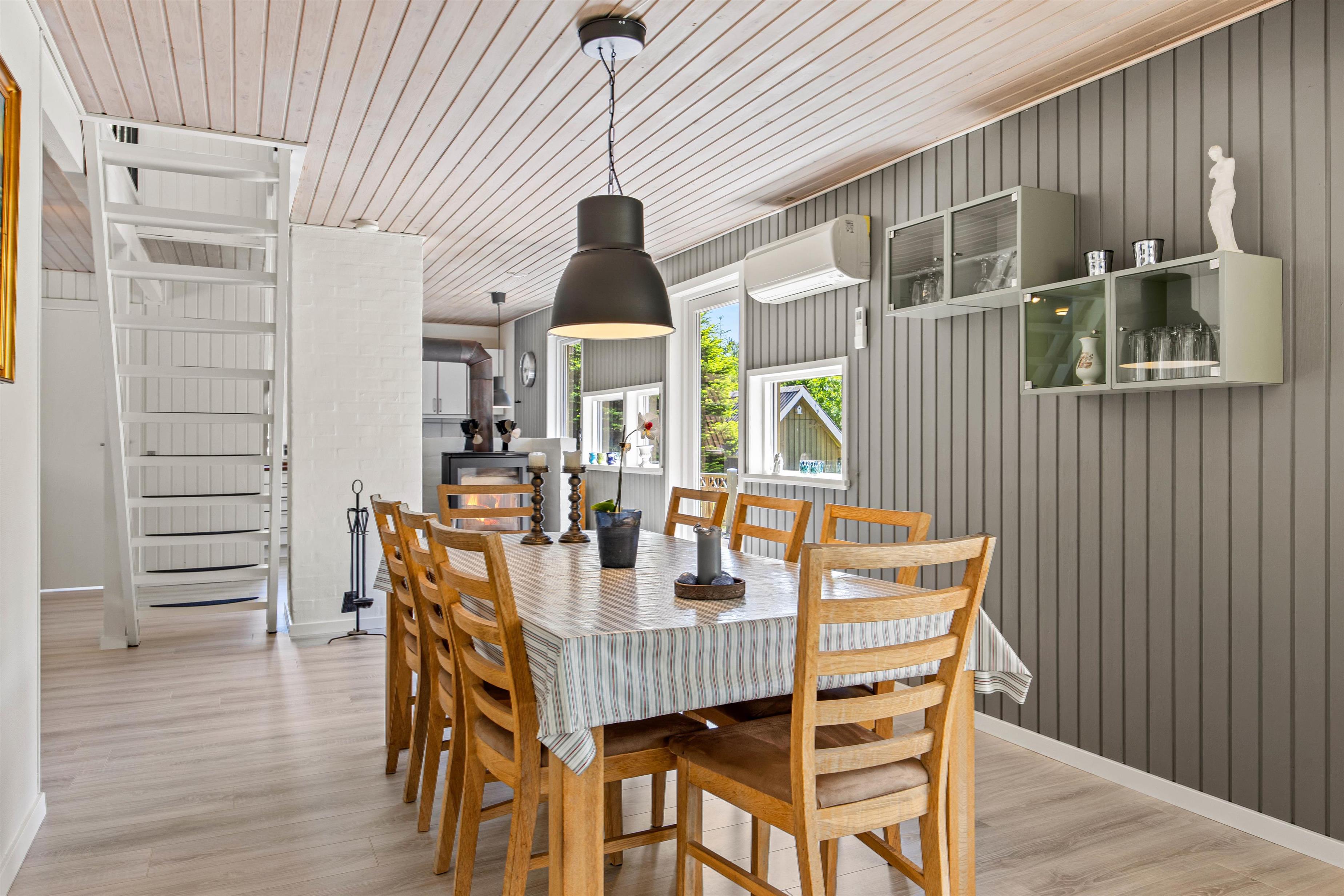 På Dalen 21 vil I føle jer hjemme straks, I træder ind ad døren til det charmerende sommerhus. I opholdsstuen er et fint lysindfald gennem glasvæggen i gavlen, her kan I hygge jer ved varmen fra brændeovnen, spille et spil eller se en film sammen på TV. Køkkenet indeholder alt, hvad I behøver for at forkæle hinanden med hjemmelavede måltider, uanset om I ønsker simreretter, en fiskedag eller byg-selv-burger.