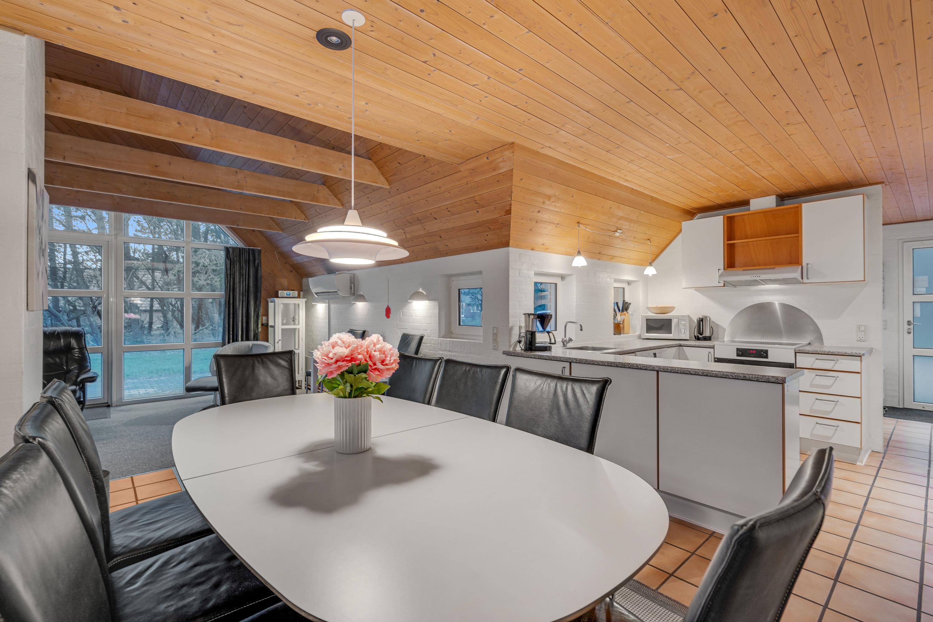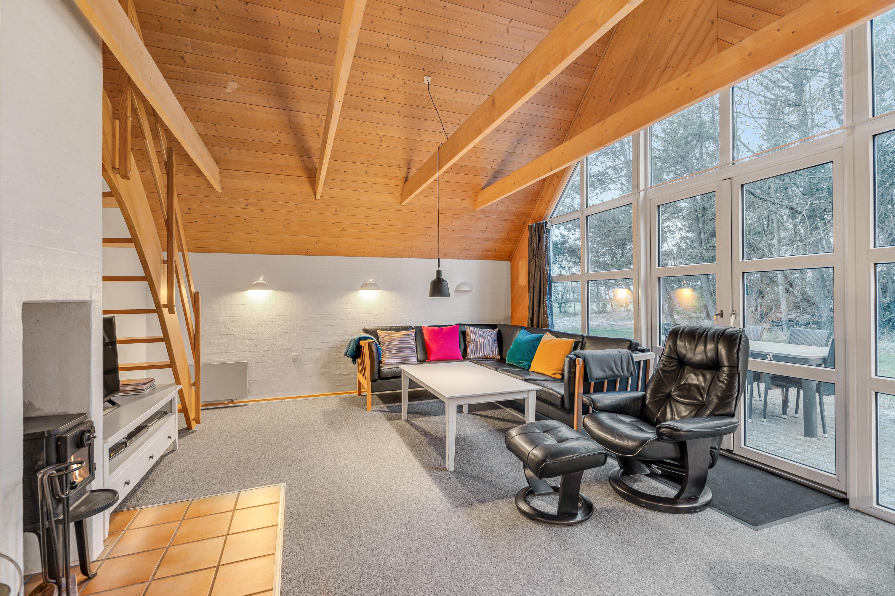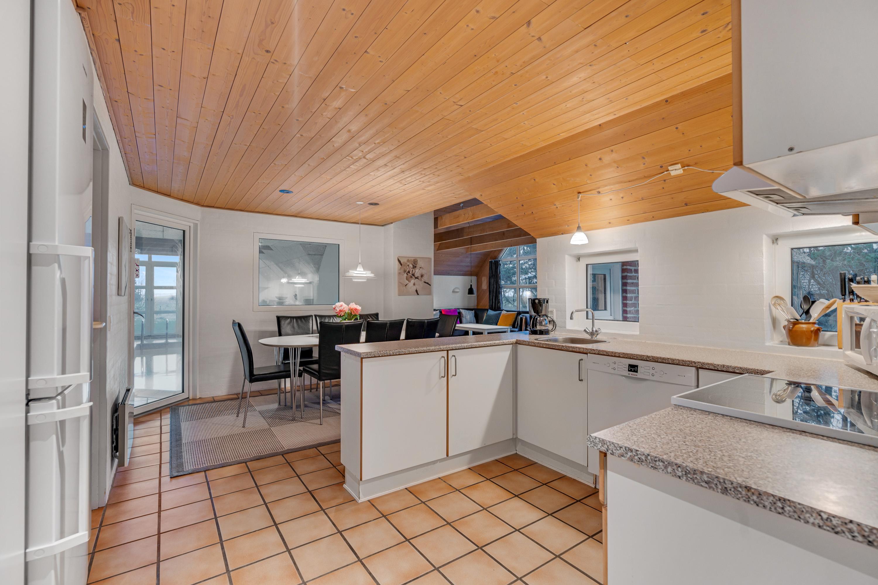 Køkken, stue og spiseplads ligger i åben forbindelse i sommerhusets alrum. Alrummet indbyder til mange hyggelige feriestunder med madlavning, spil og film. Brændeovnen sørger for, at den hyggelige feriestemning er i top.