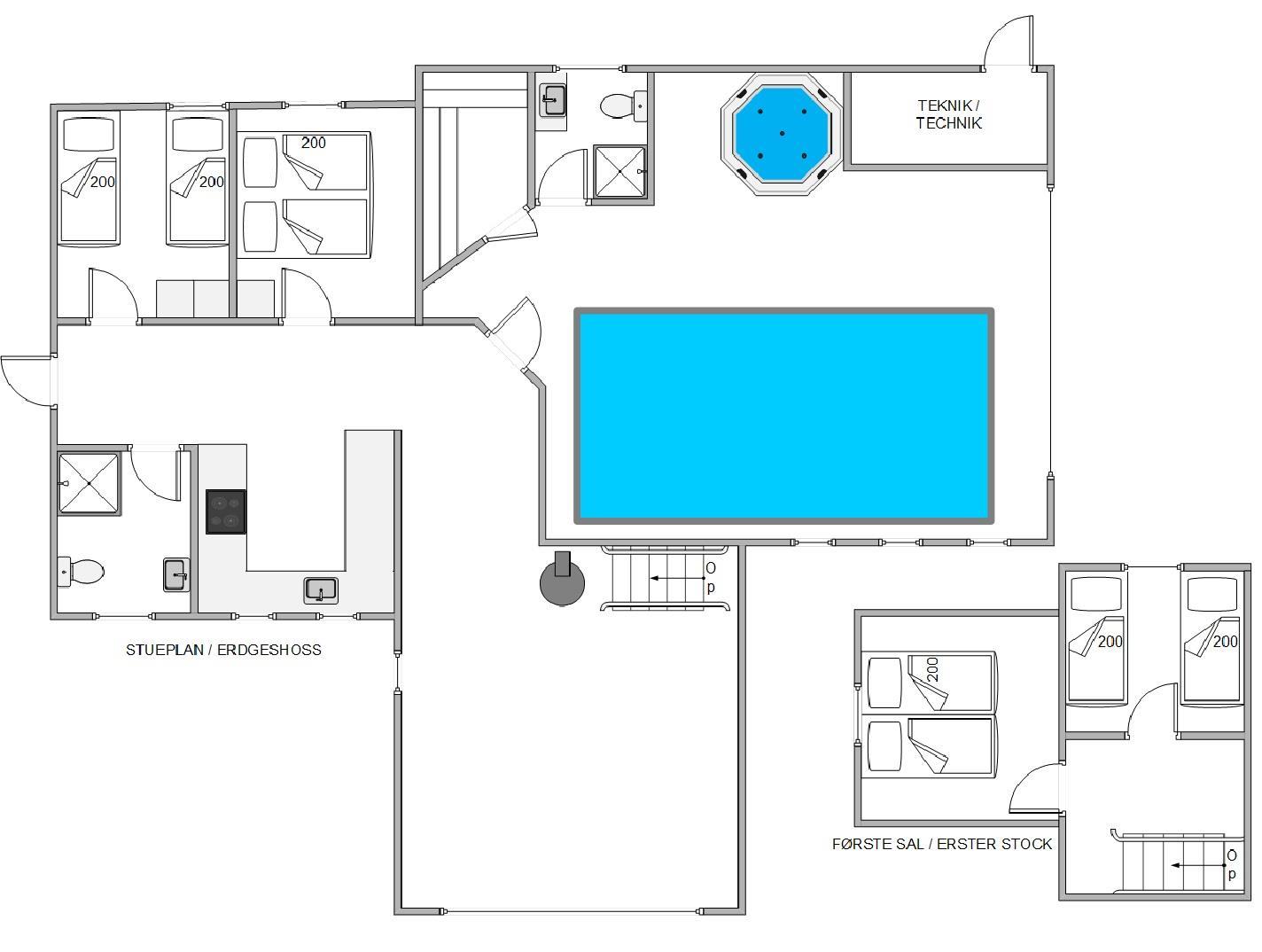 I sommerhuset er der god plads til alle 9 feriegæster. På sommerhusets 179 kvadratmeter er der 4 soveværelser, hvoraf 2 er at finde på førstesalen, og de resterende 2 er at finde i stueetagen. I sommerhuset er der desuden 2 mindre badeværelser, der begge er udstyret med gulvvarme.