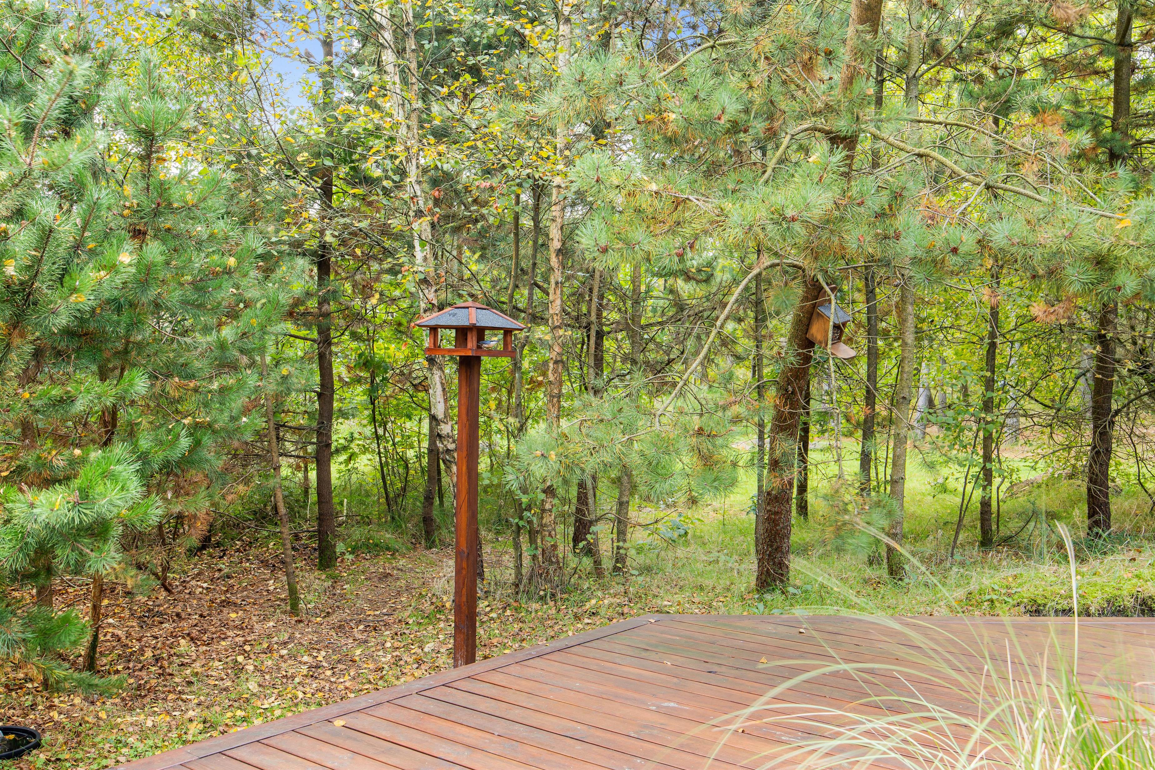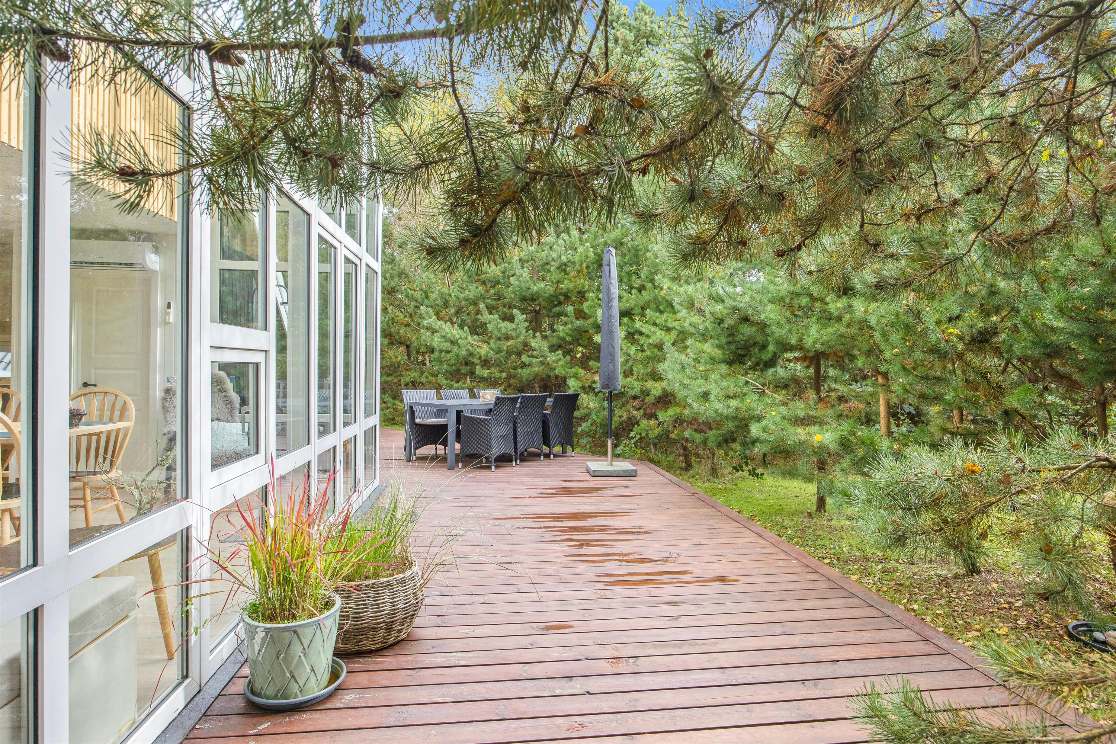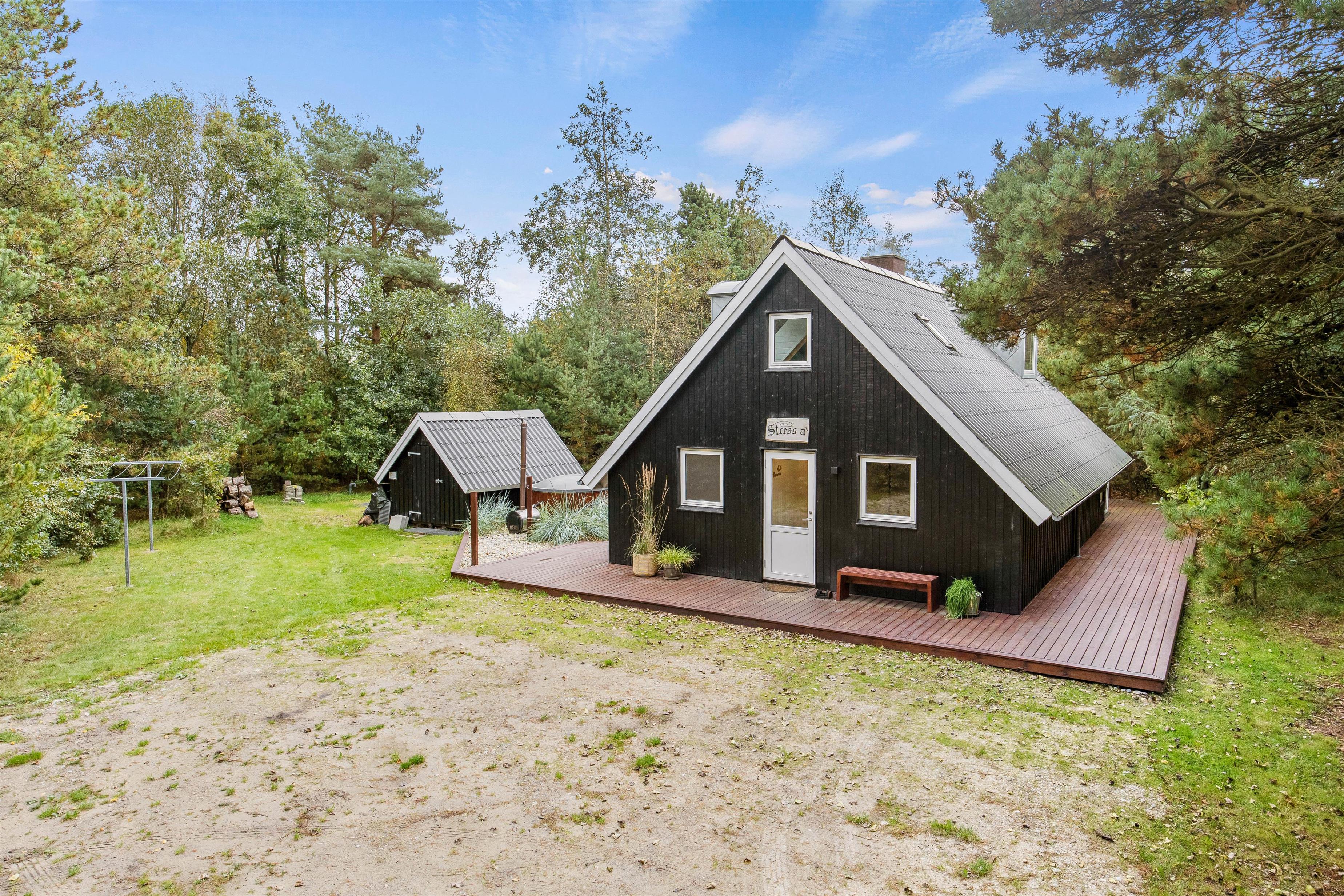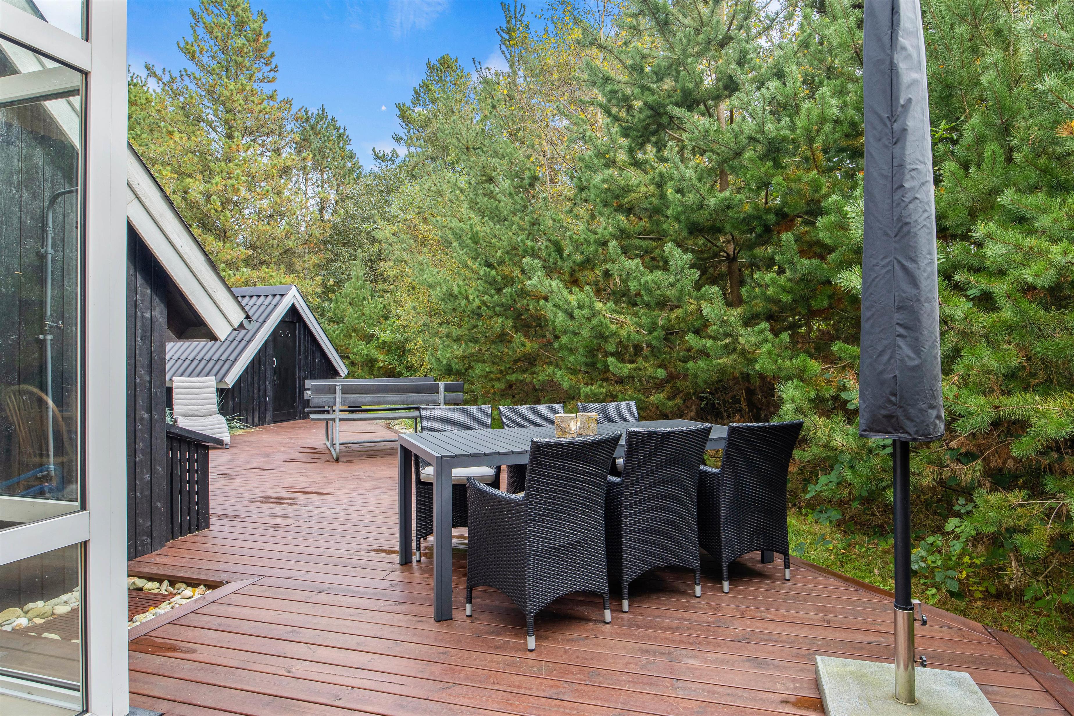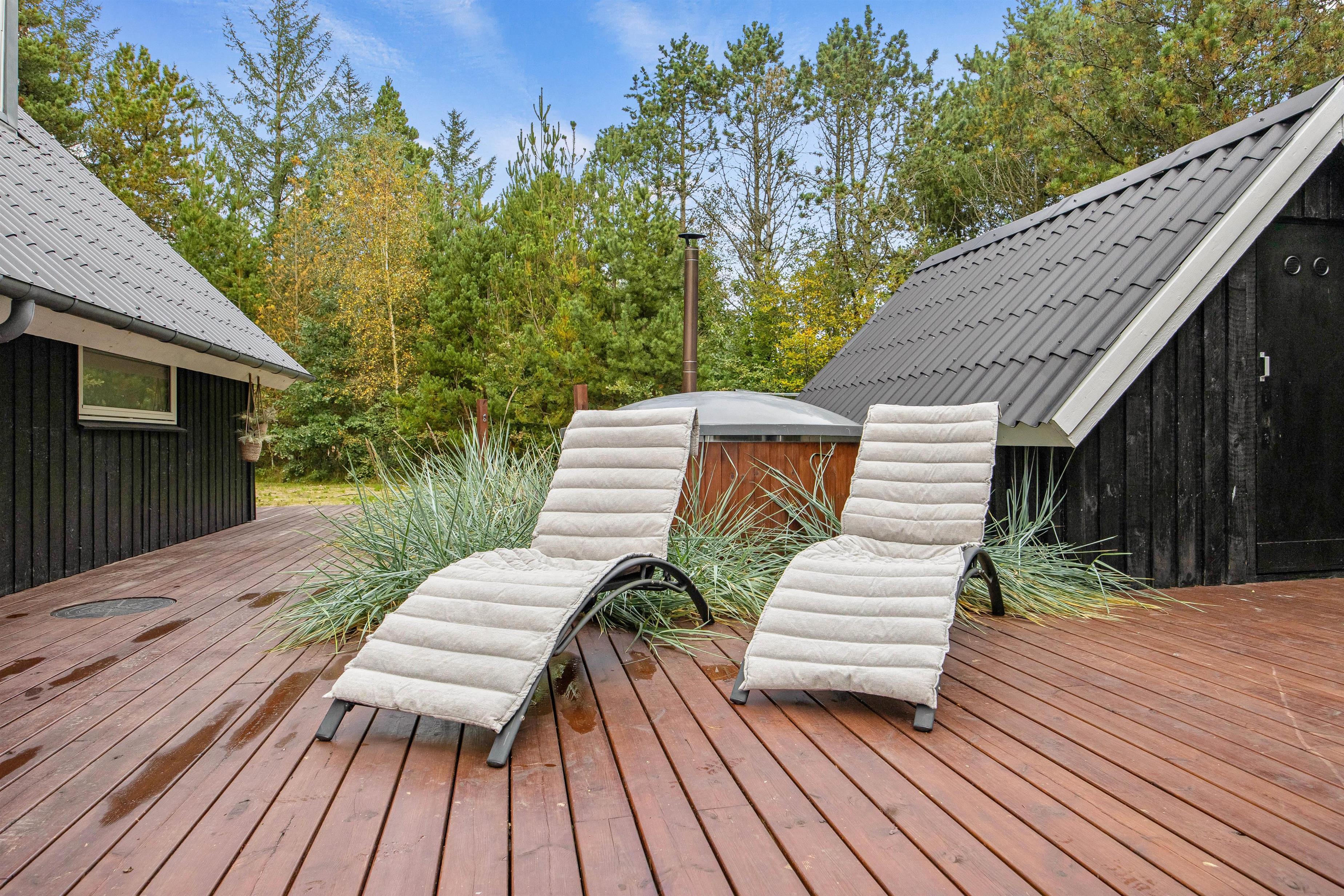 På sommerhusets udeområde venter jer flere højdepunkter; nemlig vildmarksbadet og udesaunaen. Sæt jer godt til rette i vildmarksbadet og nyd en afslappende stund i det varme vand under åben himmel. Efterfølgende kan I sætte jer ind i den skønne udesauna. I har desuden en udebruser, hvor I kan få skyllet sandet af jer efter en tur ved Vesterhavet. Udebruser er lukket fra 1. november til 1. april på grund af frostsikring.