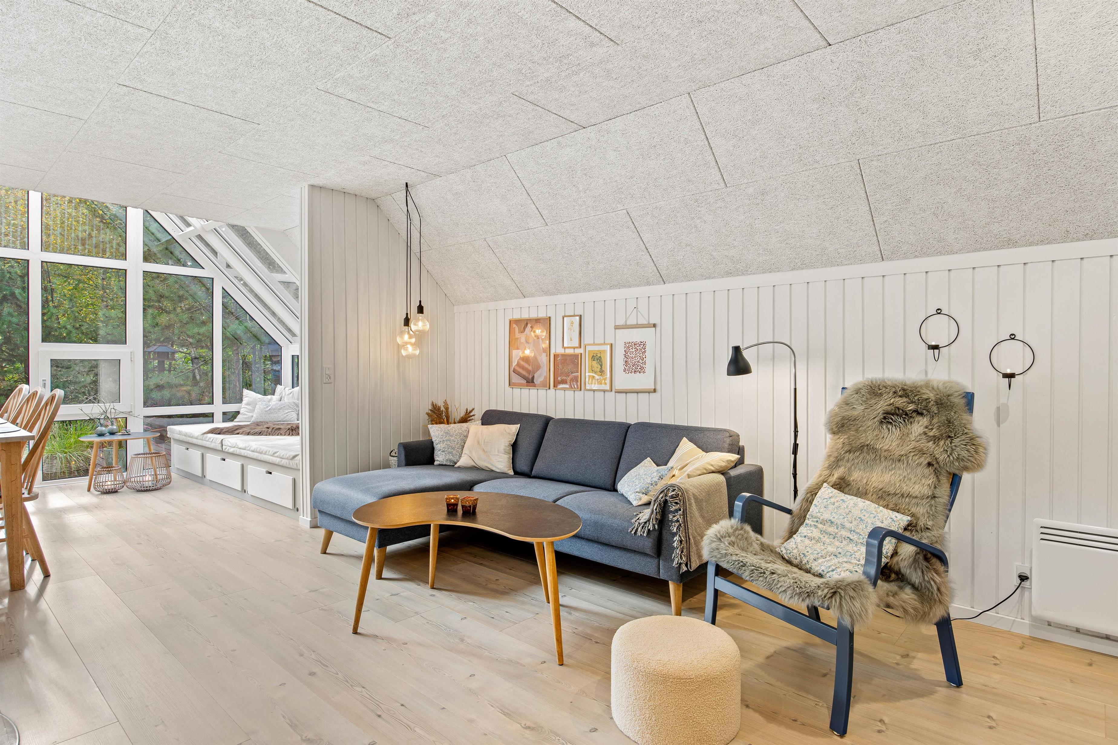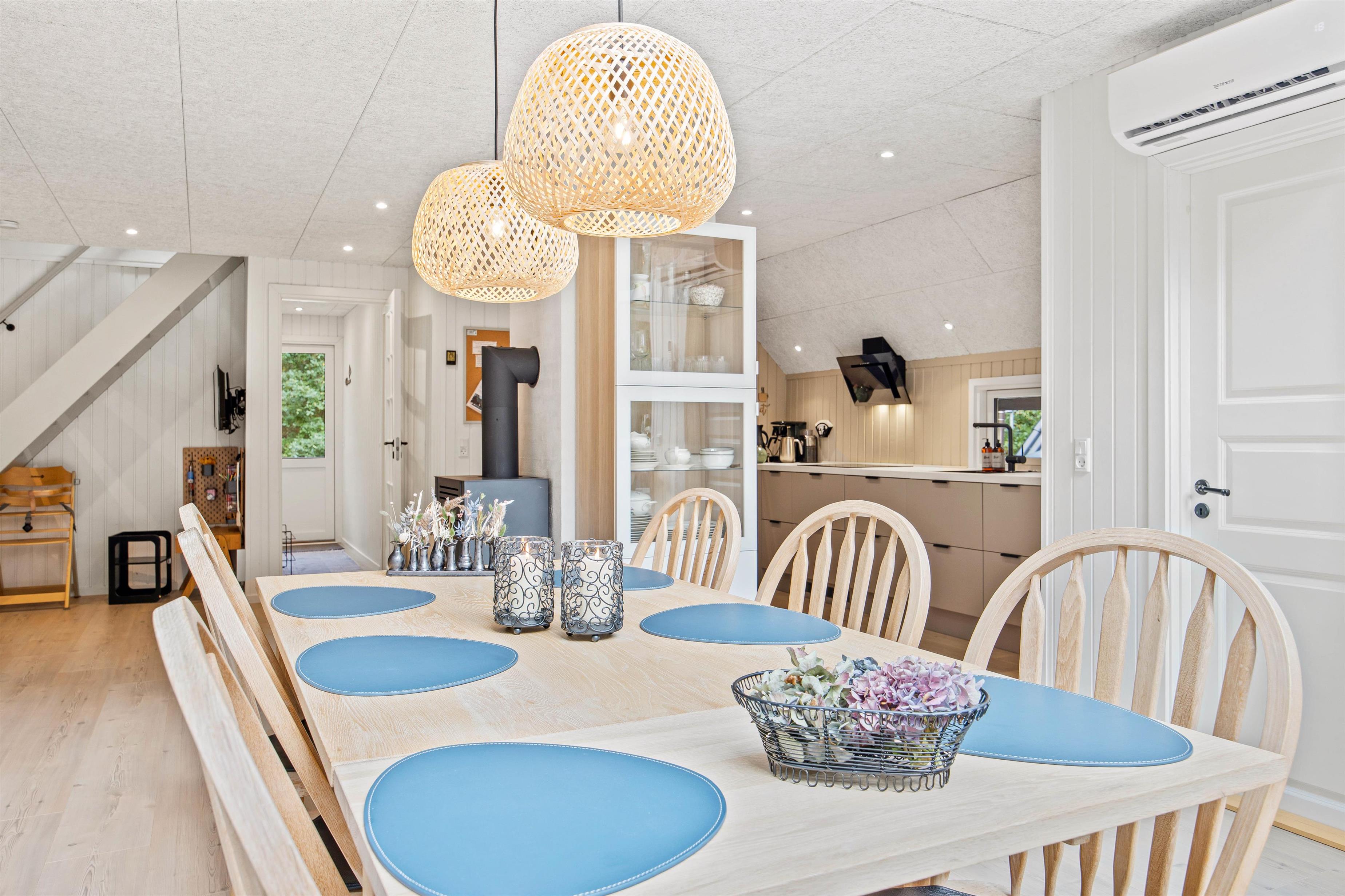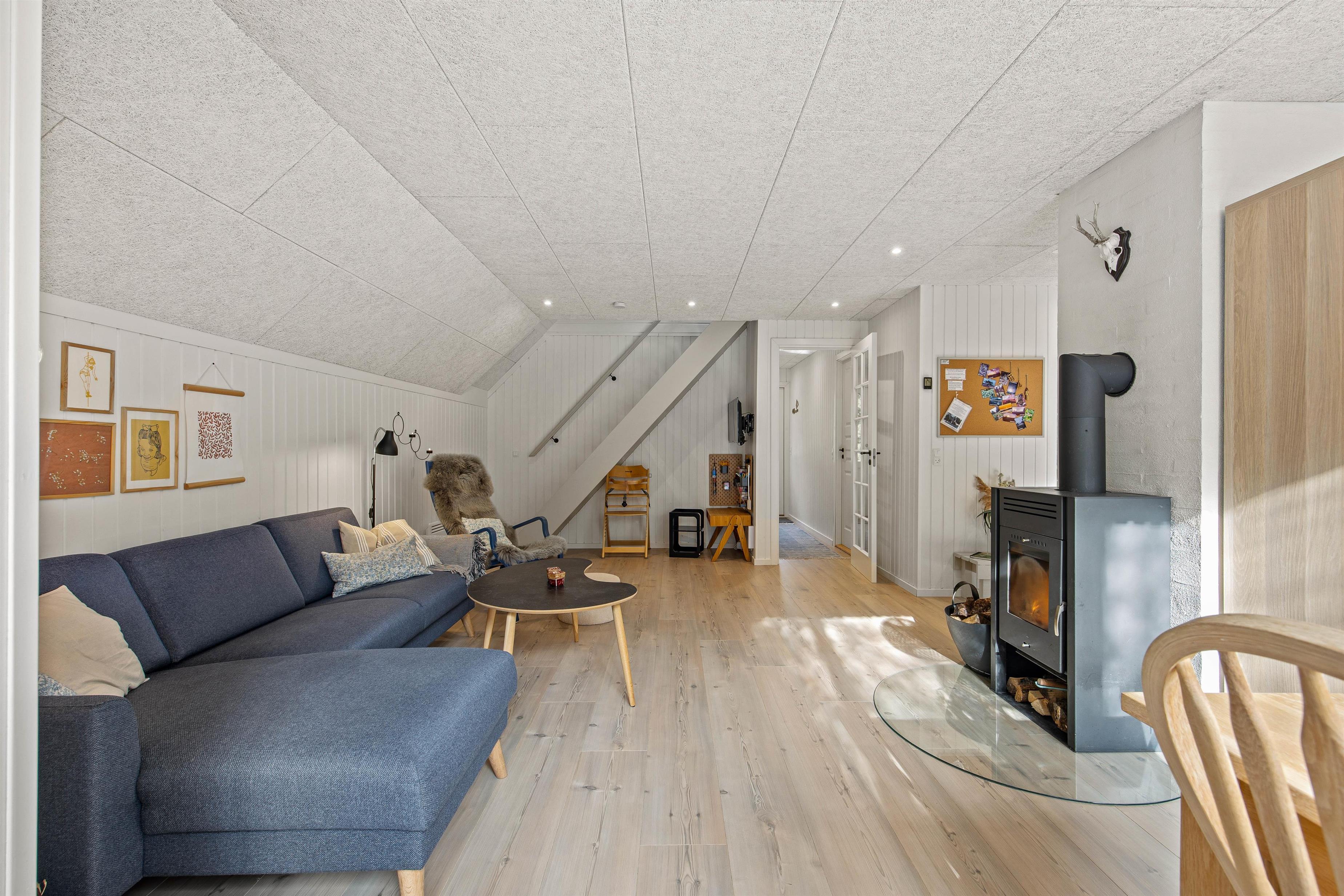 I sommerhusets stue kan I samles til hyggelige feriestunder for hele familien. Her kan I blandt andet samles foran tv’et og streame jeres yndlingsfilm via Chromecasten. I stuen er der en energibesparende varmepumpe, der sikrer, at I altid har et godt indeklima på ferien.