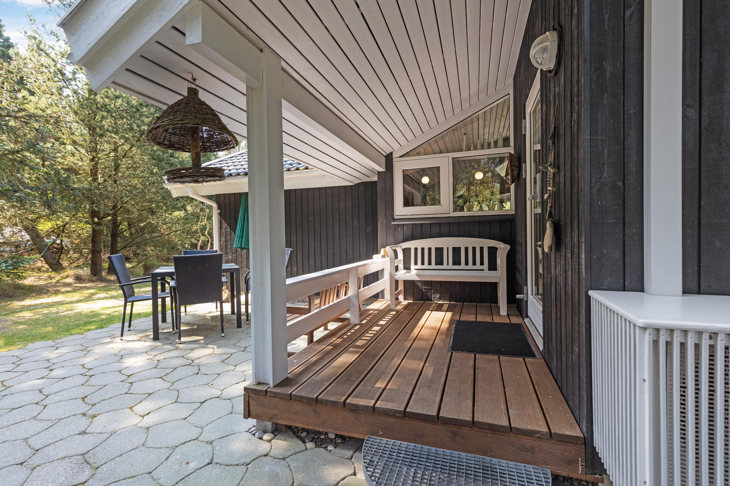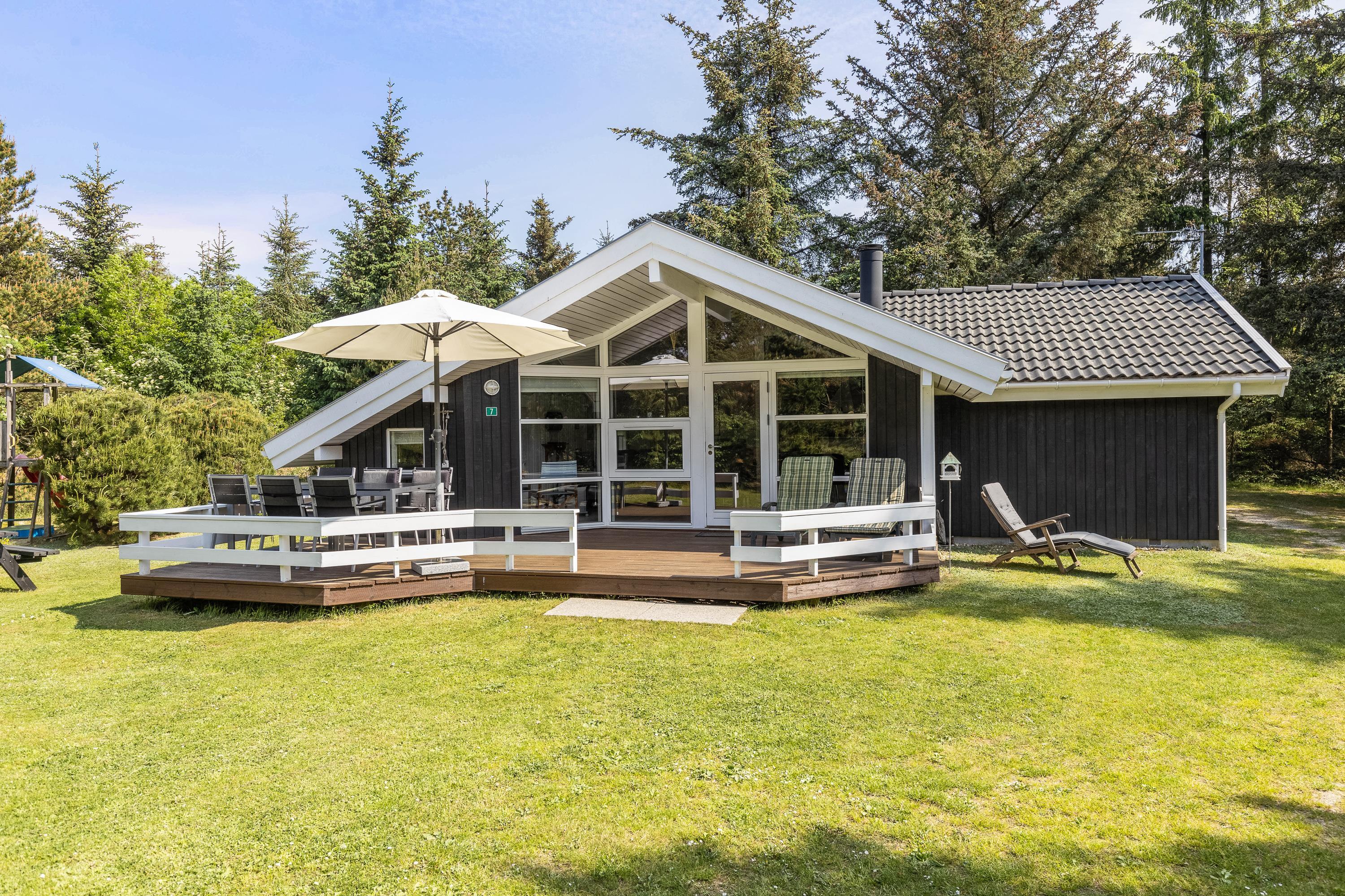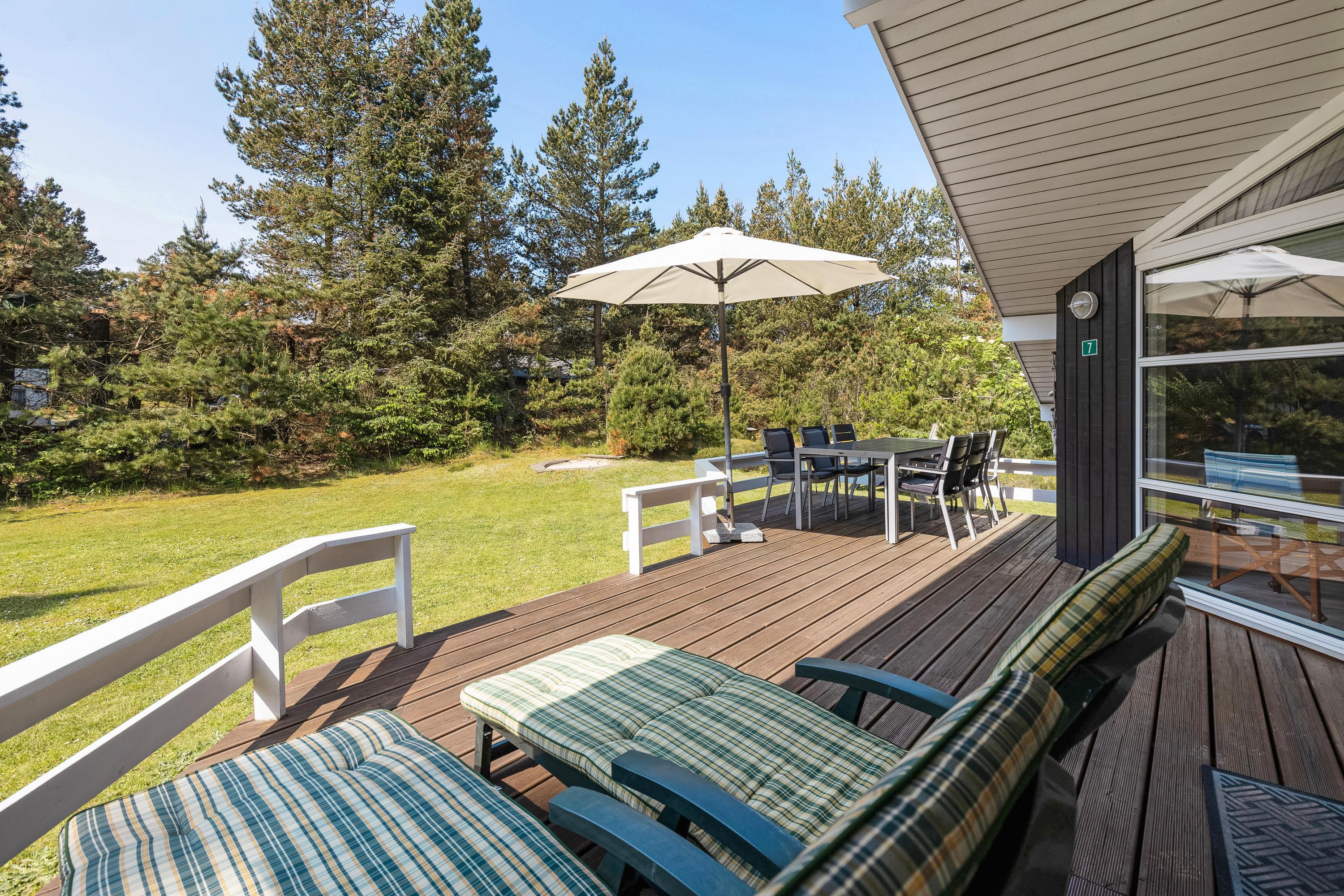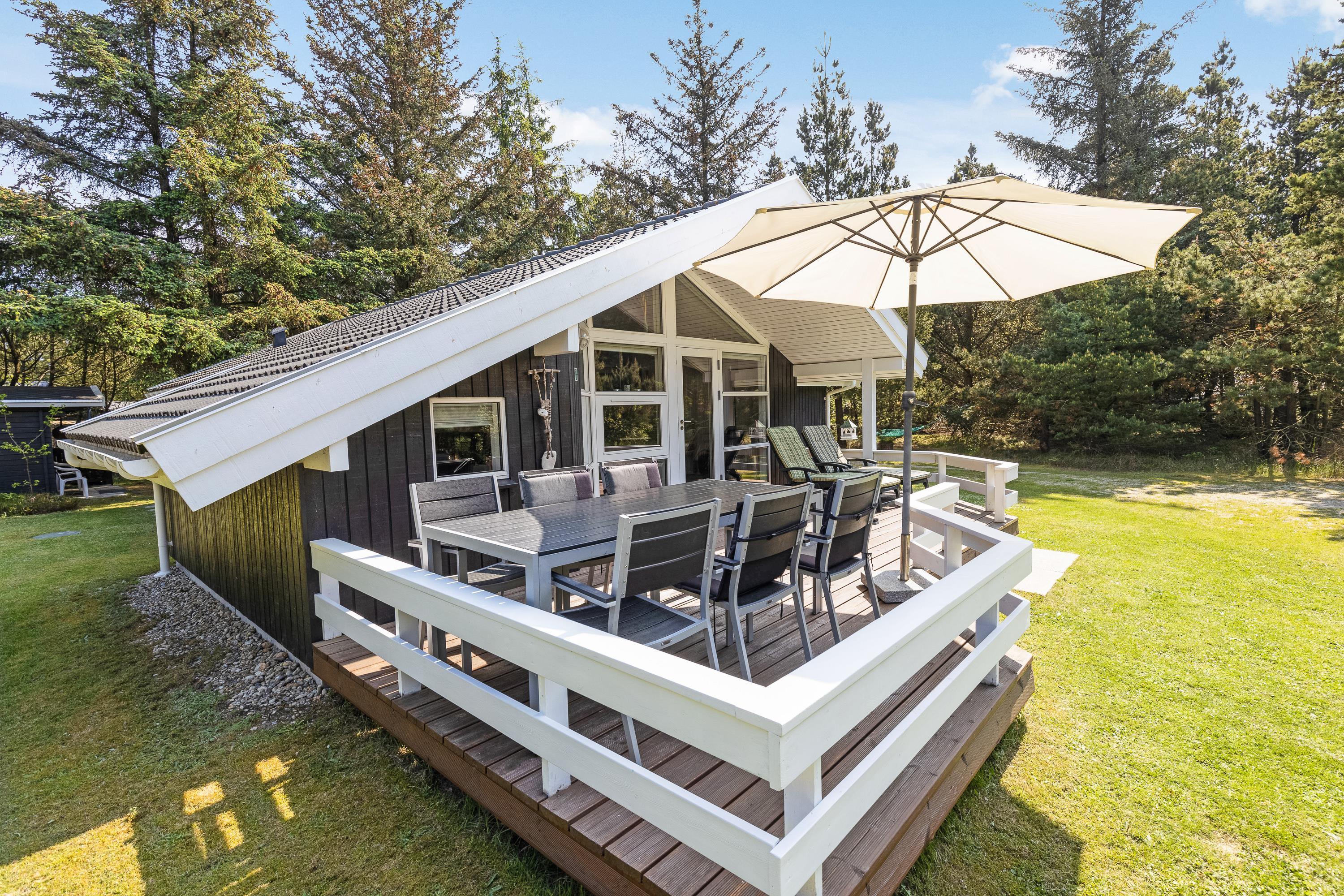 Sommerhuset har 2 terrasser, som befinder sig på hver sin side af feriehuset. Det vil sige, at I både har morgen- og aftensol, og I kan derfor nyde solen hele dagen. Terrasserne er selvfølgelig udstyret med diverse havemøbler, liggestole og en grill. Desuden finder I på terrassen en parasol, så I for eksempel kan nyde frokosten udenfor i skyggen.