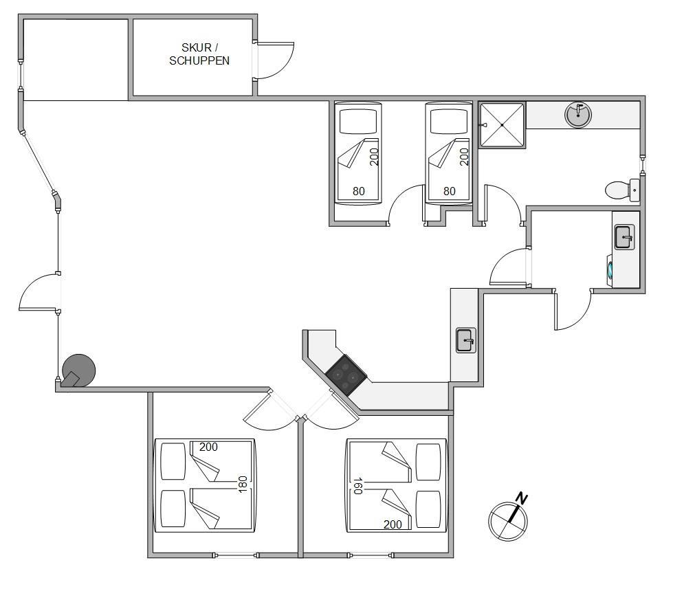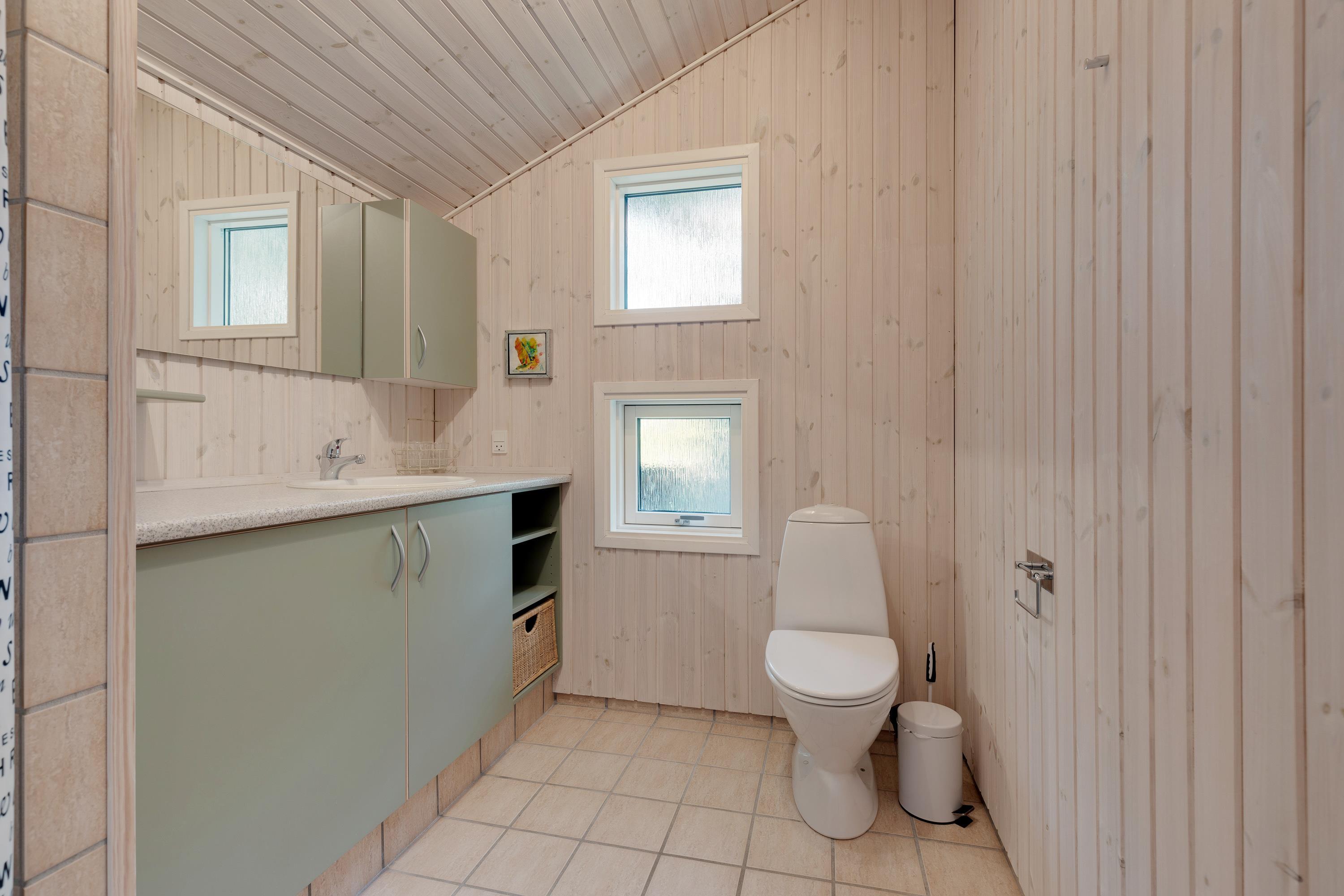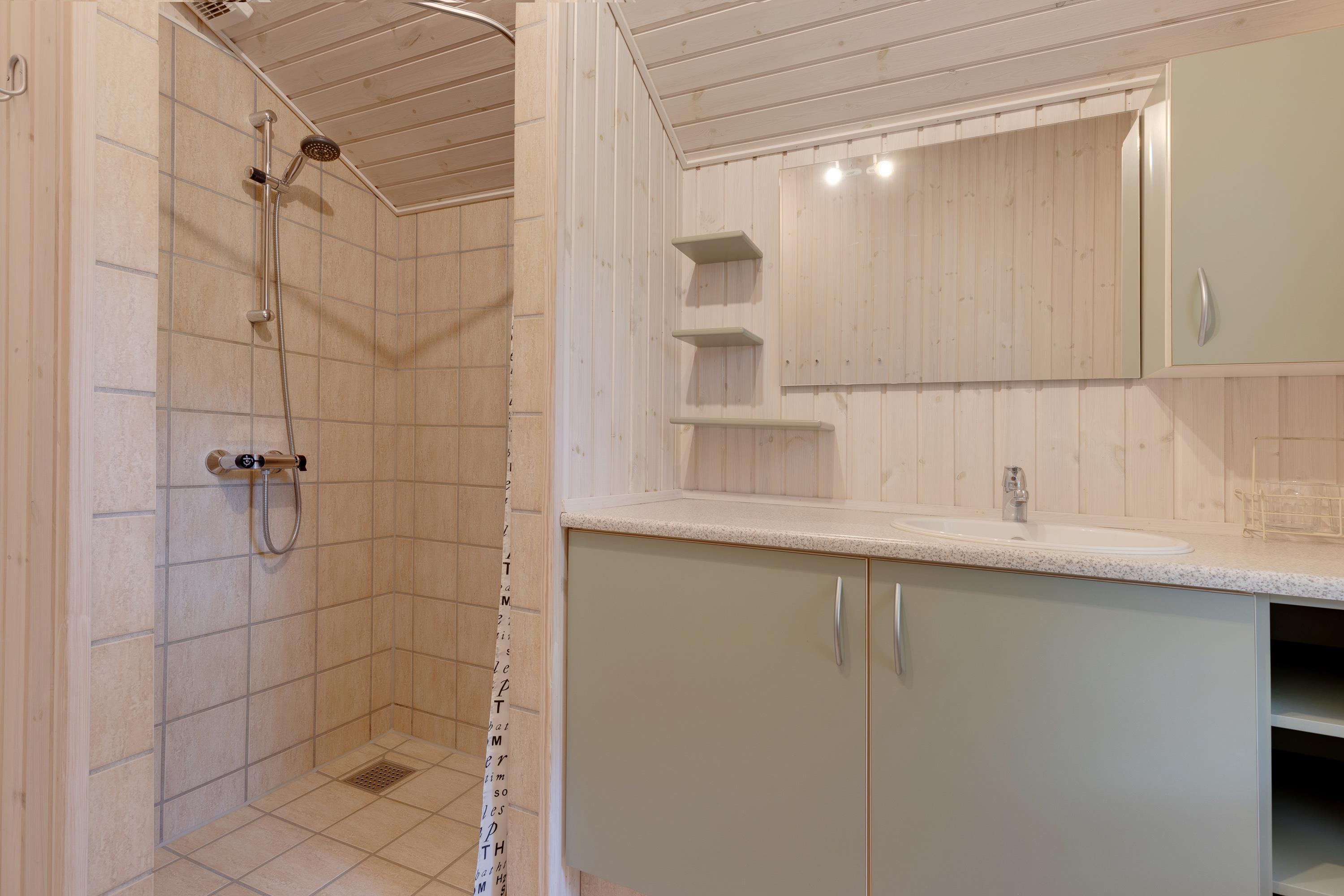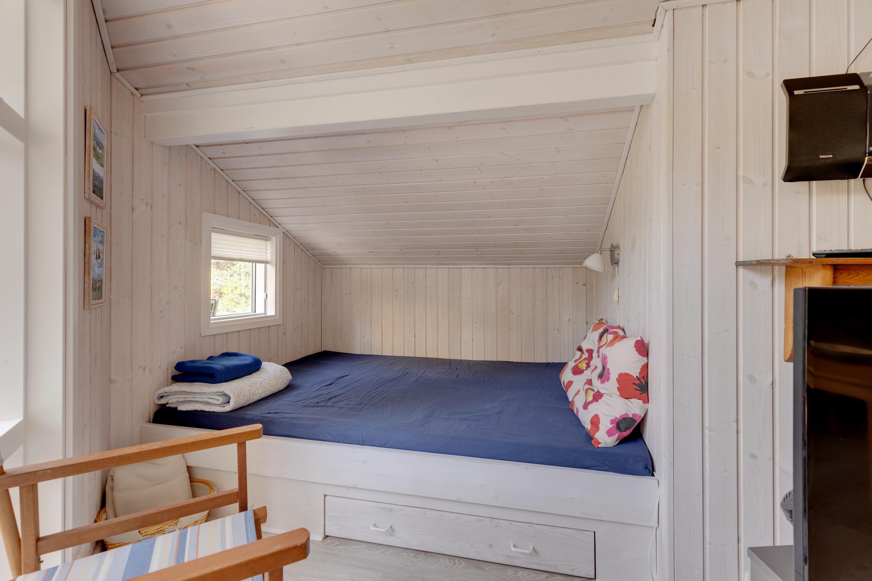 Yderligere finder I en alkove i stuen, hvor gæster eventuelt kan overnatte, eller hvor du kan trække dig tilbage med en god bog i hånden. Sommerhuset har desuden et badeværelse med gulvvarme.