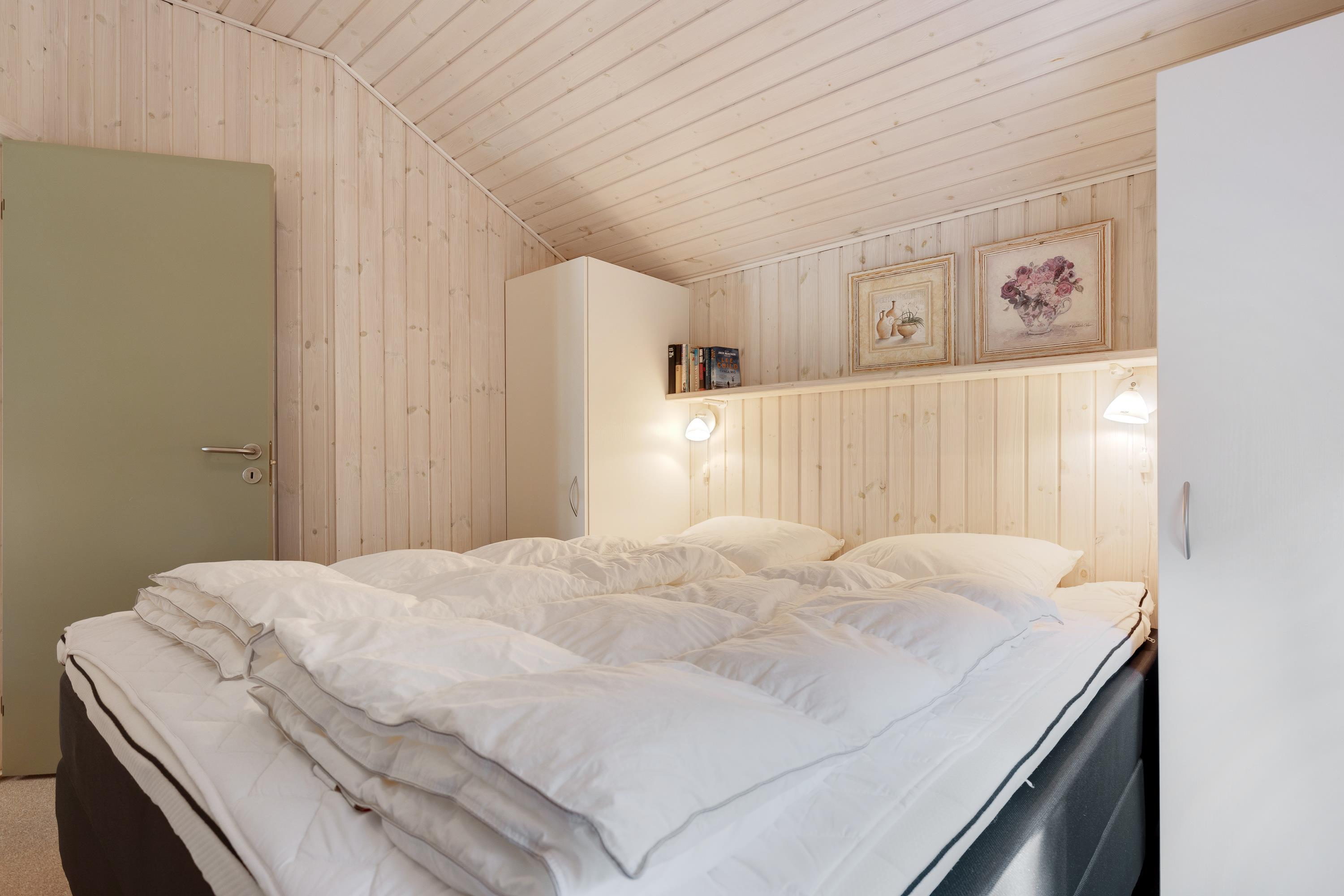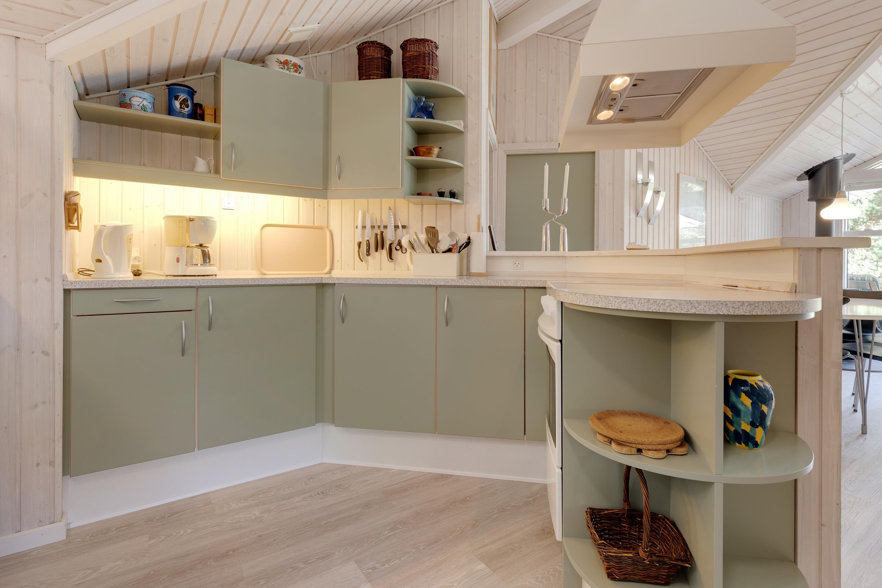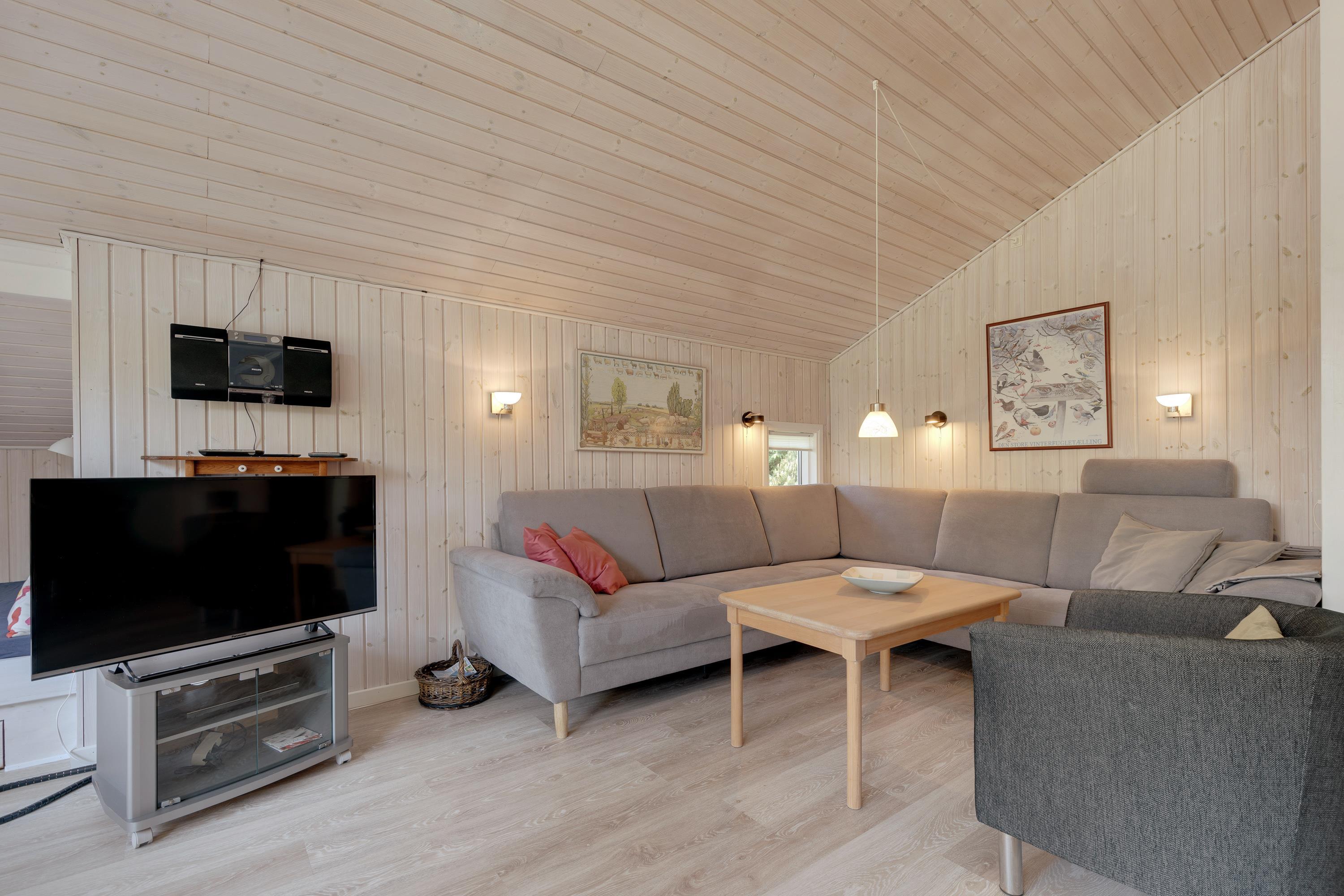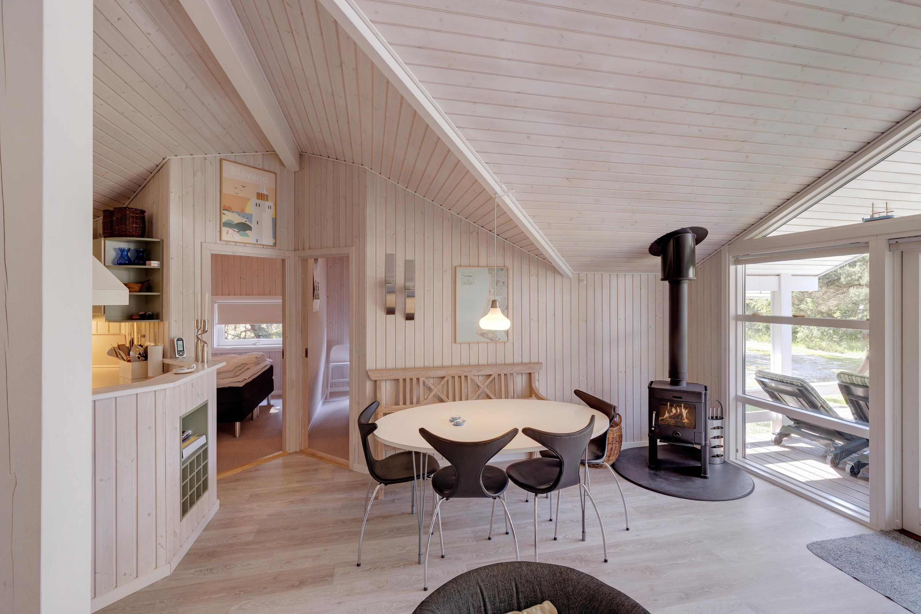 De lyse omgivelser og den gennemførte indretning byder jer straks velkommen, så snart I træder inden for døren. Sommerhuset har loft til kip og tilsammen med brændeovnen skabes der den helt rigtige sommerhusstemning. Hele familien kan samle sig i stuen, og her kan I sætte jeres yndlingsfilm på sommerhusets fladskærms-tv, mens I lytter til de knitrende lyde fra brændeovnen.