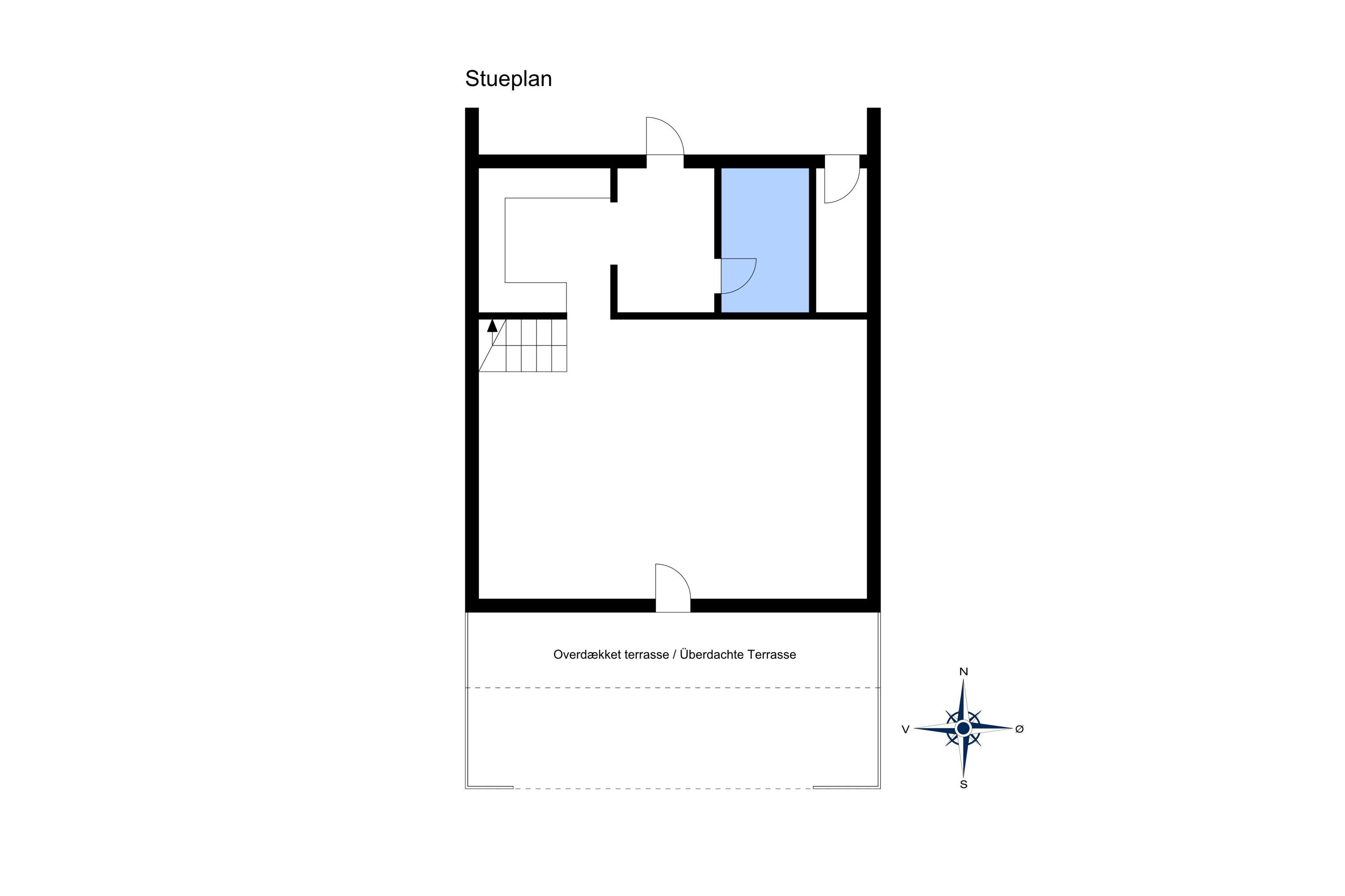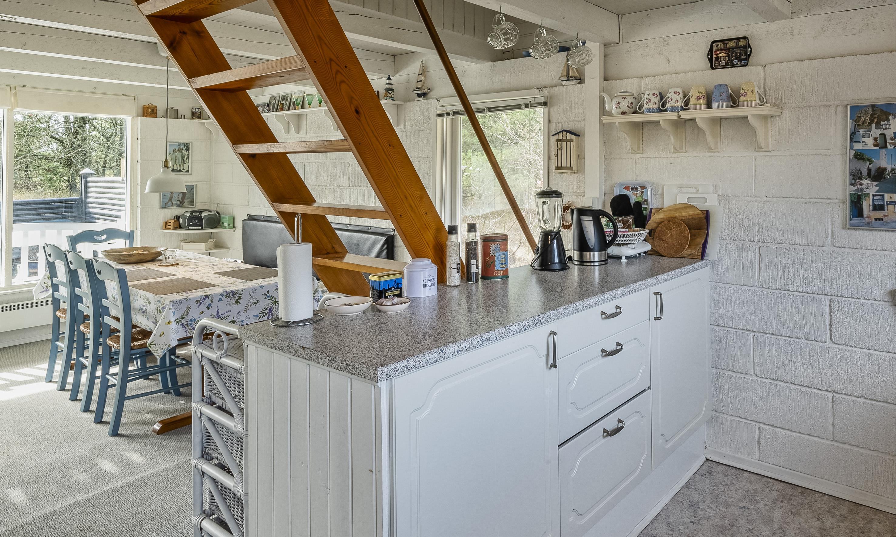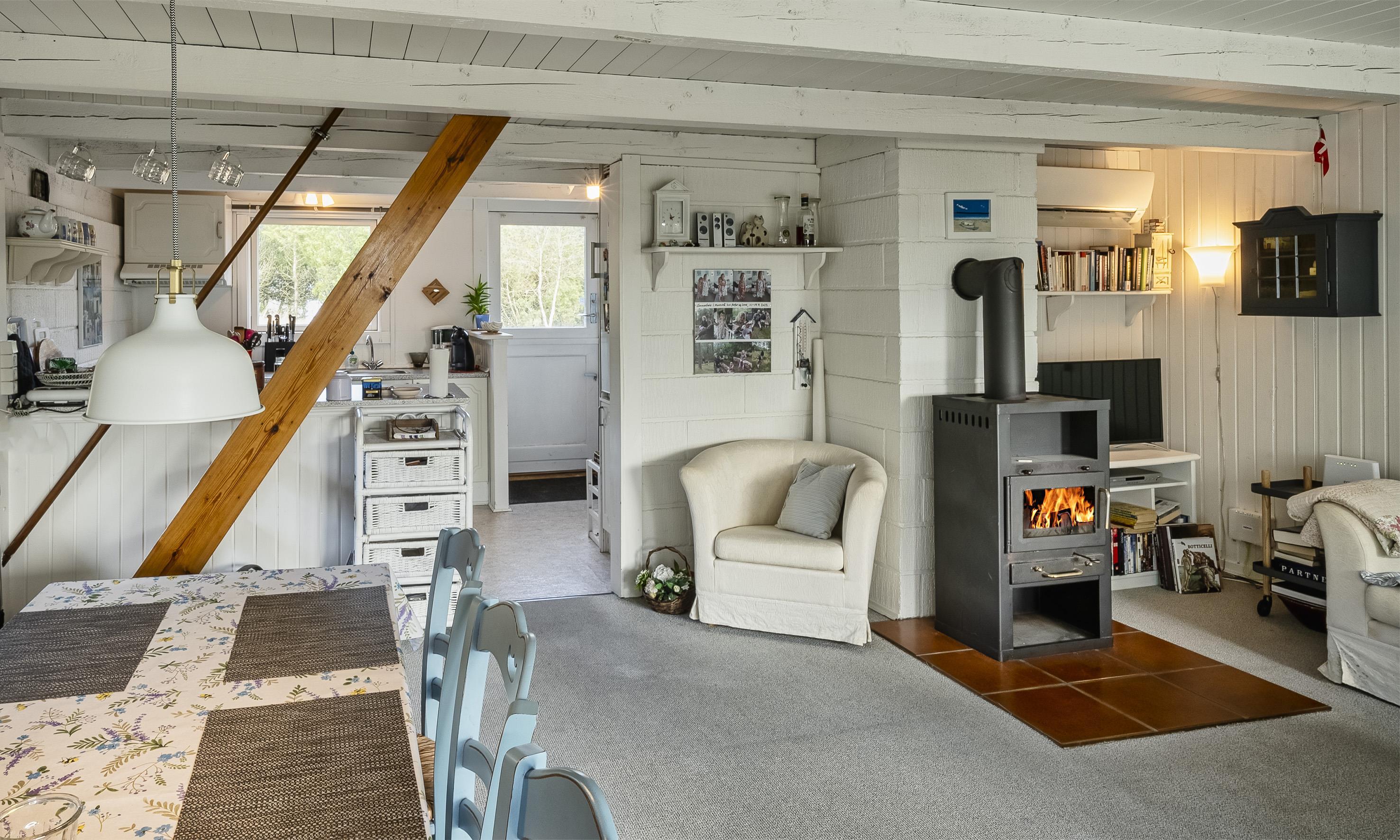I stueplan er der køkken i åben forbindelse med spiseplads og stue med energivenlig varmepumpe og brændeovn samt udgang til terrassen. Badeværelse med bruser. Bemærk der er ikke TV pakke. Programmer kan alene streames via egen PC med kabel.