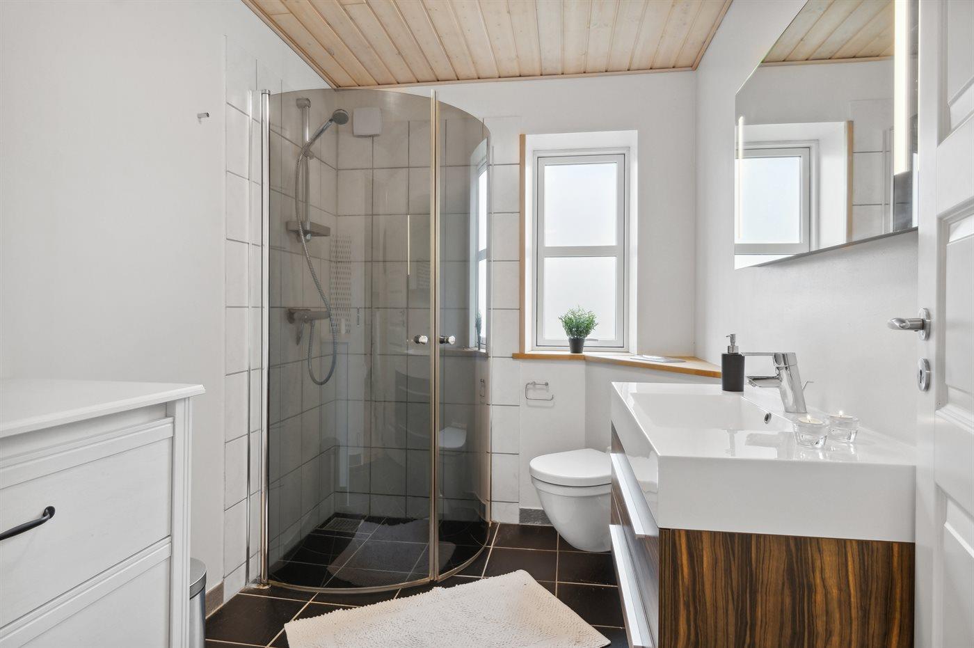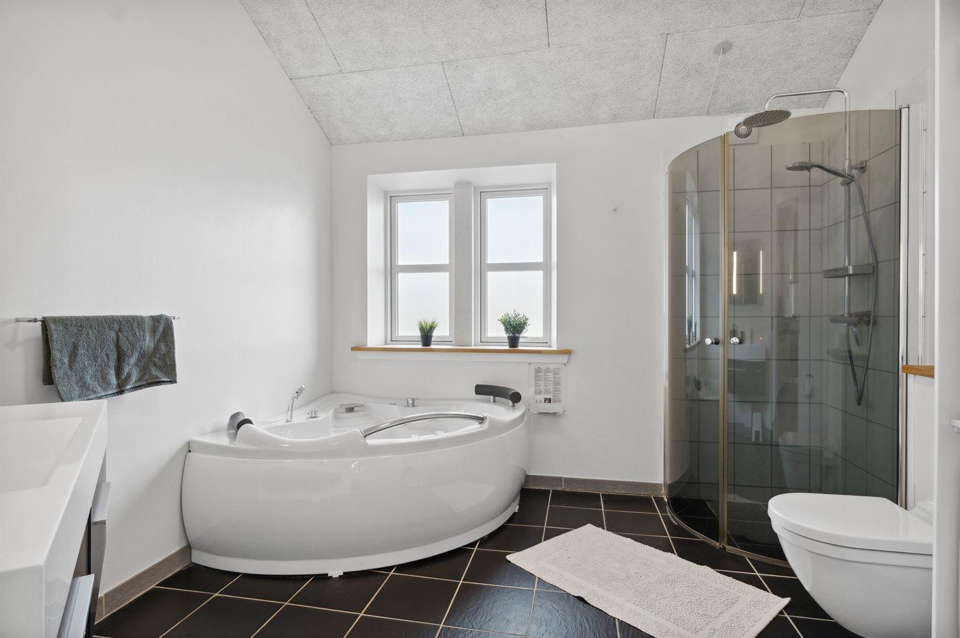 Der er 2 badeværelser med bruseniche og 2 toiletter. Der er gulvvarme på 2 badeværelser.