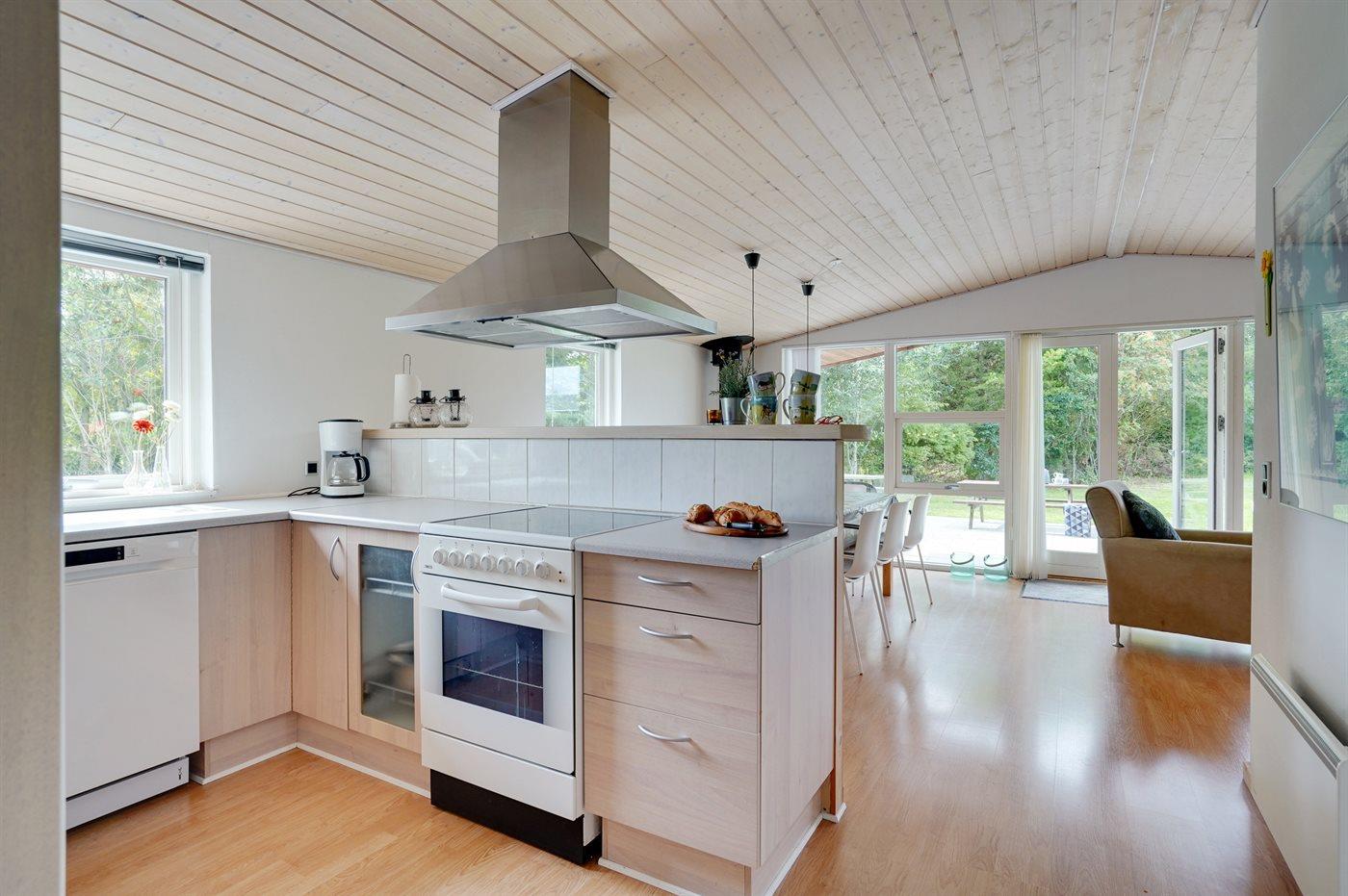 Køkkenet er udstyret med 1 køleskab. Der er 4 keramiske kogeplader, varmluftovn, mikrobølgeovn samt opvaskemaskine.