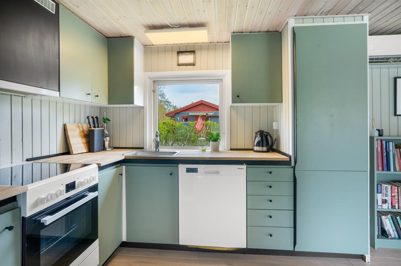 Køkkenet er udstyret med 1 køleskab. Der er 4 keramiske kogeplader, varmluftovn samt opvaskemaskine.