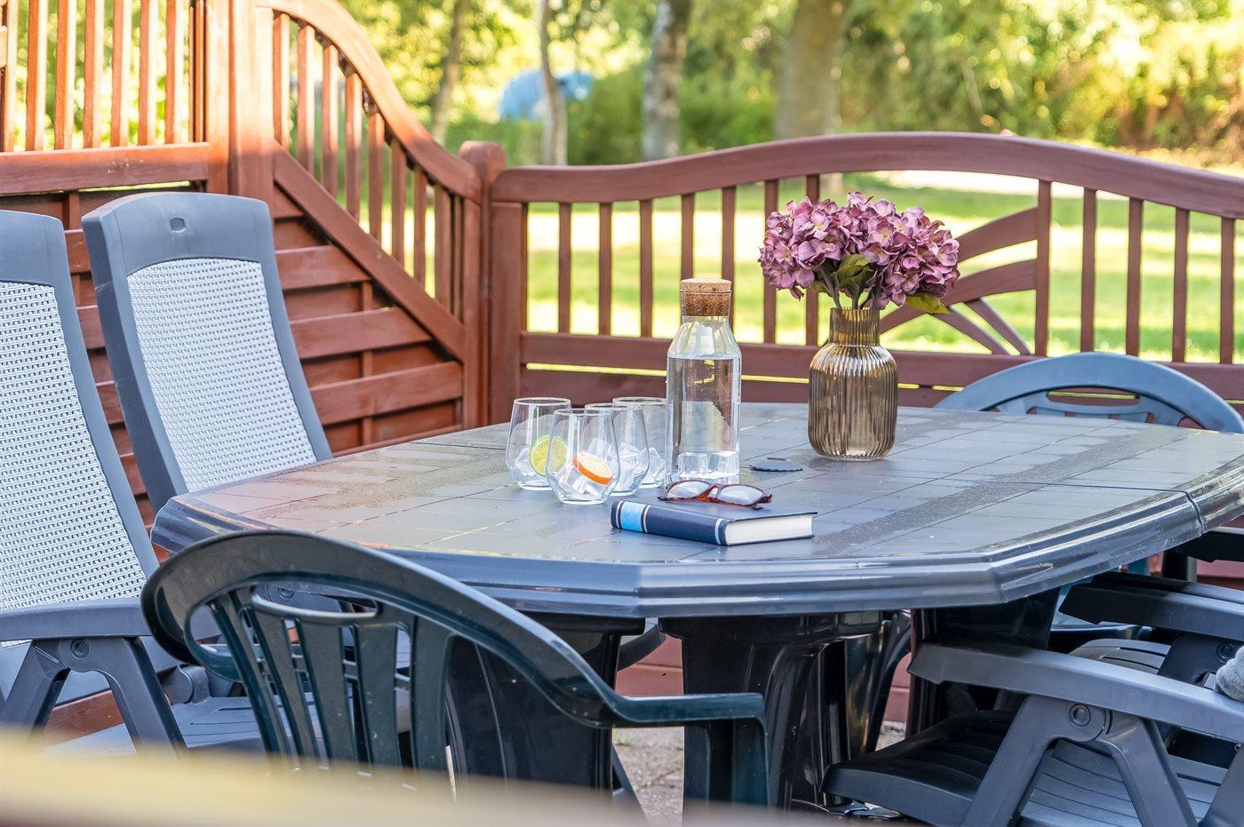 Ferieboligen er beliggende på en 1580 m² stor havegrund. Der er 6400 m til havet. Der er 400 m til fjorden. Der er en golfbane i en afstand af 9000 m. Til ferieboligen hører åbent terrasseareal. Desuden er der overdækket terrasse. Fodboldmål. Bålsted. Grill til rådighed. Parkering ved ferieboligen.