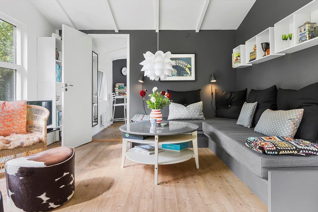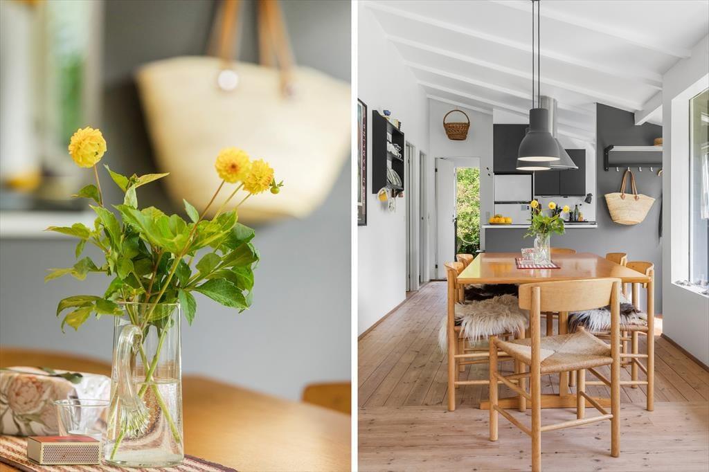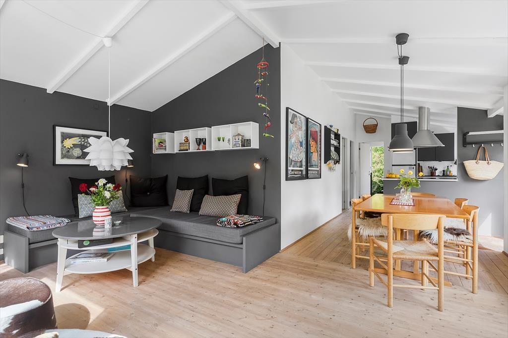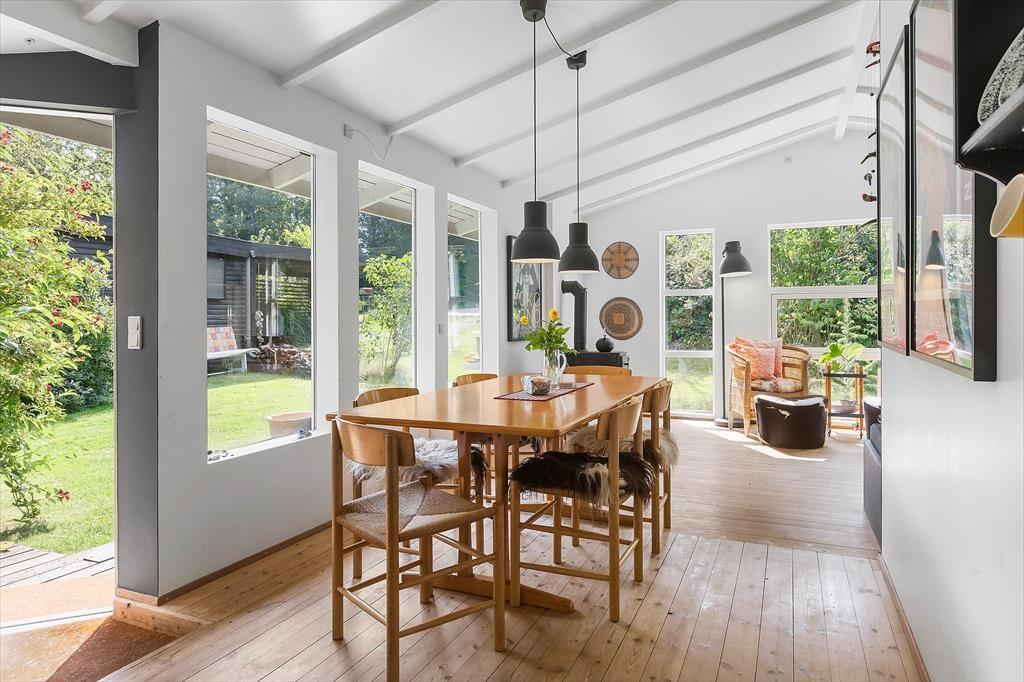 Dette skønne sommerhus i Munkerup byder på en lys og indbydende atmosfære, hvor åbenhed og hygge går hånd i hånd. Huset er indrettet med et rummeligt opholdsområde, hvor stue, spiseplads og køkken smelter sammen og skaber den perfekte ramme for samvær. De store vinduer lader dagslyset strømme ind og giver en fantastisk udsigt over den kuperede have.