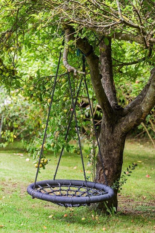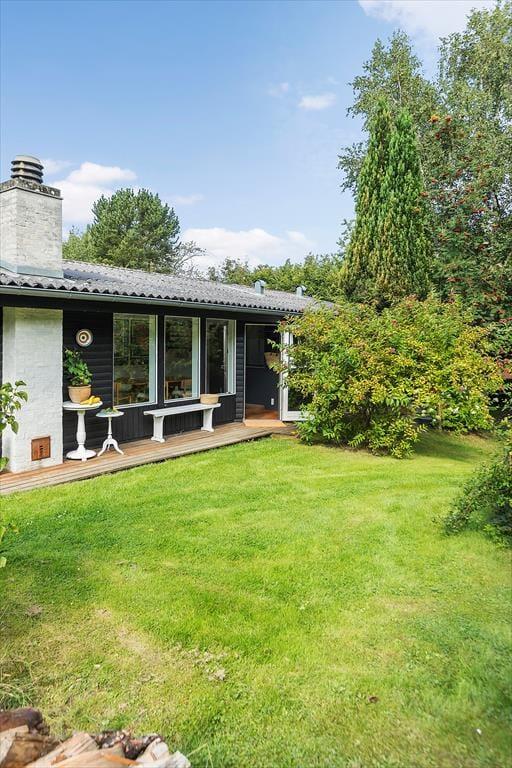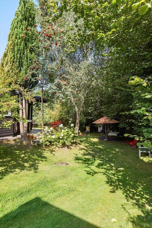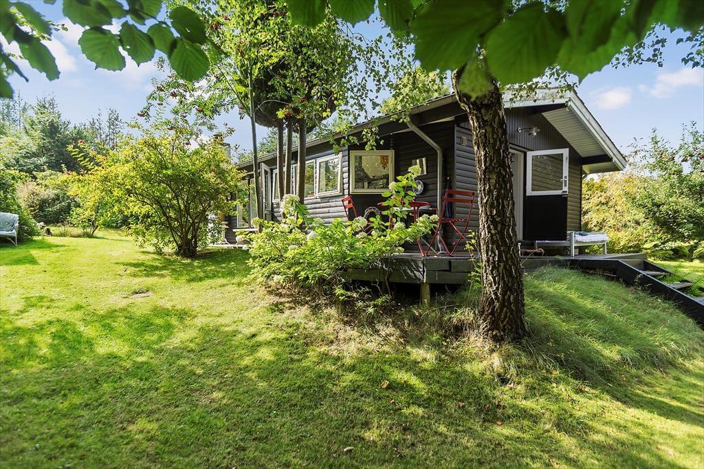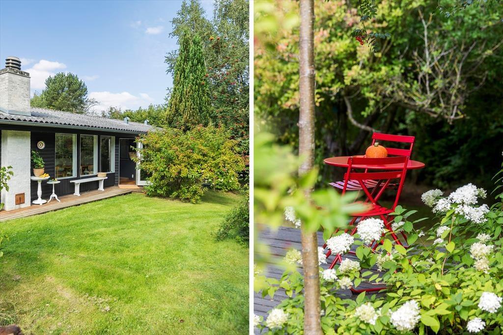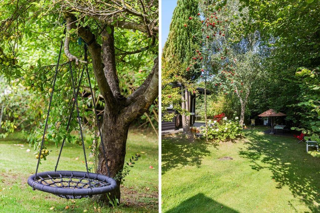 Haven er smukt kuperet, og huset ligger højt på grunden, hvilket skaber en fornemmelse af ro og privatliv. Her er der rig mulighed for at nyde naturen, hvad enten du vil slappe af på terrassen eller lade børnene lege i haven. De yngste gæster vil elske legehuset og trampolinen, hvor de kan bruge timer på sjov og leg.