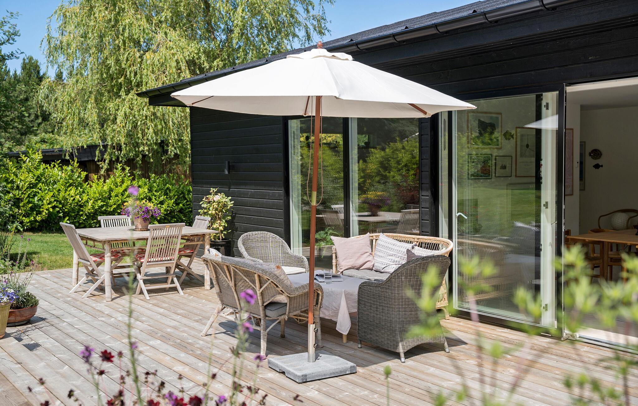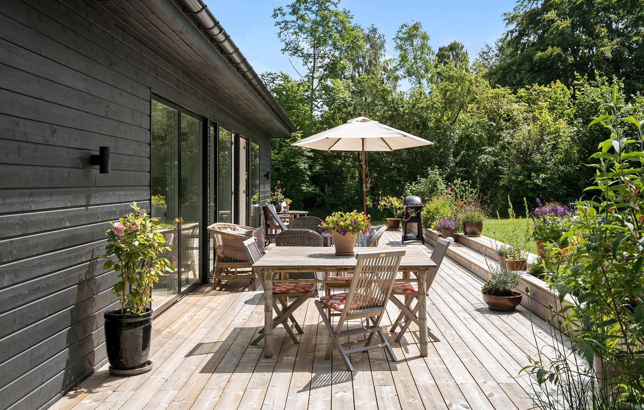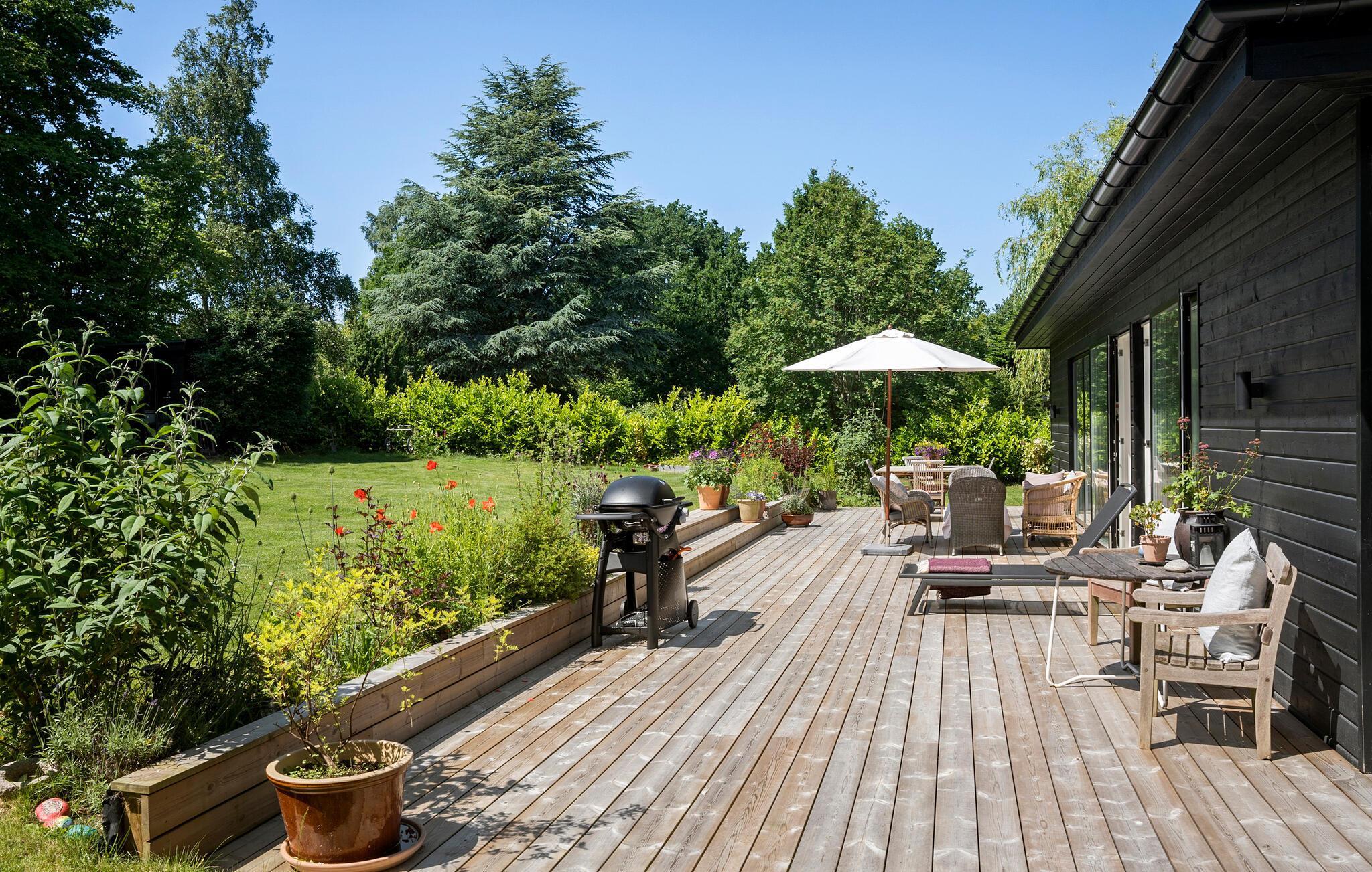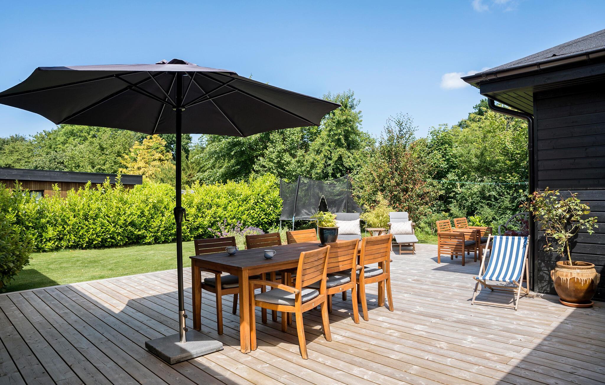 Huset har terrasser på begge sider, som på de varme dage nærmest gør huset dobbelt så stort. Find sol, skygge og læ efter behov, mens I hygger jer med et krydsord, strikketøjet eller en god podcast. Alt imens kan I holde øje med børnene, der løber rundt og spiller bold i haven eller giver den gas på trampolinen.